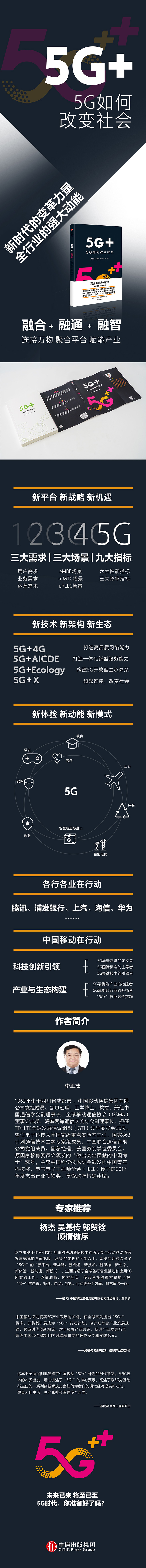 这本书深刻地诠释了中国移动“5G+”计划的时代意义,从5G技术的本源出发,着力讲述了“5G+”的核心要素,阐述了以5G为基础衍生出的一系列创新解决方案如何为我们的现代经济提供新动力,覆盖人们生活、生产和社会治理多个方面。