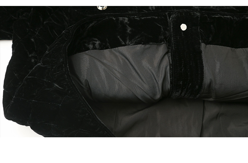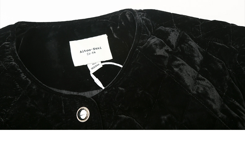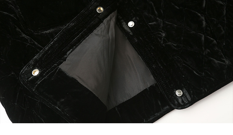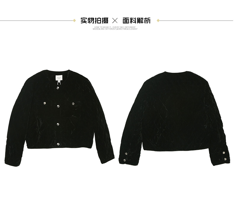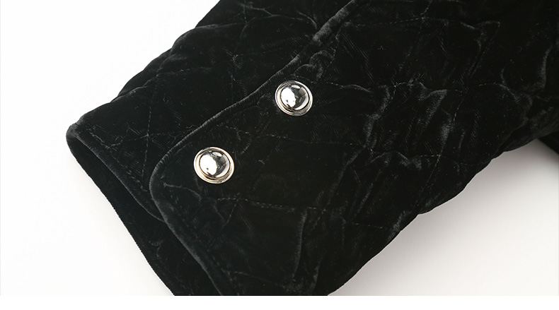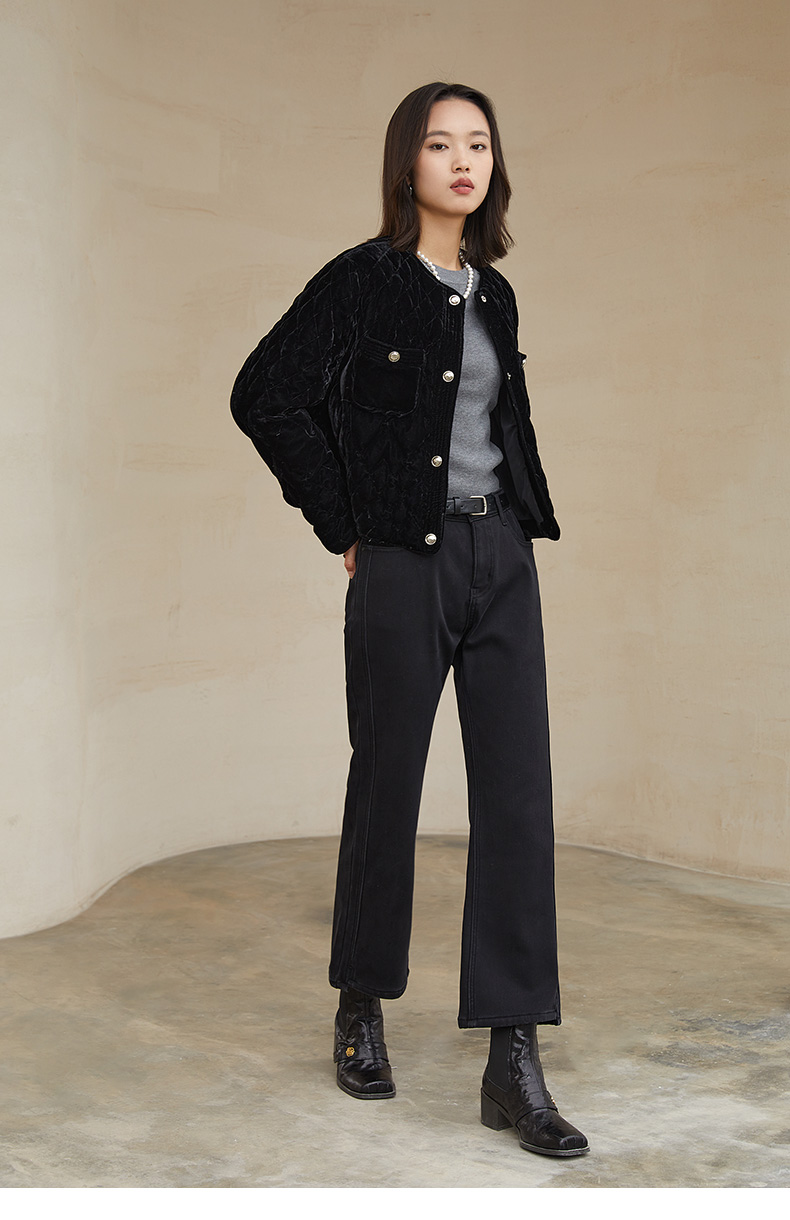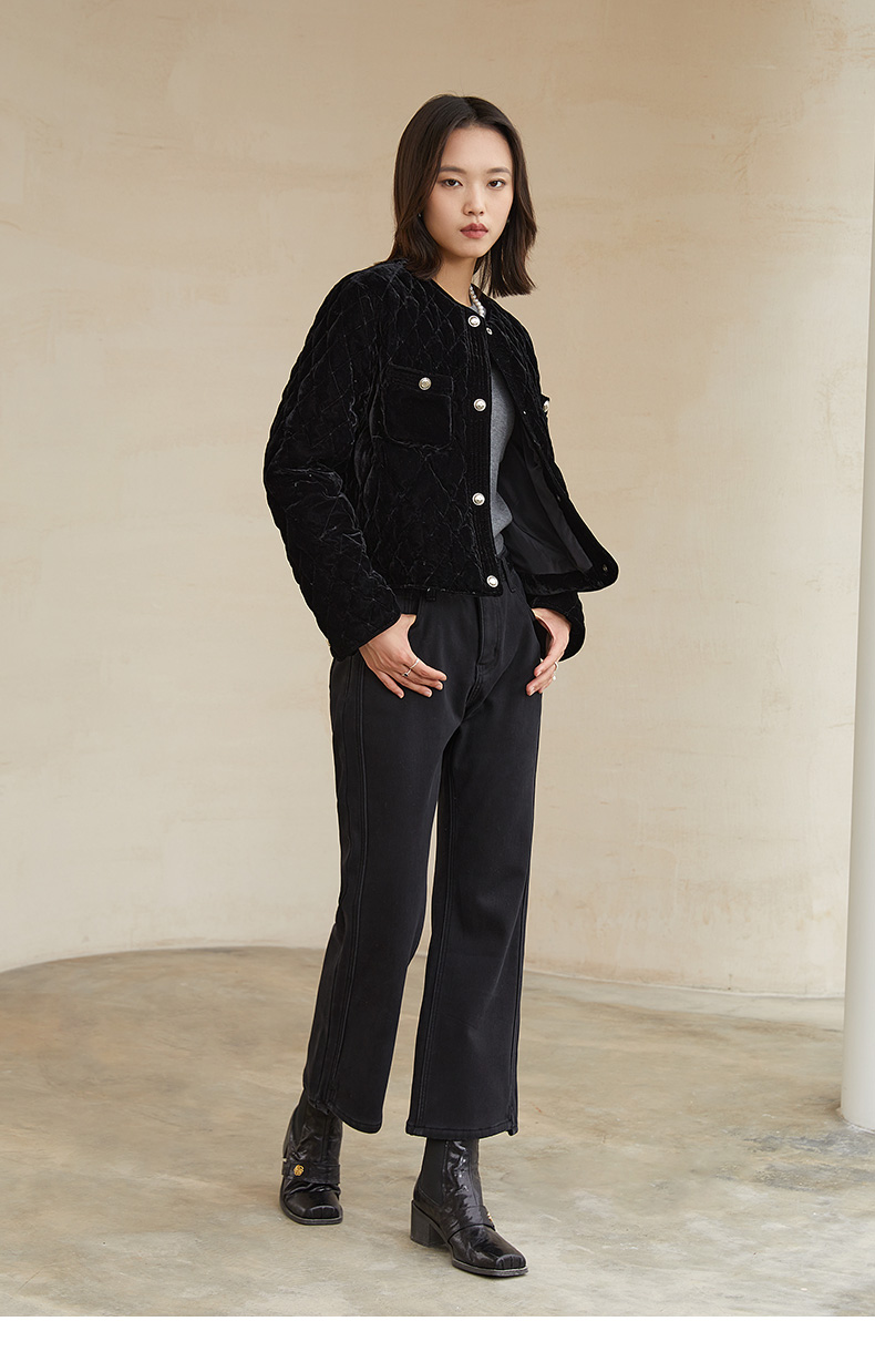 黑色丝绒菱格绗缝短款外套 圆领金属纽扣双口袋修身显瘦秋冬复古轻奢气质通勤保暖上衣
