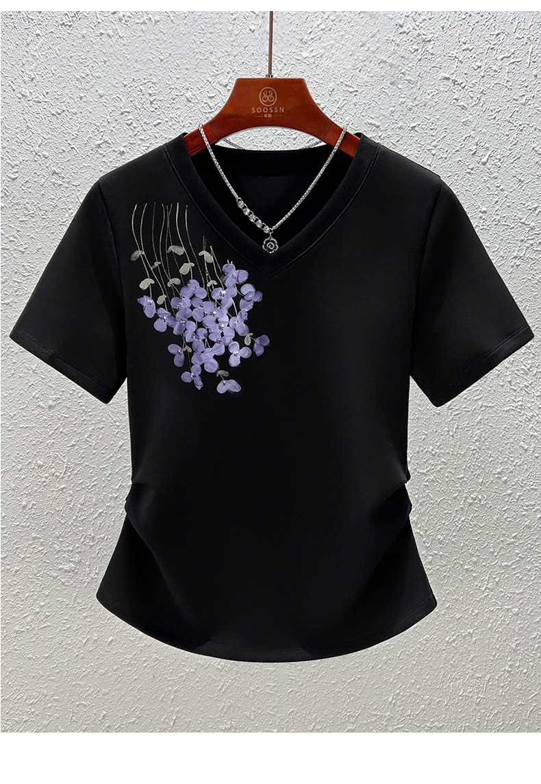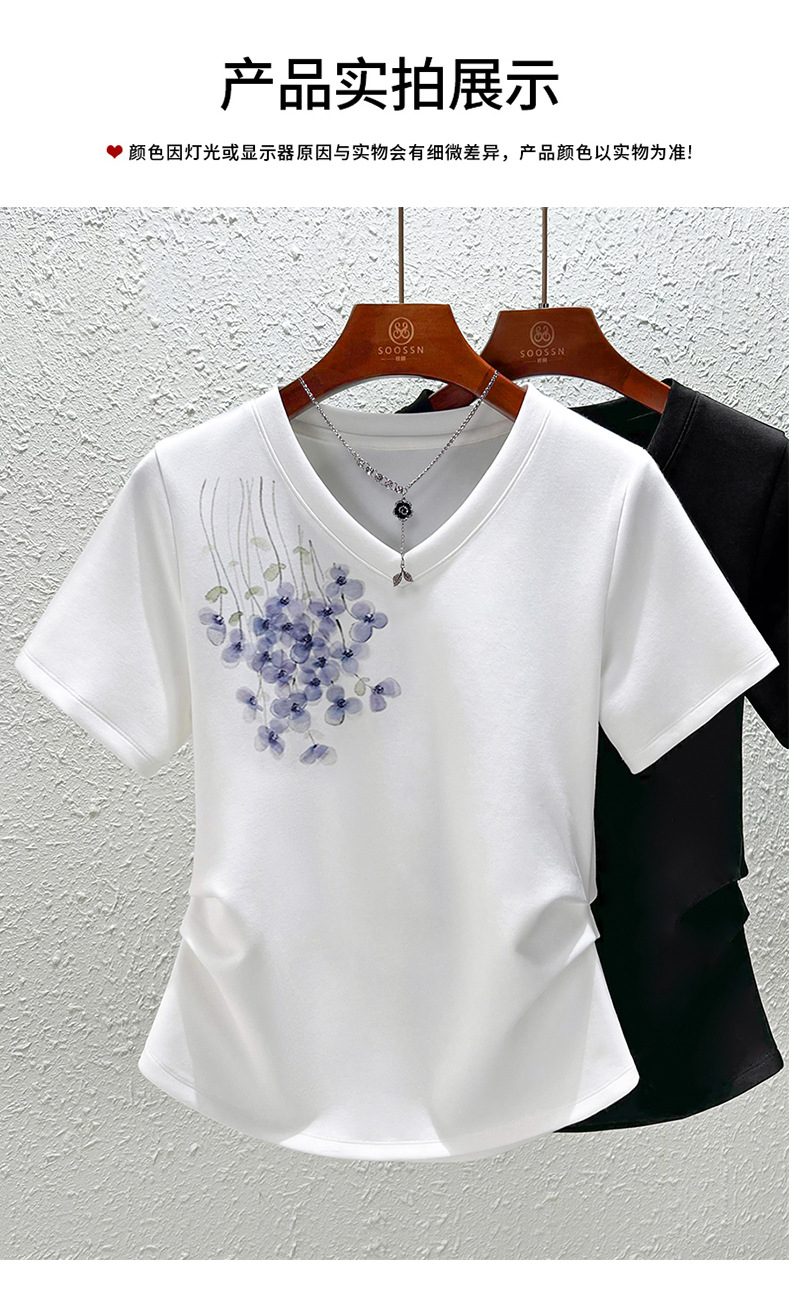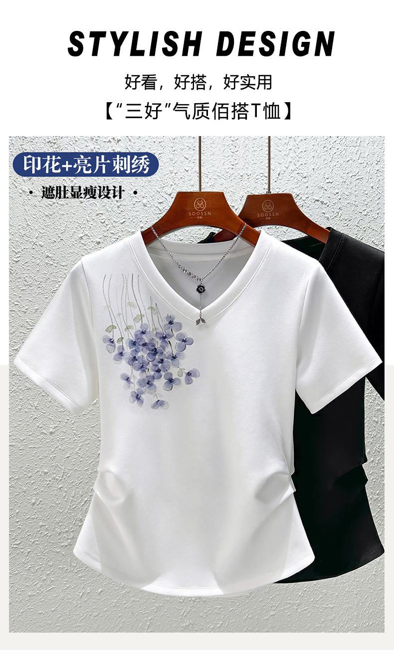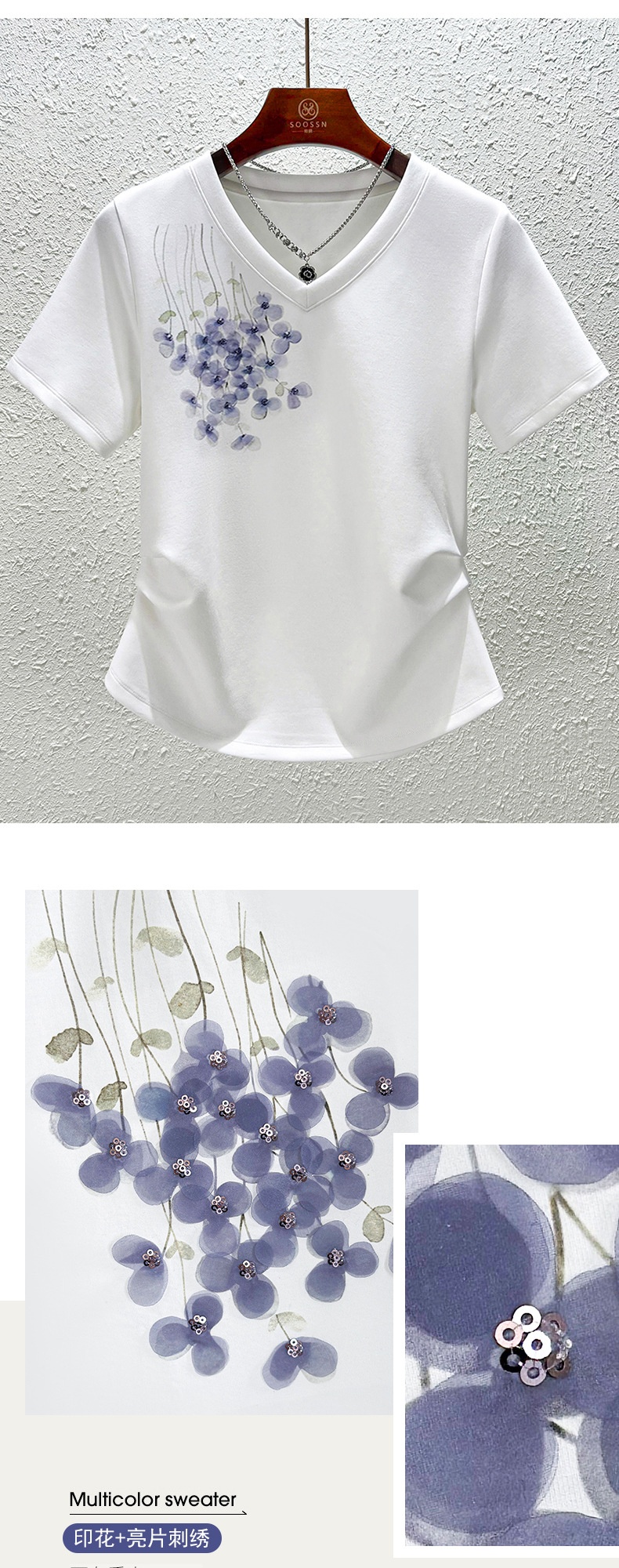 「自」全新升级【铂金会员109/天猫149/差价40】(10302)洛诗琳时尚印花T恤2025新款夏季百搭通勤亮片刺绣V领上衣女