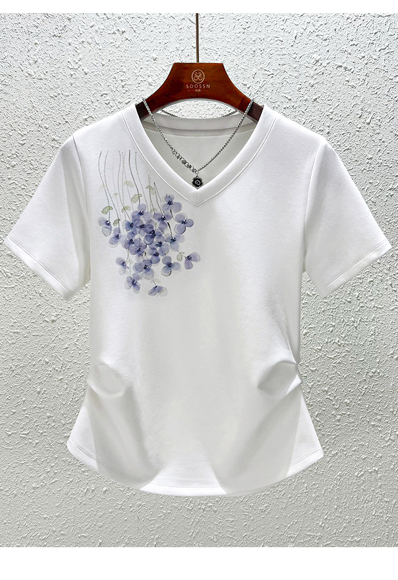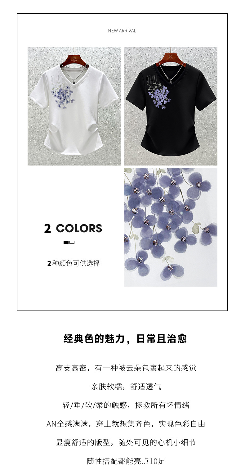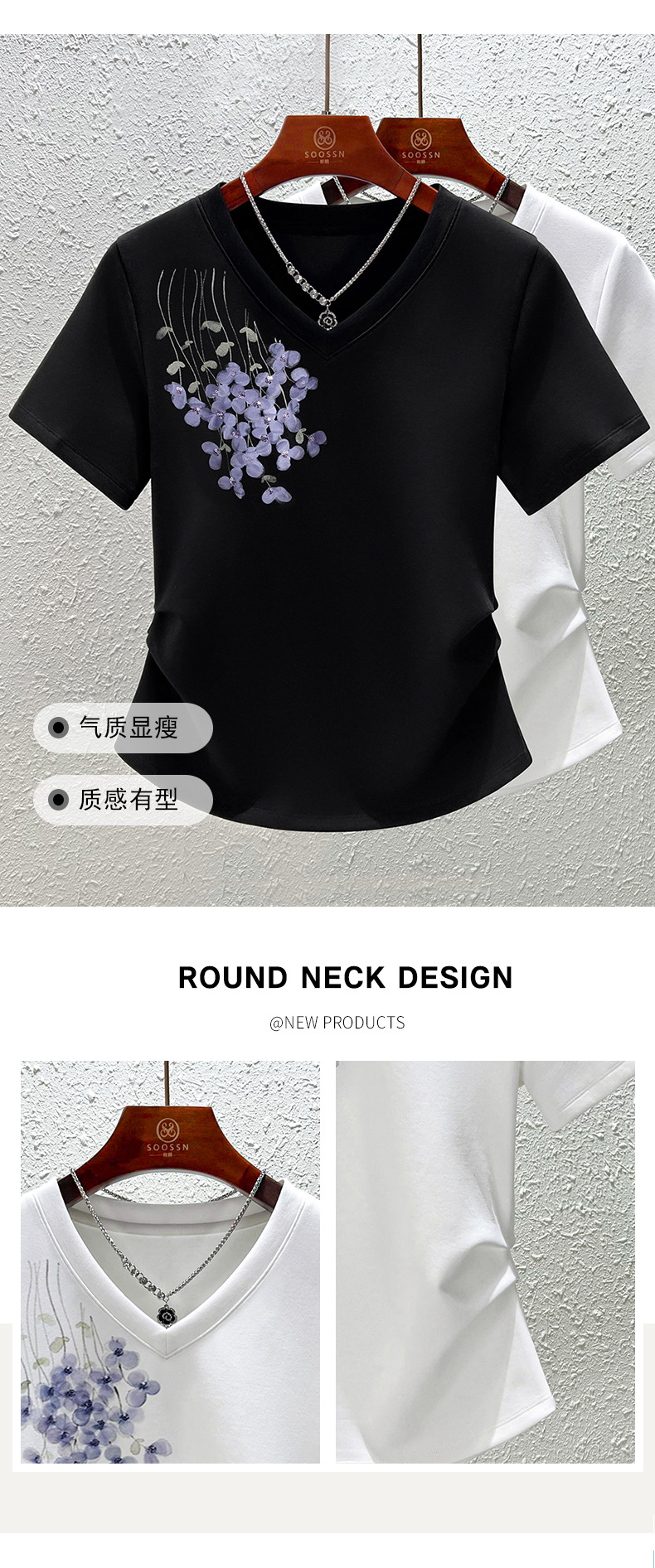 「自」全新升级【铂金会员109/天猫149/差价40】(10302)洛诗琳时尚印花T恤2025新款夏季百搭通勤亮片刺绣V领上衣女