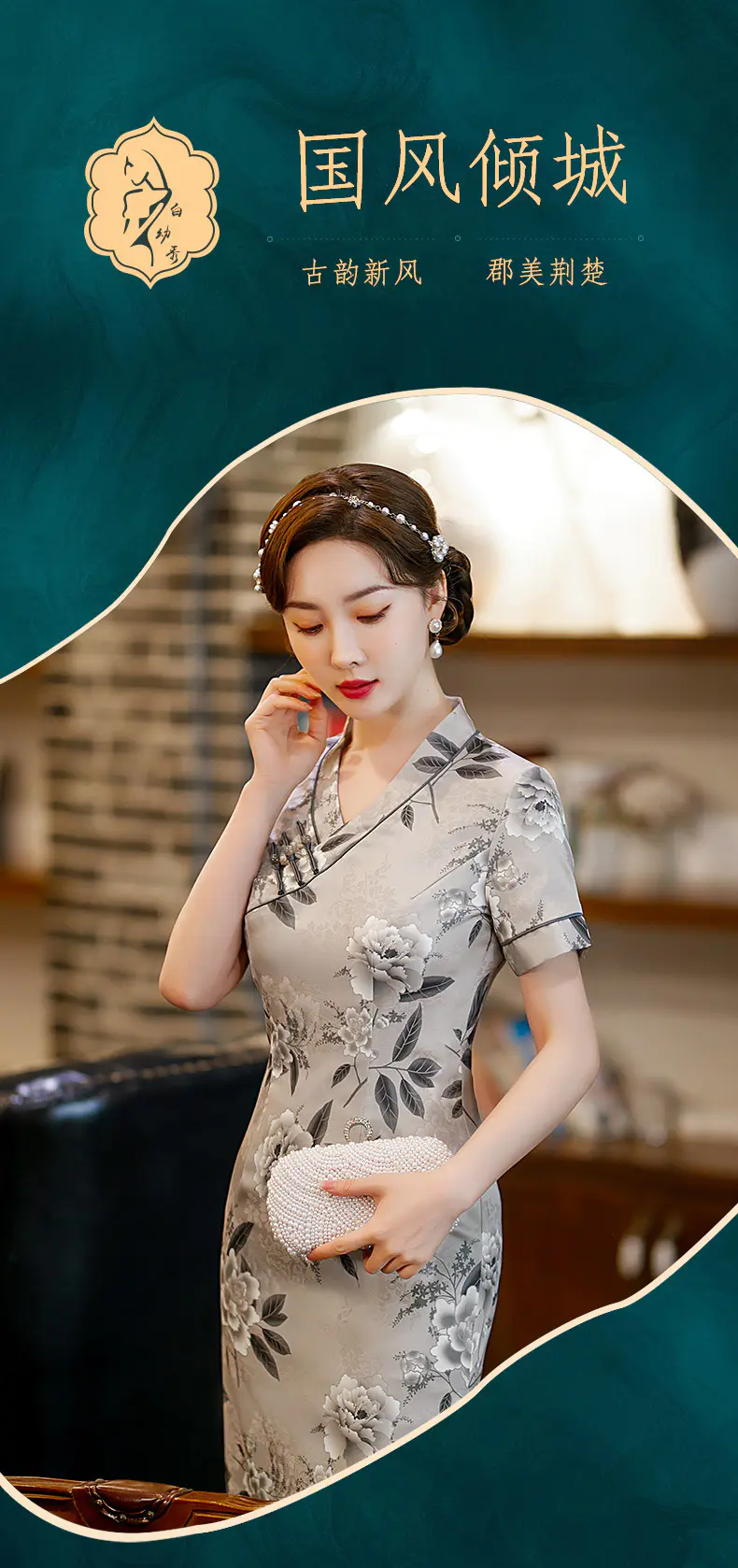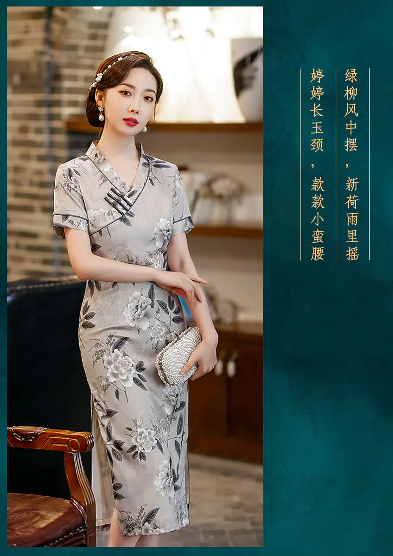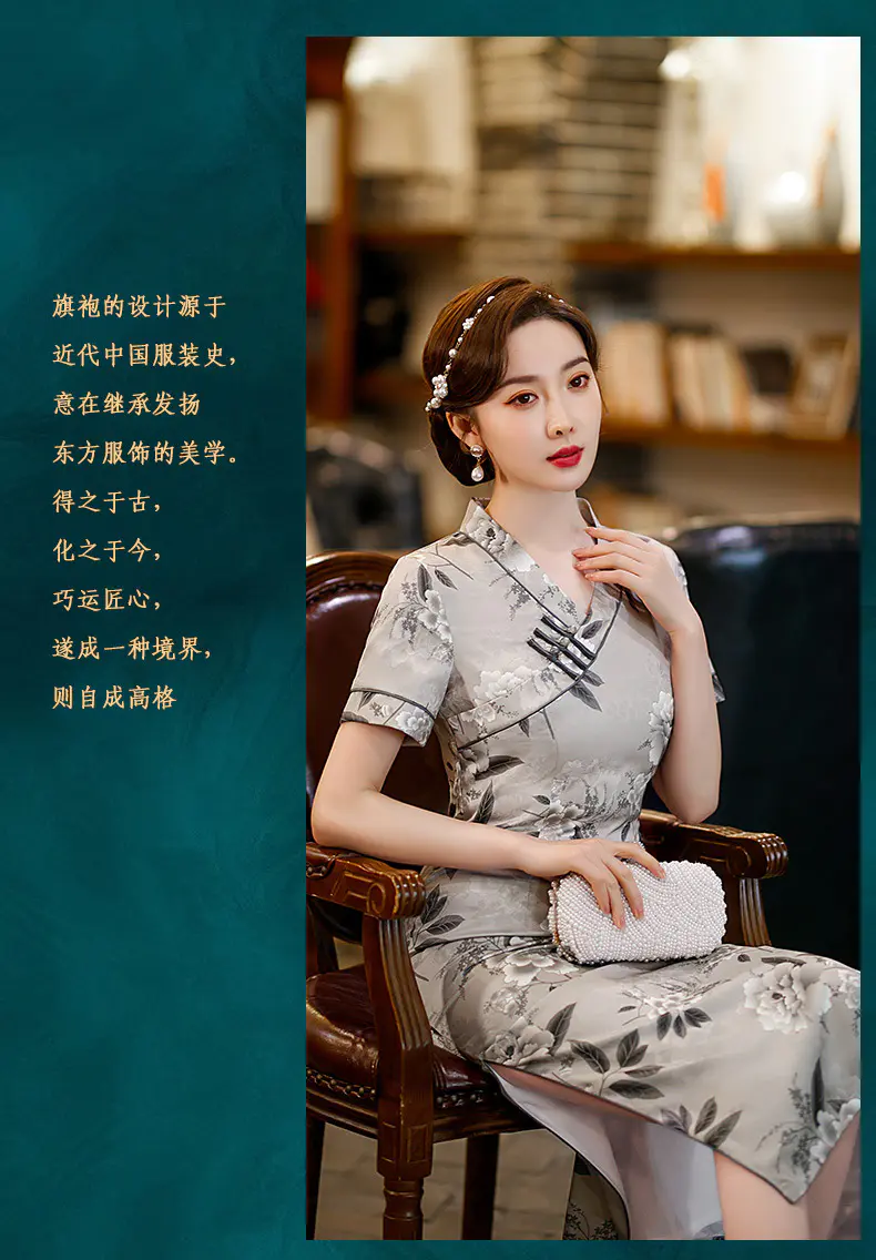 ST-B2049新款灰色水墨修身旗袍中国风V领时尚旗袍短袖礼服