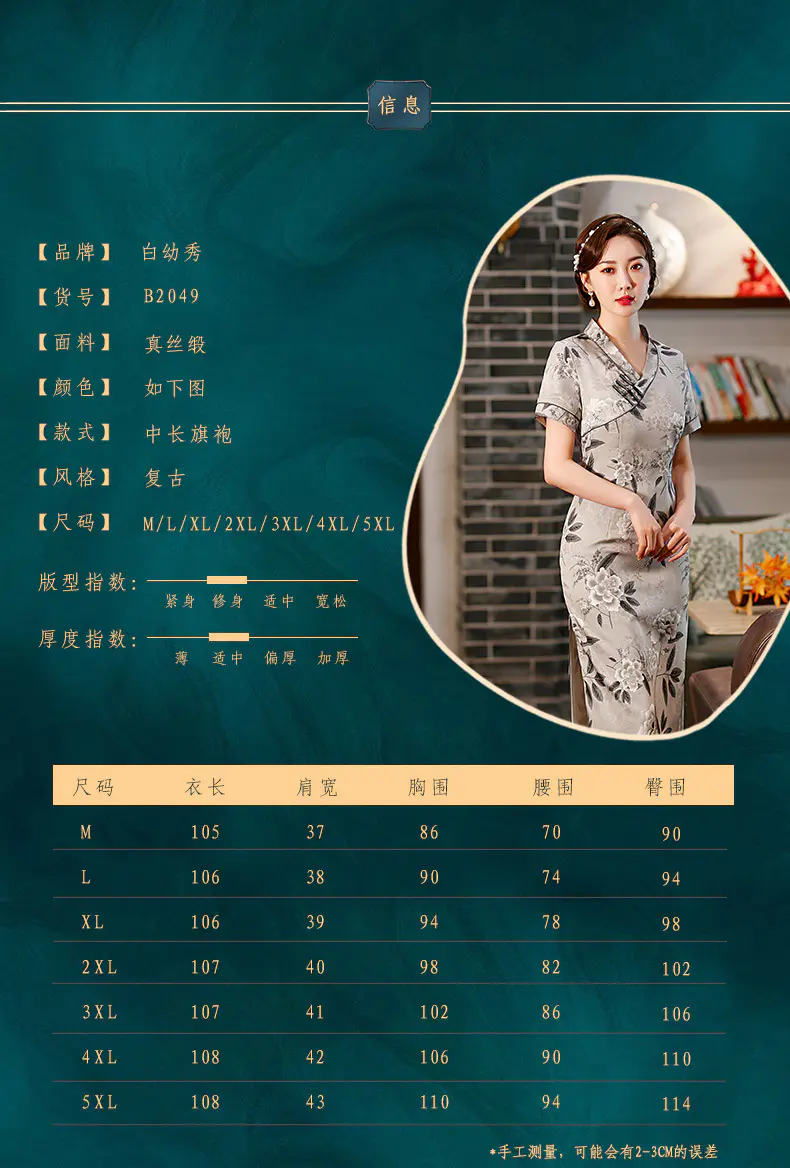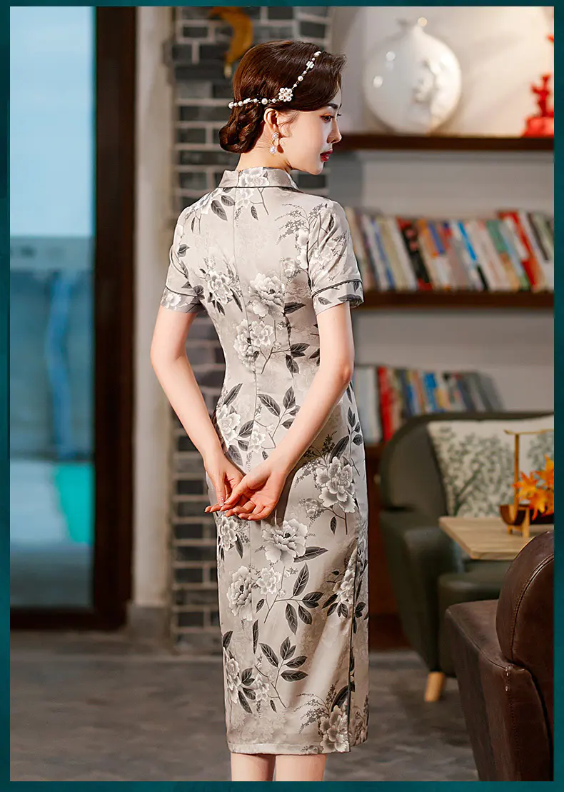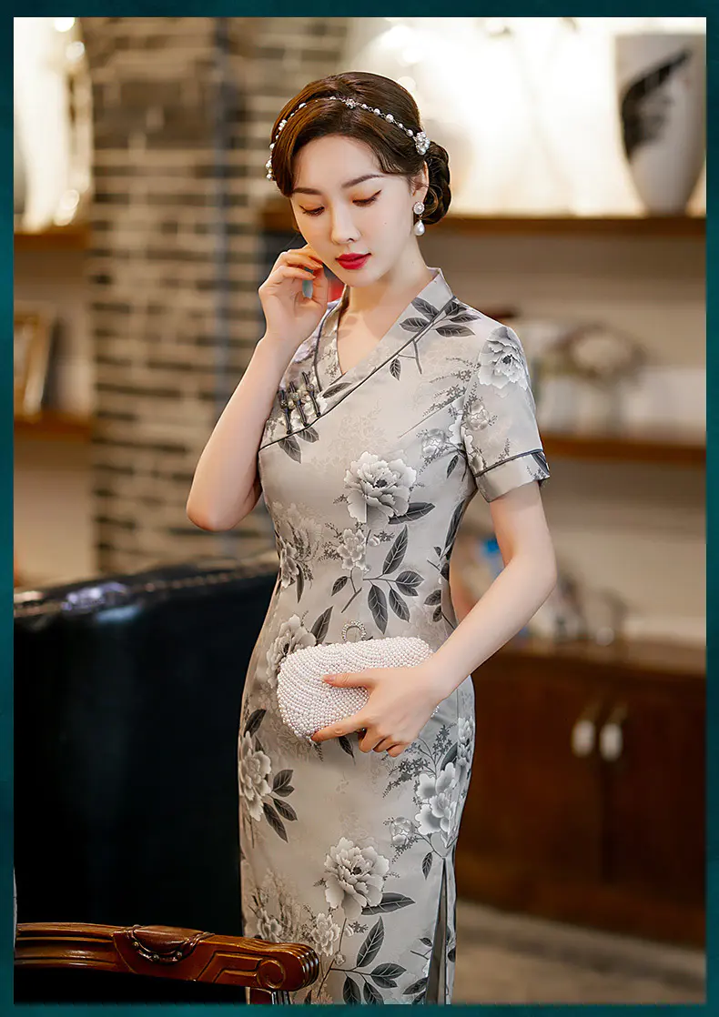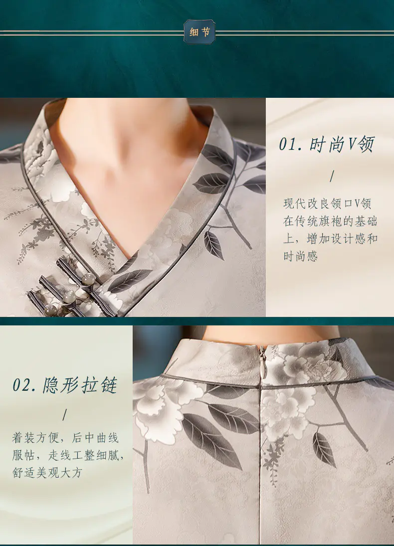 ST-B2049新款灰色水墨修身旗袍中国风V领时尚旗袍短袖礼服
