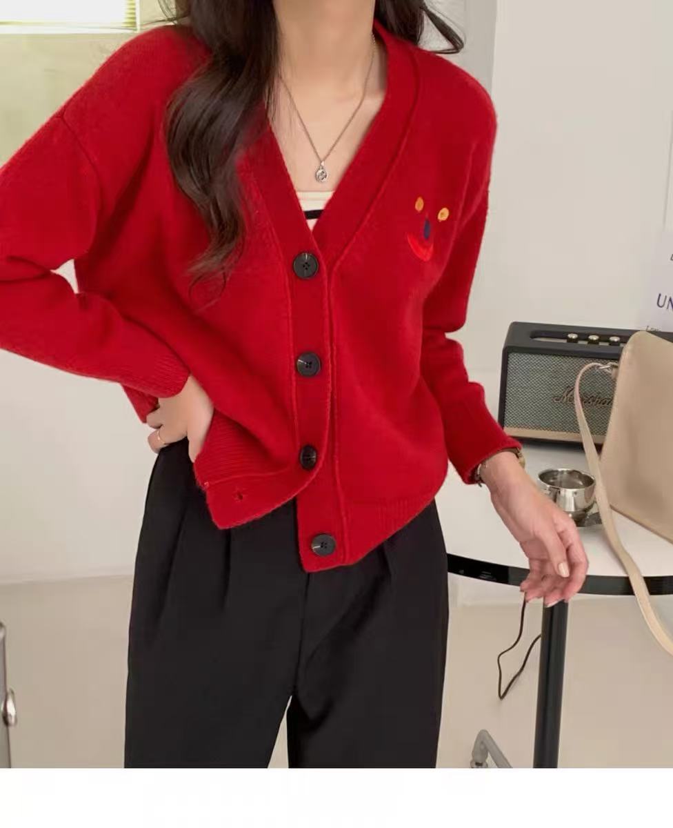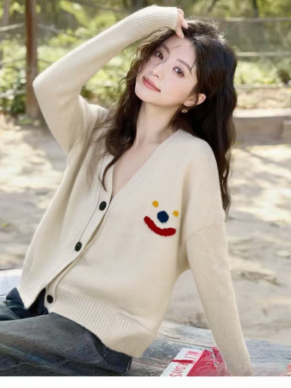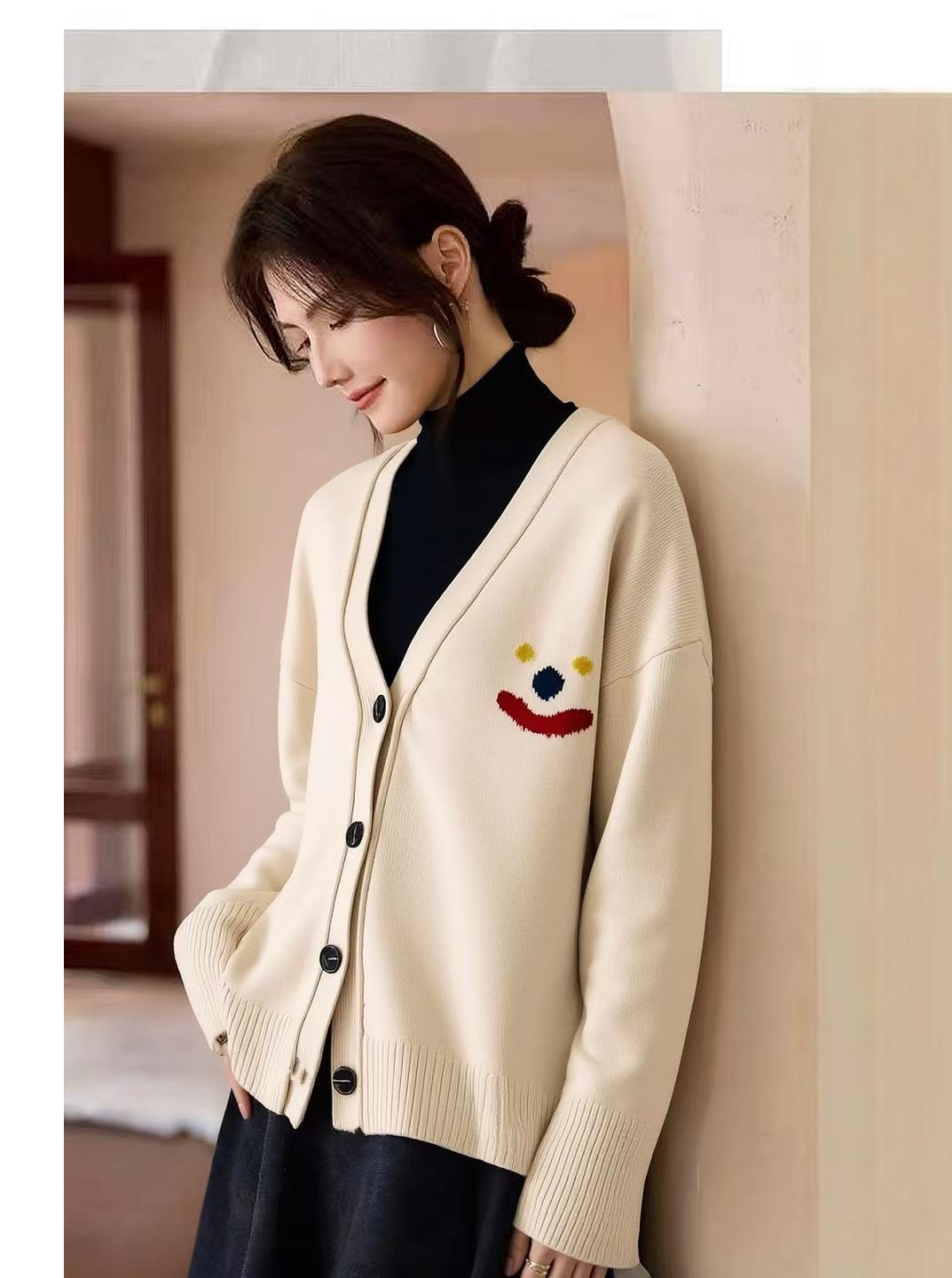 【韩系毛衣】宽松四粒扣笑脸宽松休闲针织毛衣开衫-喜出