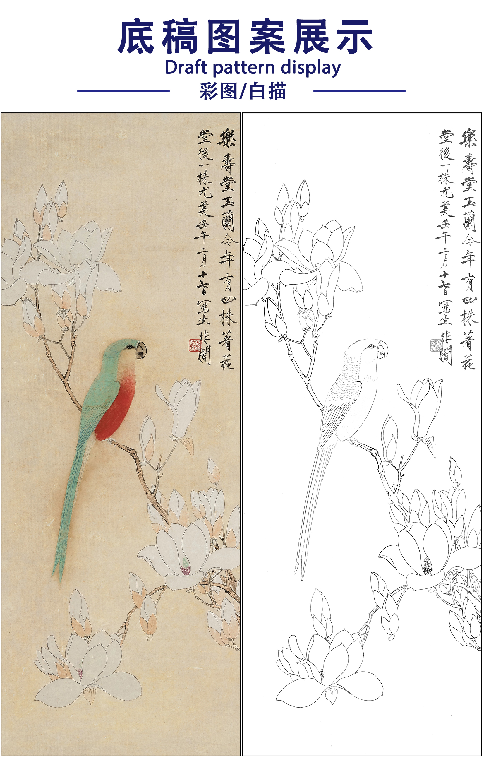 于非闇花鸟工笔画白描底稿《玉兰鹦鹉》临摹勾线高清打印稿FA26