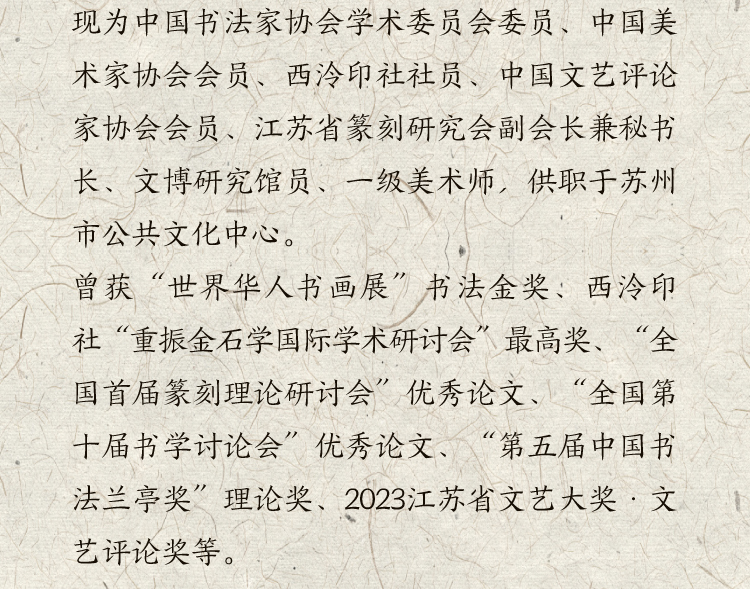 现为中国书法家协会学术委员会委员、中国美术家协会会员、西泠印社社员、中国文艺评论家协会会员、江苏省篆刻研究会副会长兼秘书长、文博研究馆员、一级美术师,供职于苏州市公共文化中心。