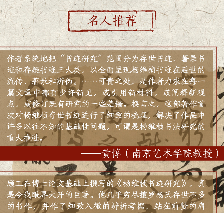 作者系统地把“书迹研究”范围分为存世书迹、著录书迹和存疑书迹三大类,以全面呈现杨维桢书迹在后世的流传、著录和辨伪。……可贵之处,是作者力求在每一篇文章中都有少许新见,或引用新材料,或阐释新观点,或修订既有研究的一些差错。换言之,这部著作首次对杨维桢存世书迹进行了细致的梳理,解决了作品中许多以往不知的基础性问题,可谓是杨维桢书法研究的重大推进。