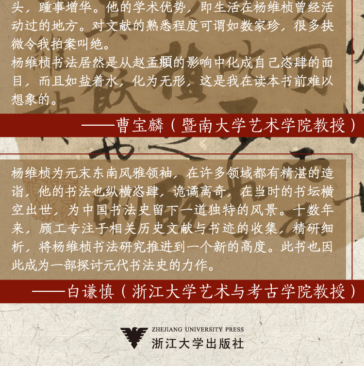 由于杨维桢在元代书法史和元代文化史上的重要地位,本书对元代书法史的研究有重大推进。本书的研究范式,也构建了一种古代名家“书迹研究”的写作样本。