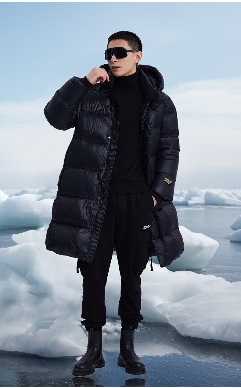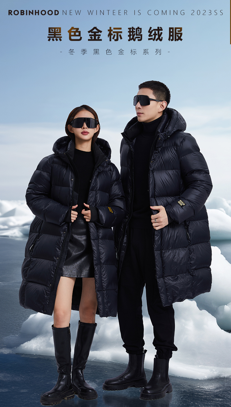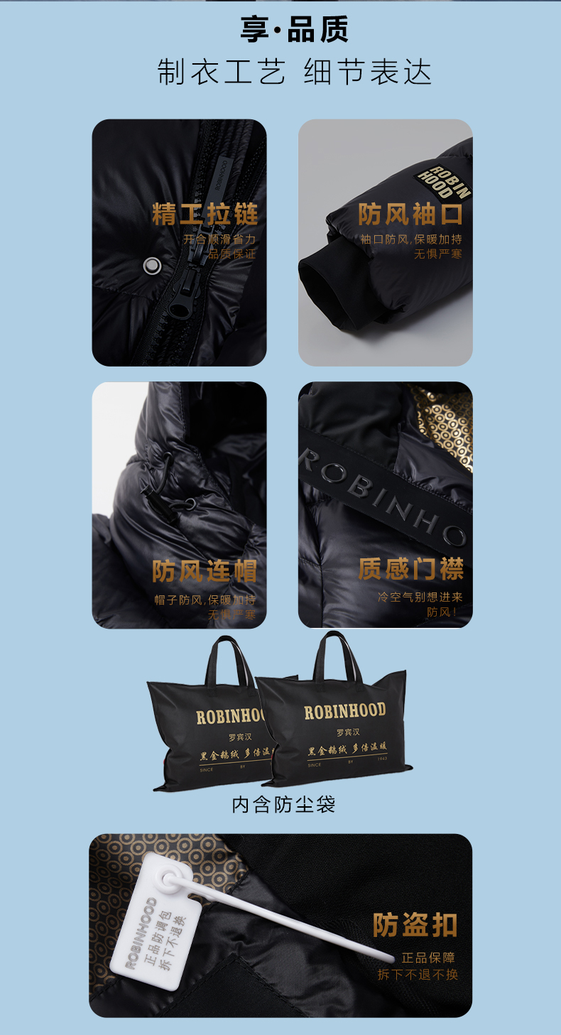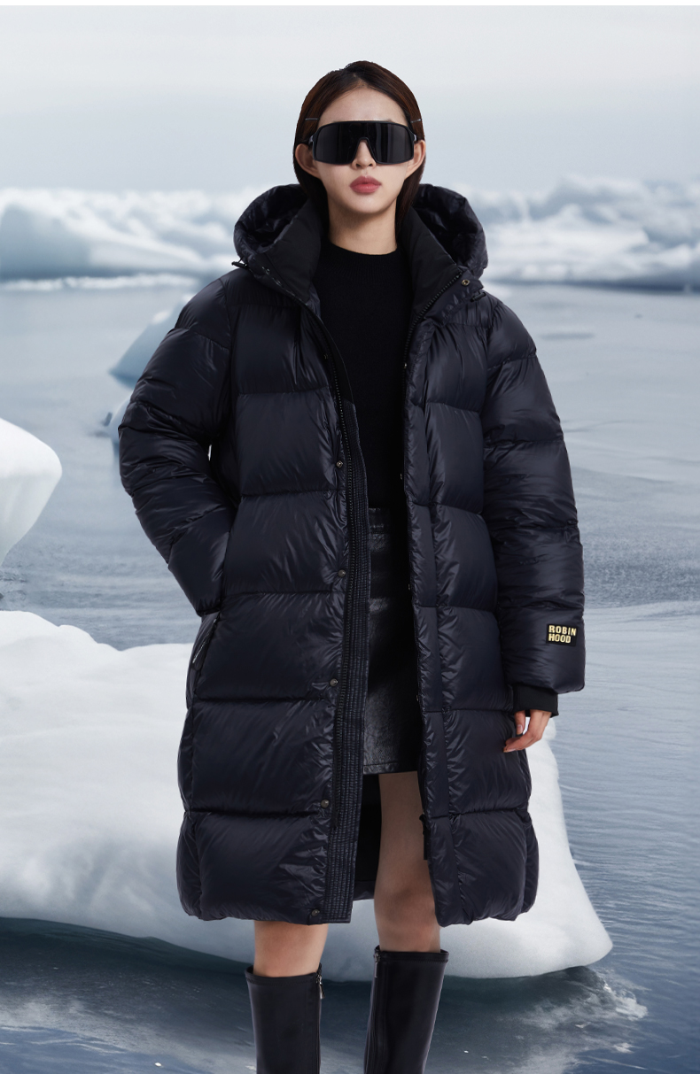 【大朵90白鹅绒 防泼防污抗风 内里石墨烯传热】罗宾汉黑色金标长款鹅绒羽绒服(R038Y61006A)