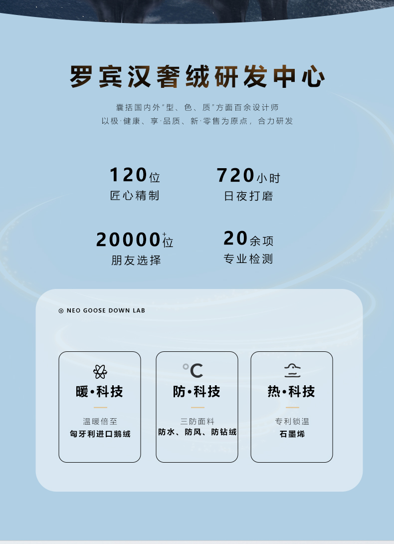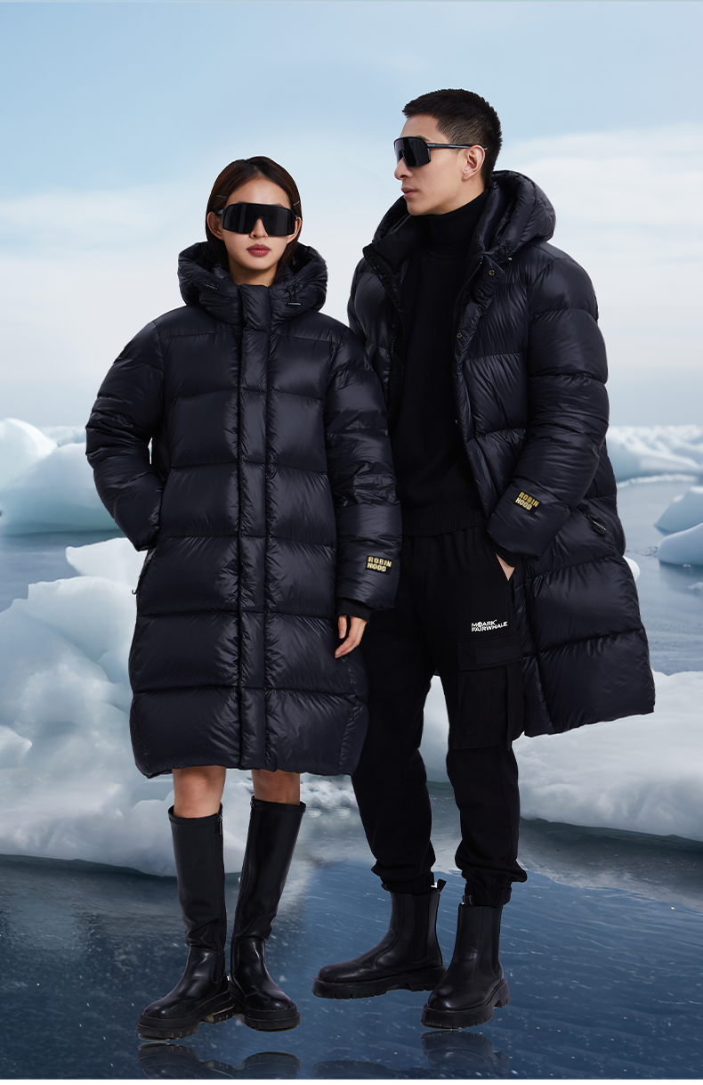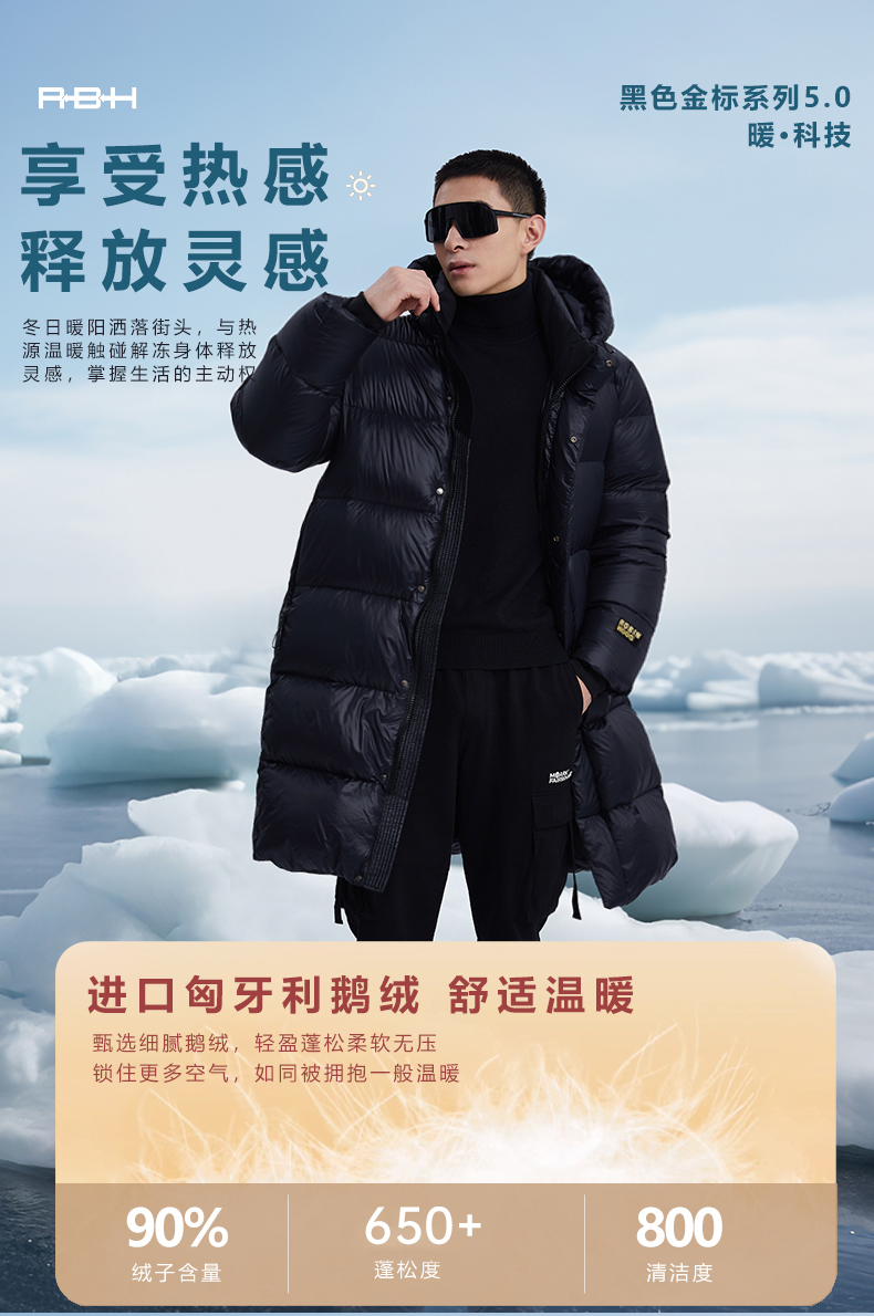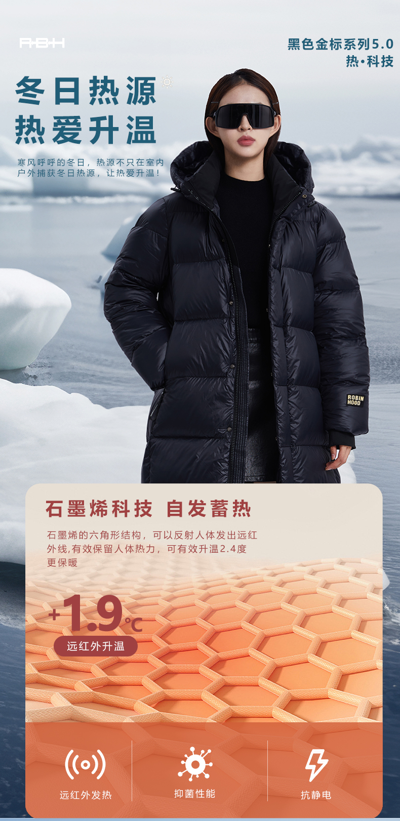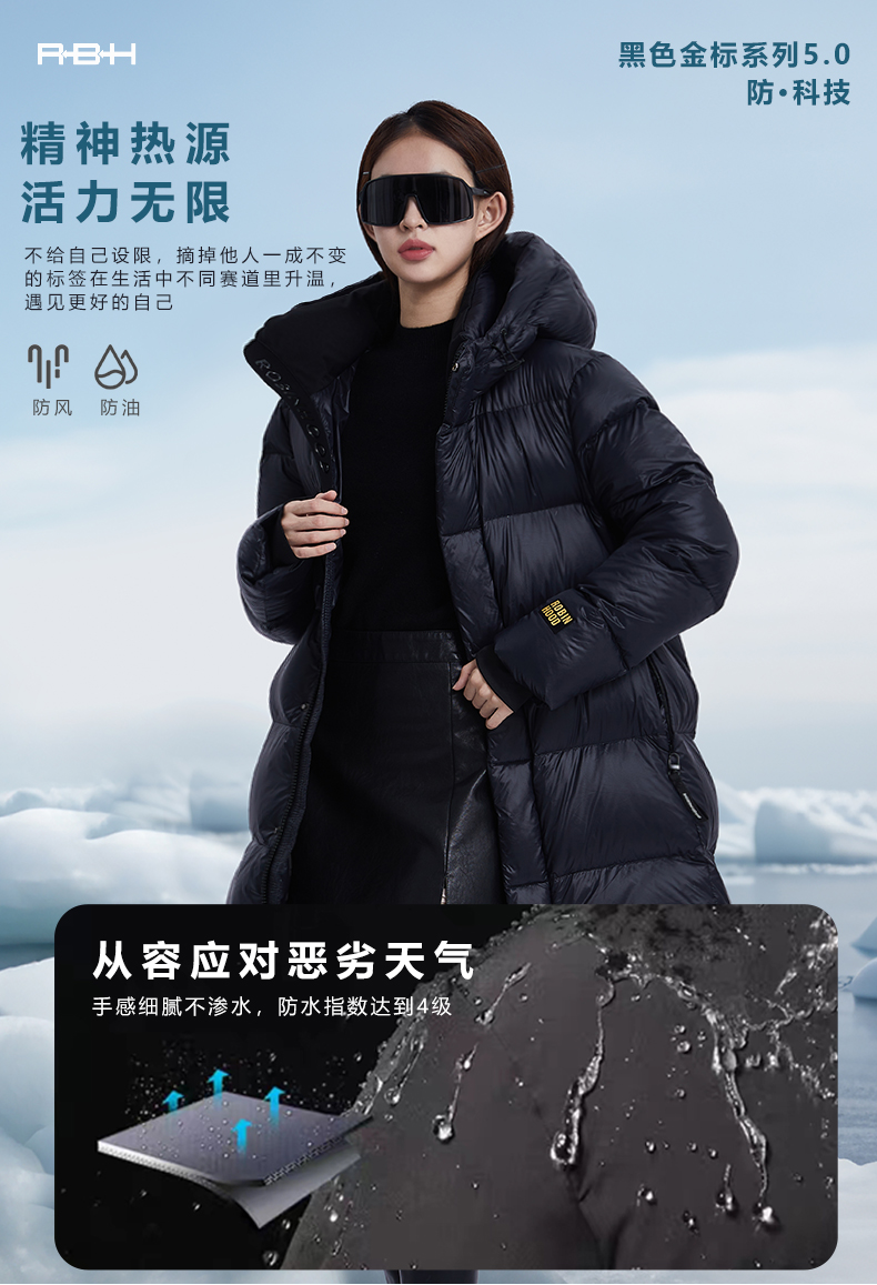 【大朵90白鹅绒 防泼防污抗风 内里石墨烯传热】罗宾汉黑色金标长款鹅绒羽绒服(R038Y61006A)