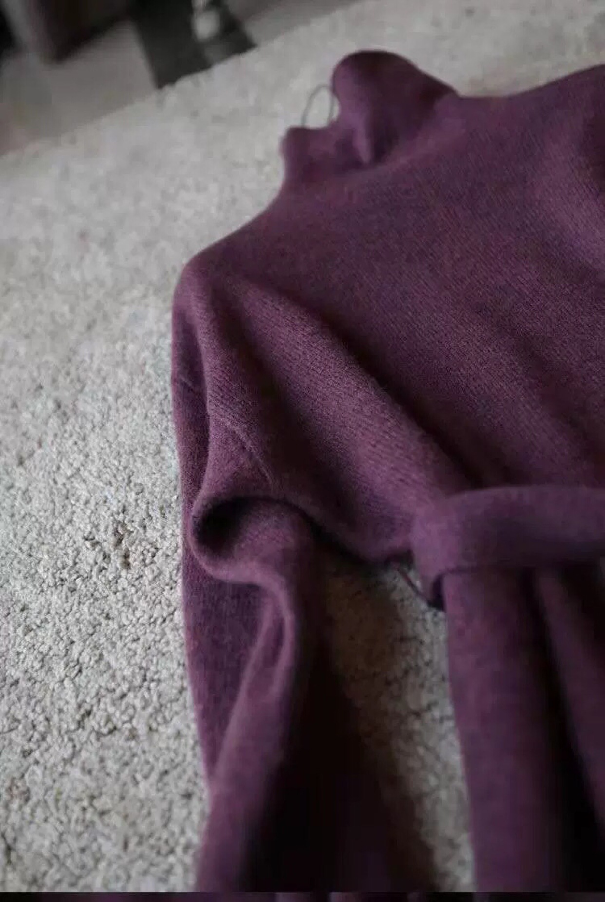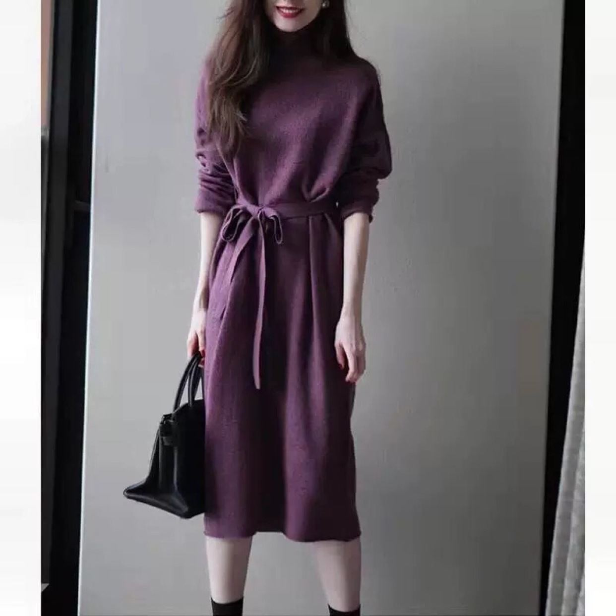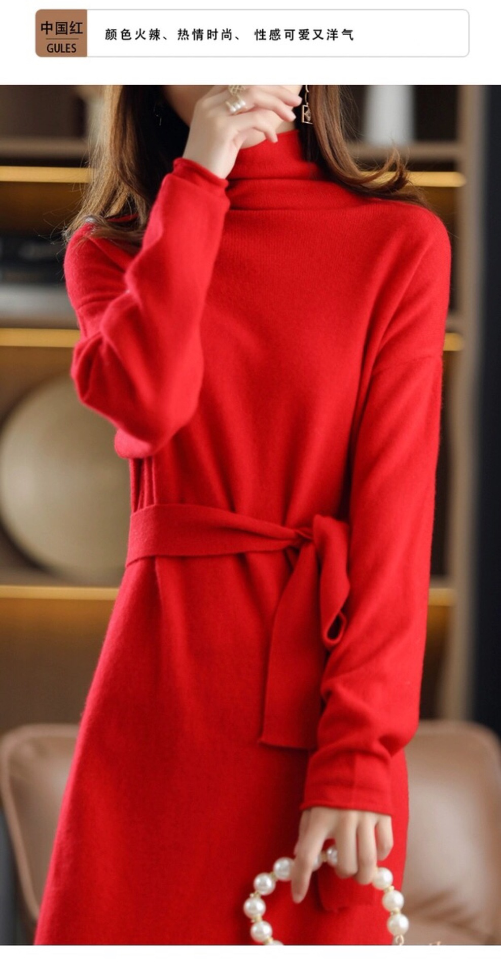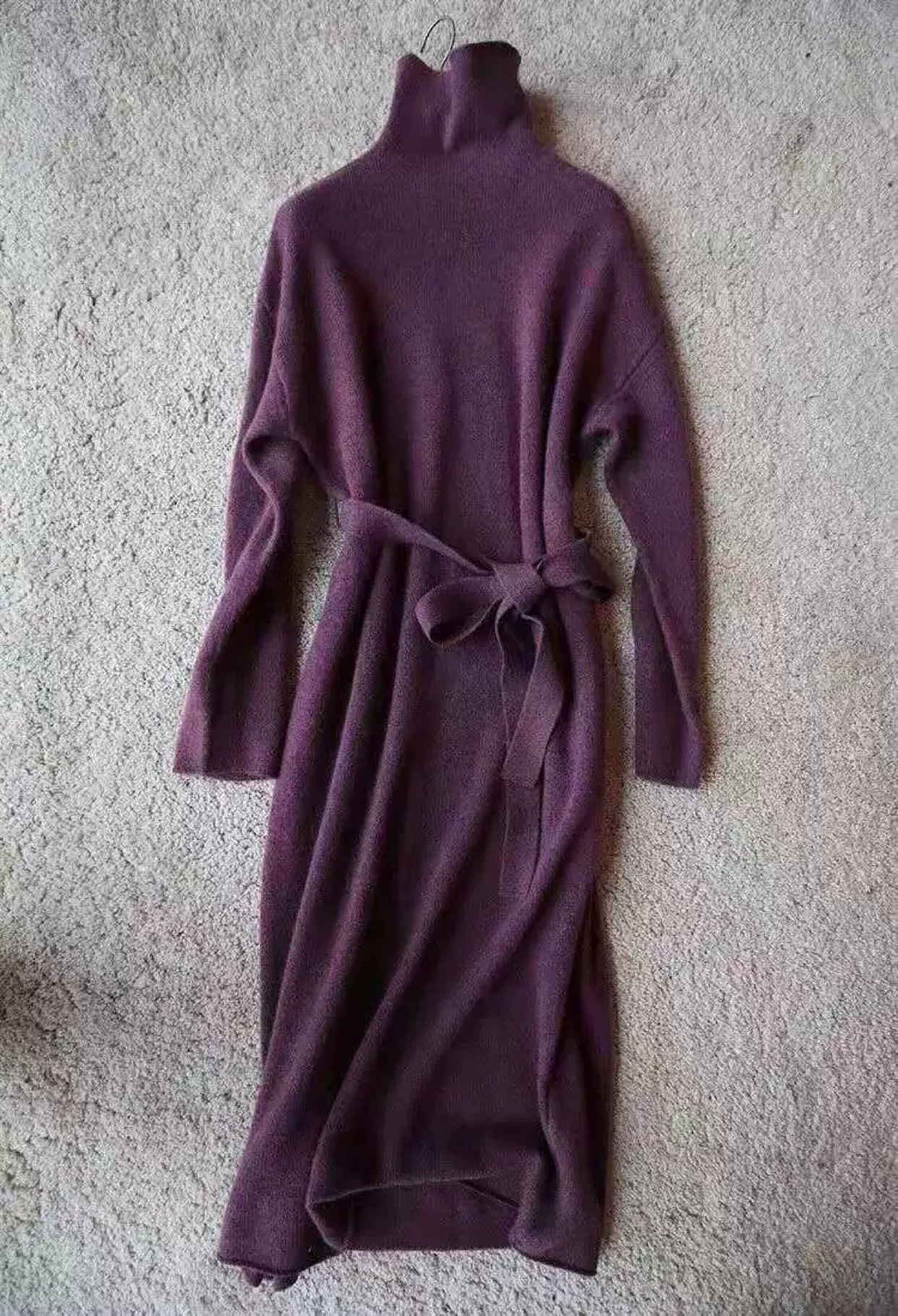 丁摩 秋冬100羊毛纯色高领堆领中长款针织连衣裙腰带气质收腰打底5ZF-2166