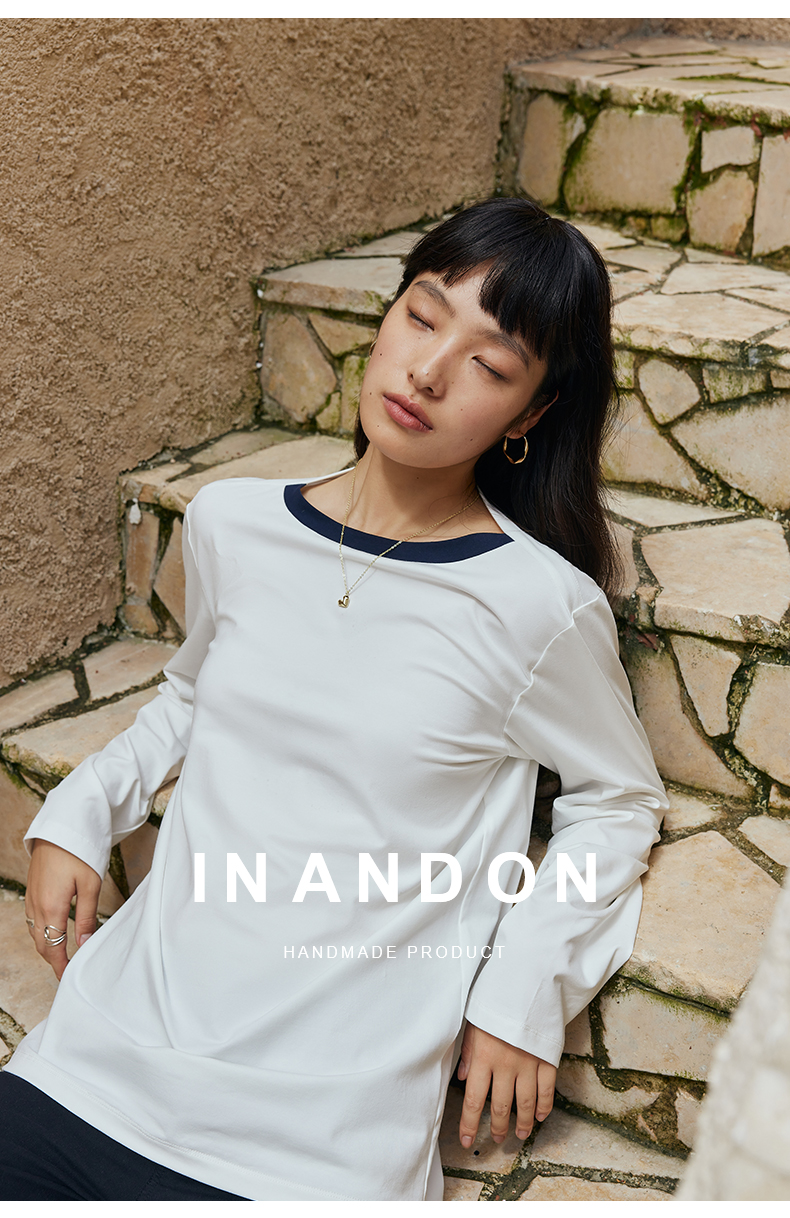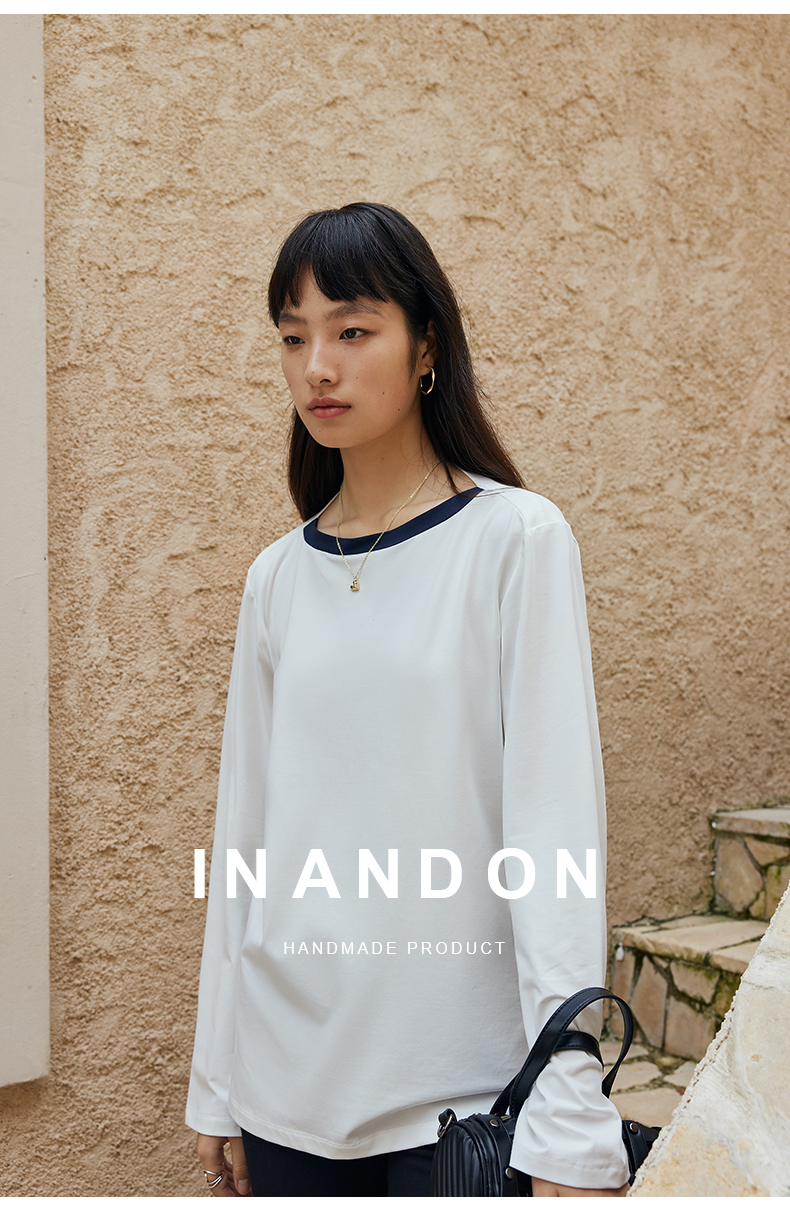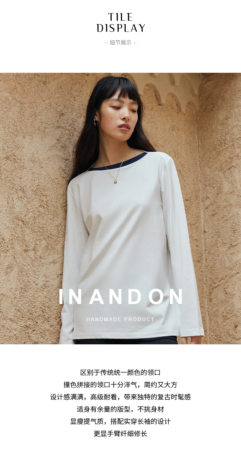 IN AND ON长绒棉撞色一字领长袖T恤女设计感百搭上衣53566