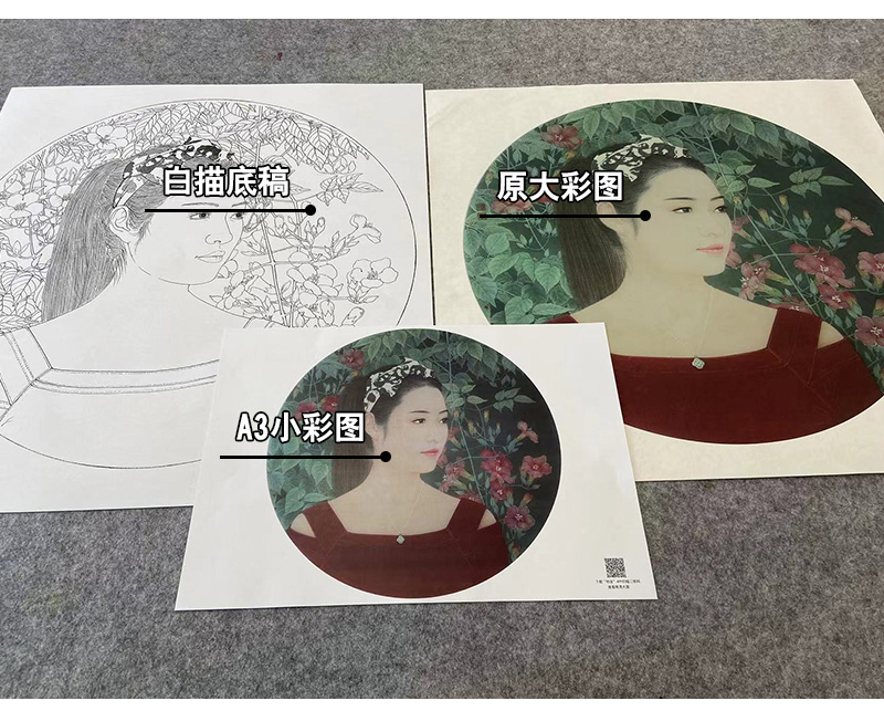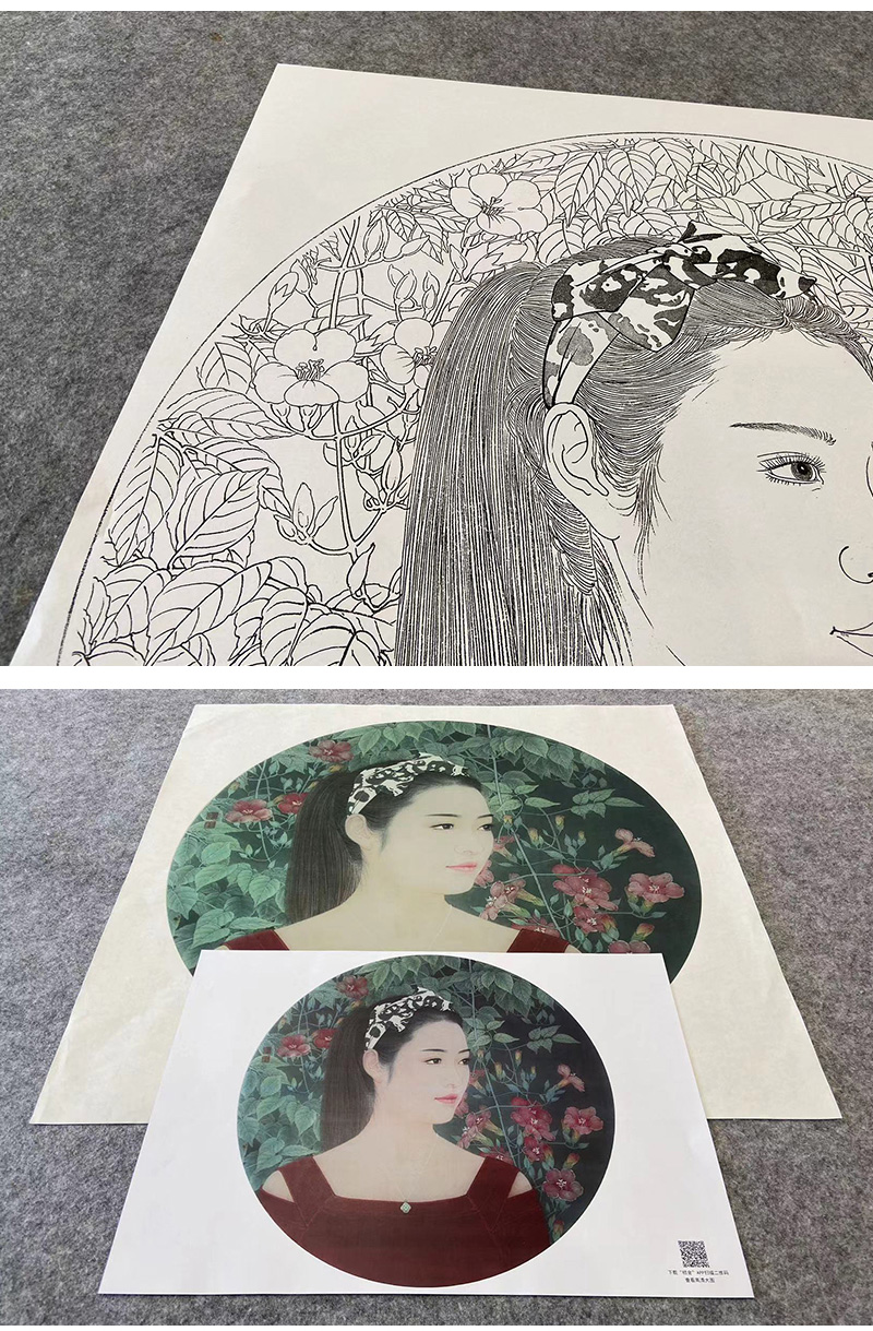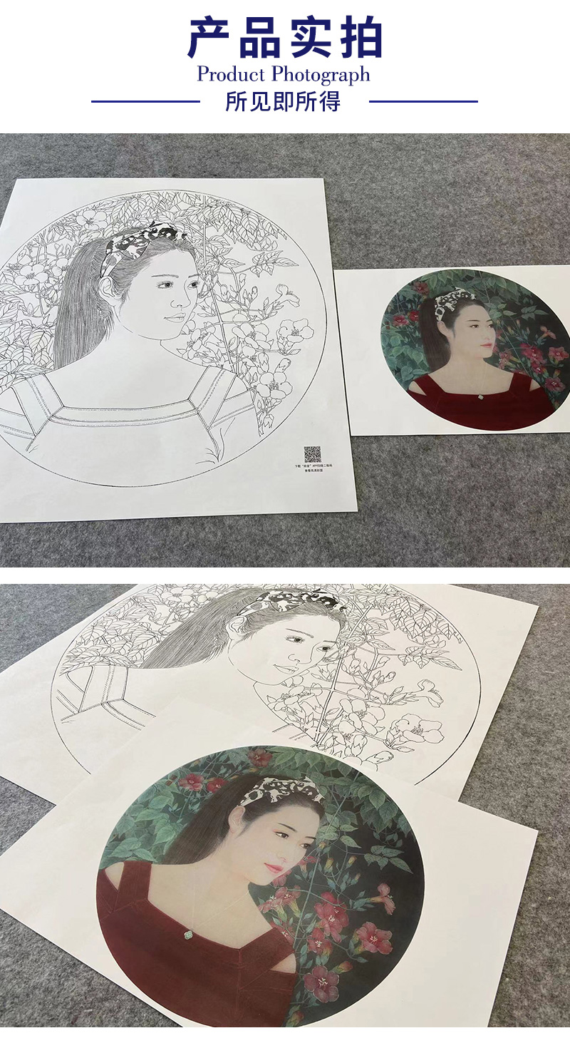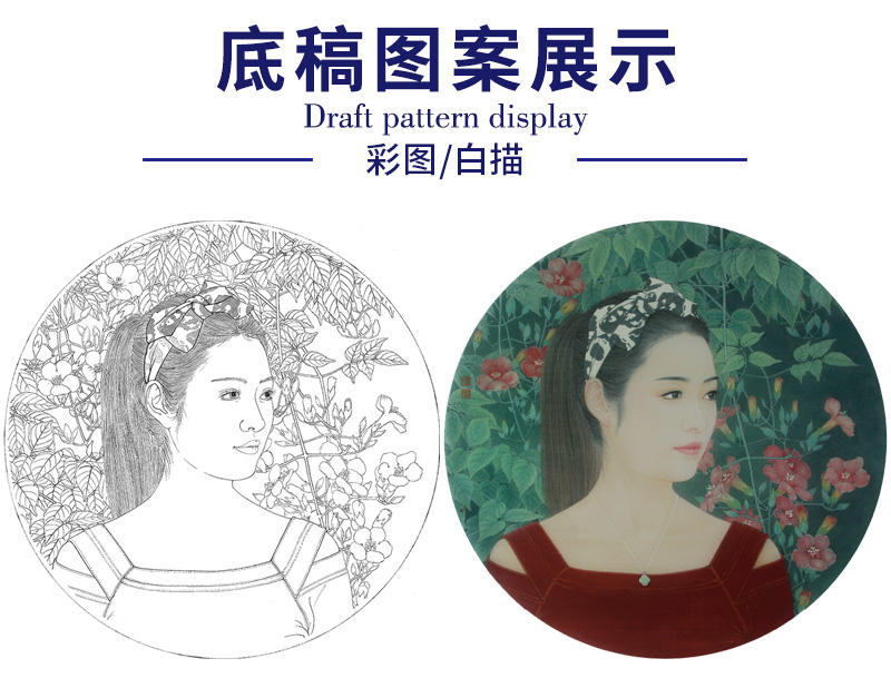 【大彩图】盘虎杰工笔画白描底稿圆形小品现代人物高清打印稿HJ38