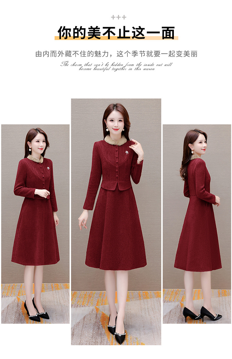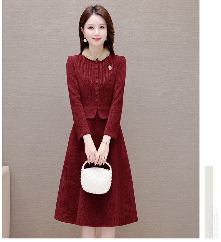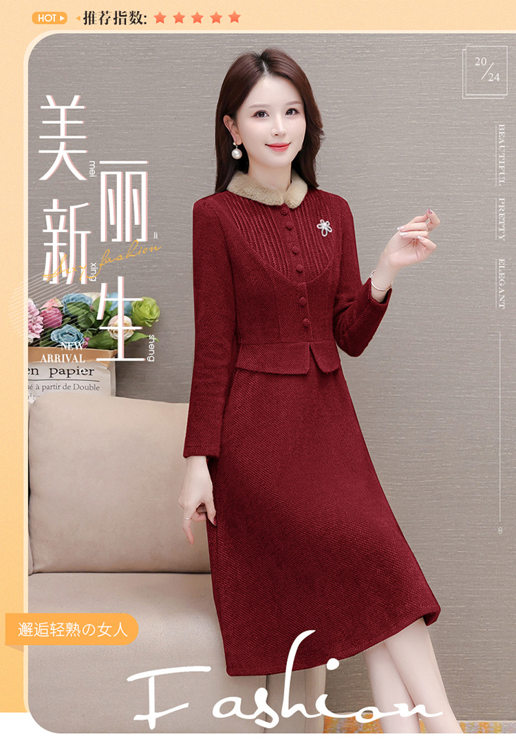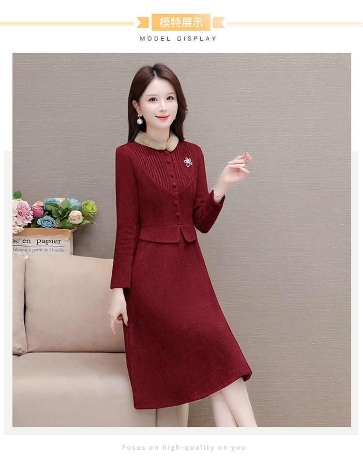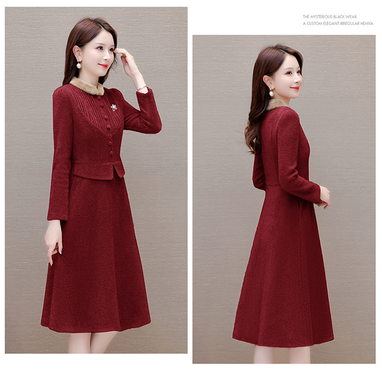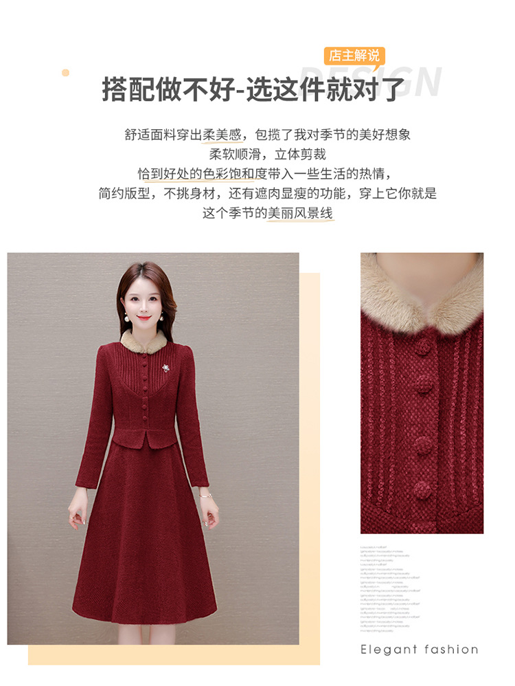 时尚气质,女装假两件连衣裙长袖中长款A字裙毛领厚款连衣裙QYM-HL-23F097-1-Y
