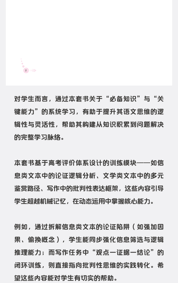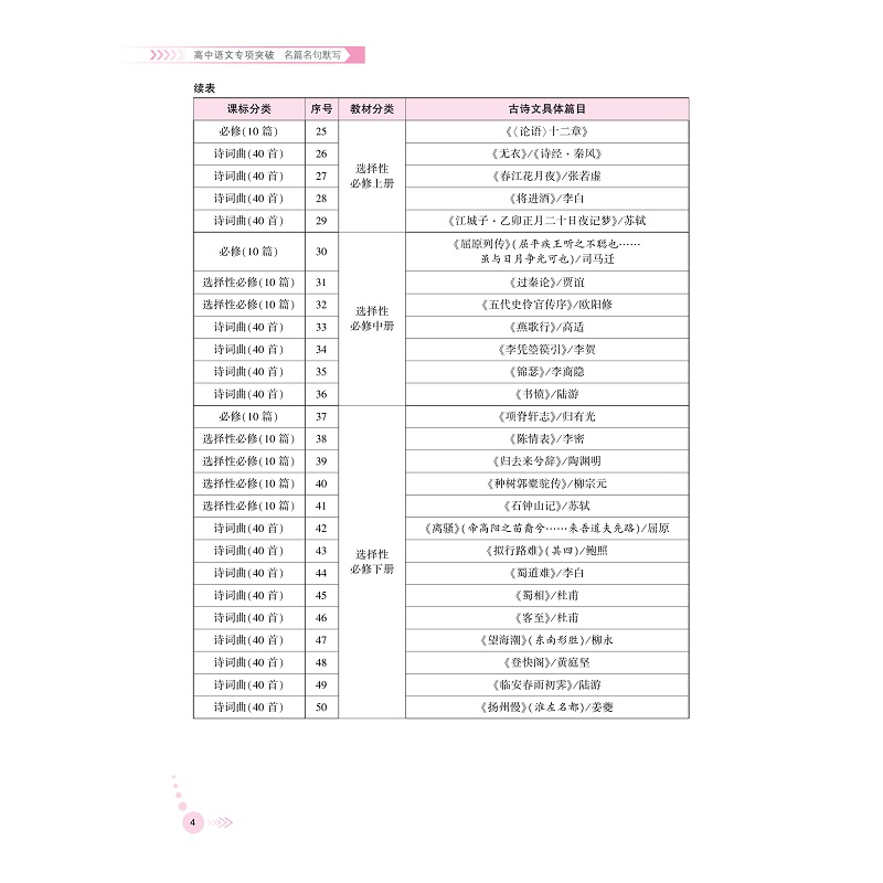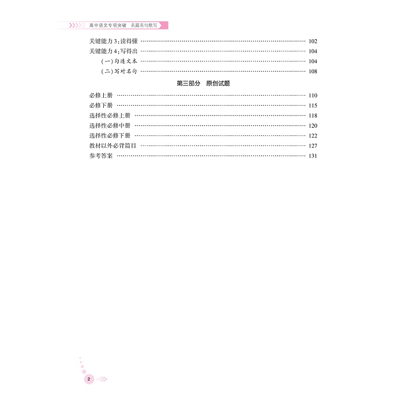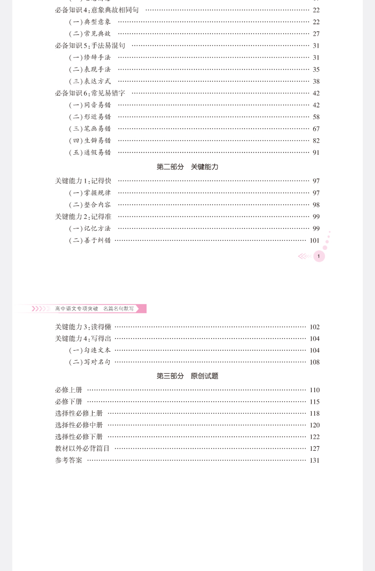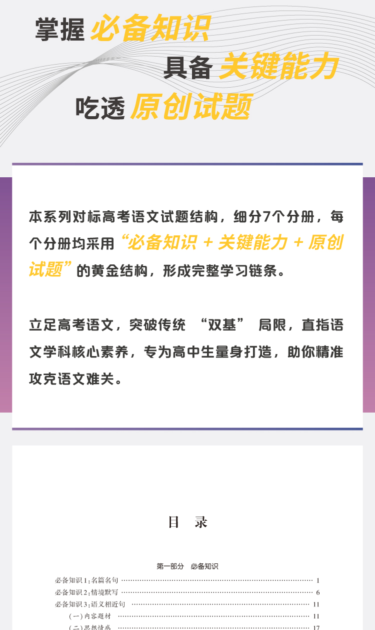 按高考试题结构分为7个分册,分别为现代文阅读一、现代文阅读二、古文阅读、古诗阅读、名篇名句默写、语言文字运用、写作。