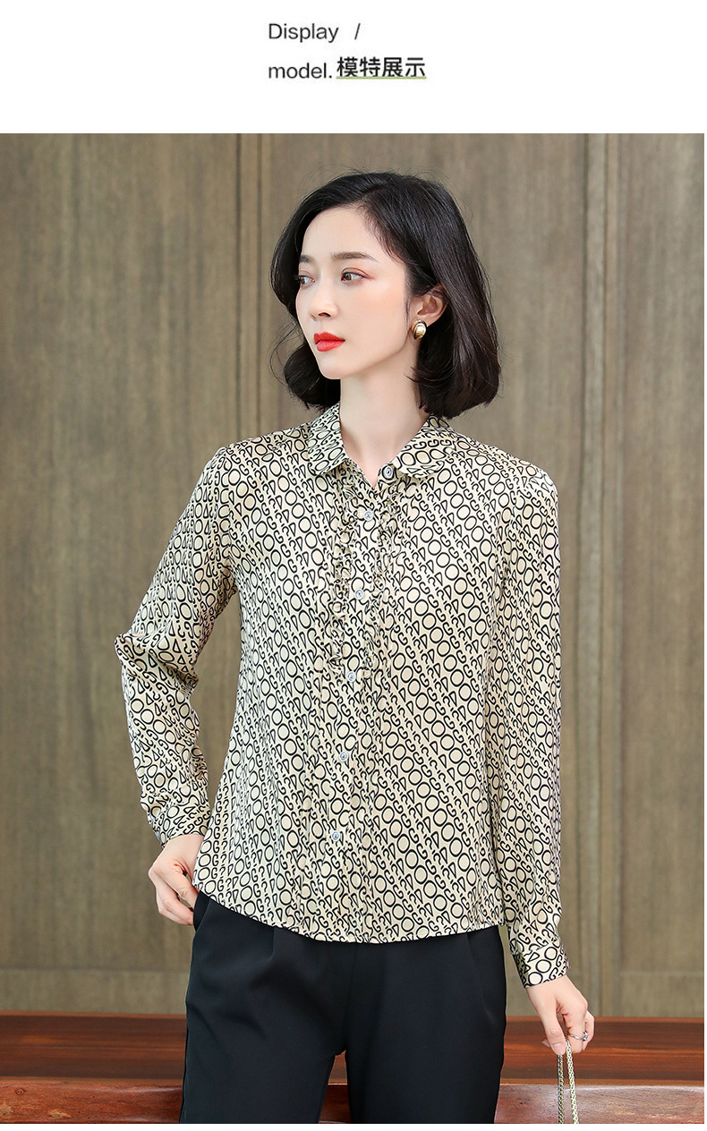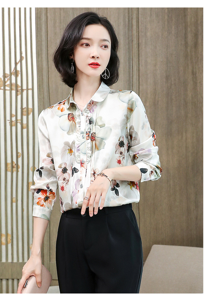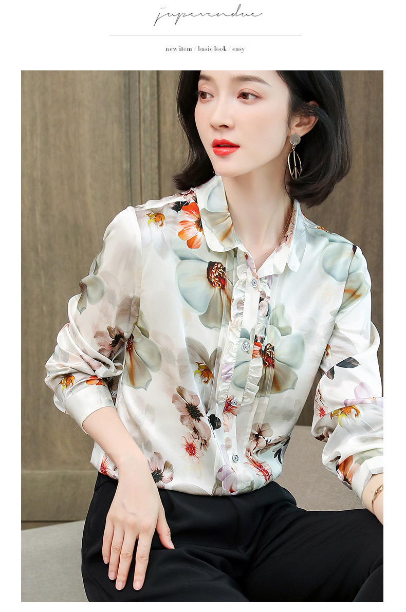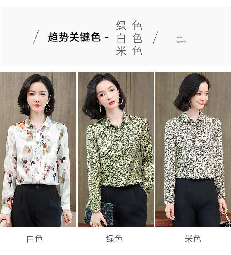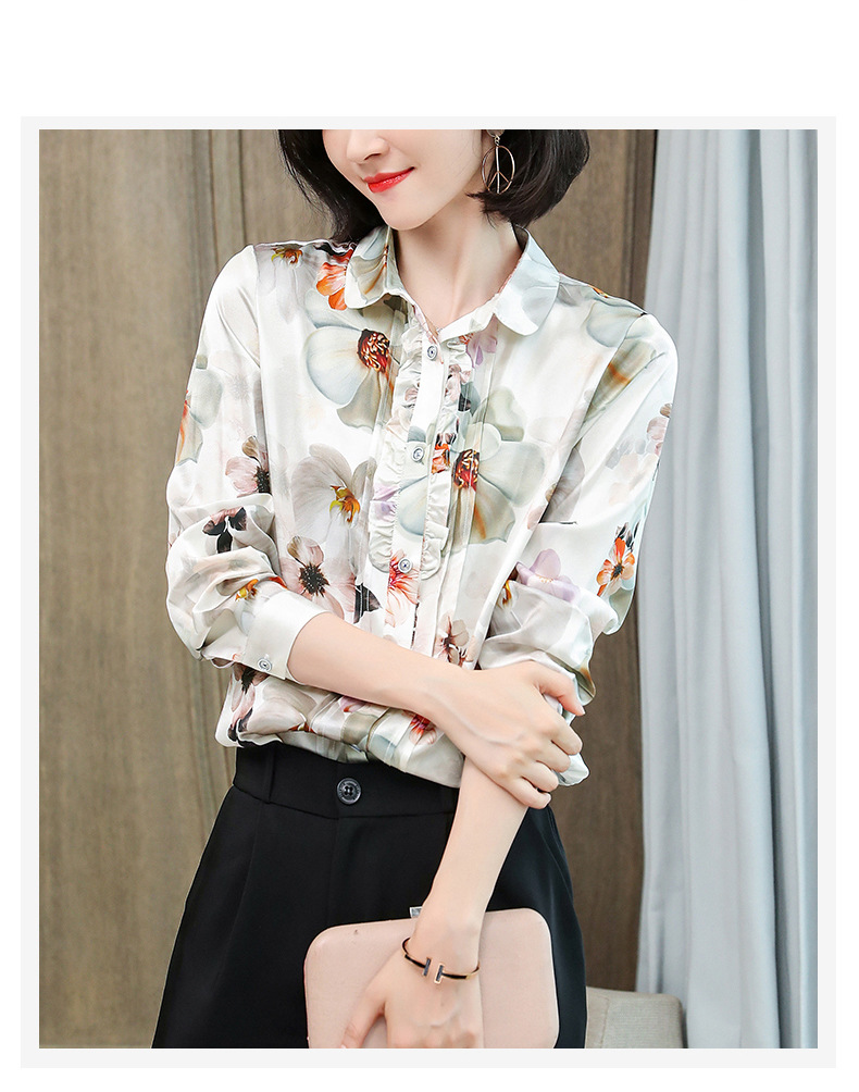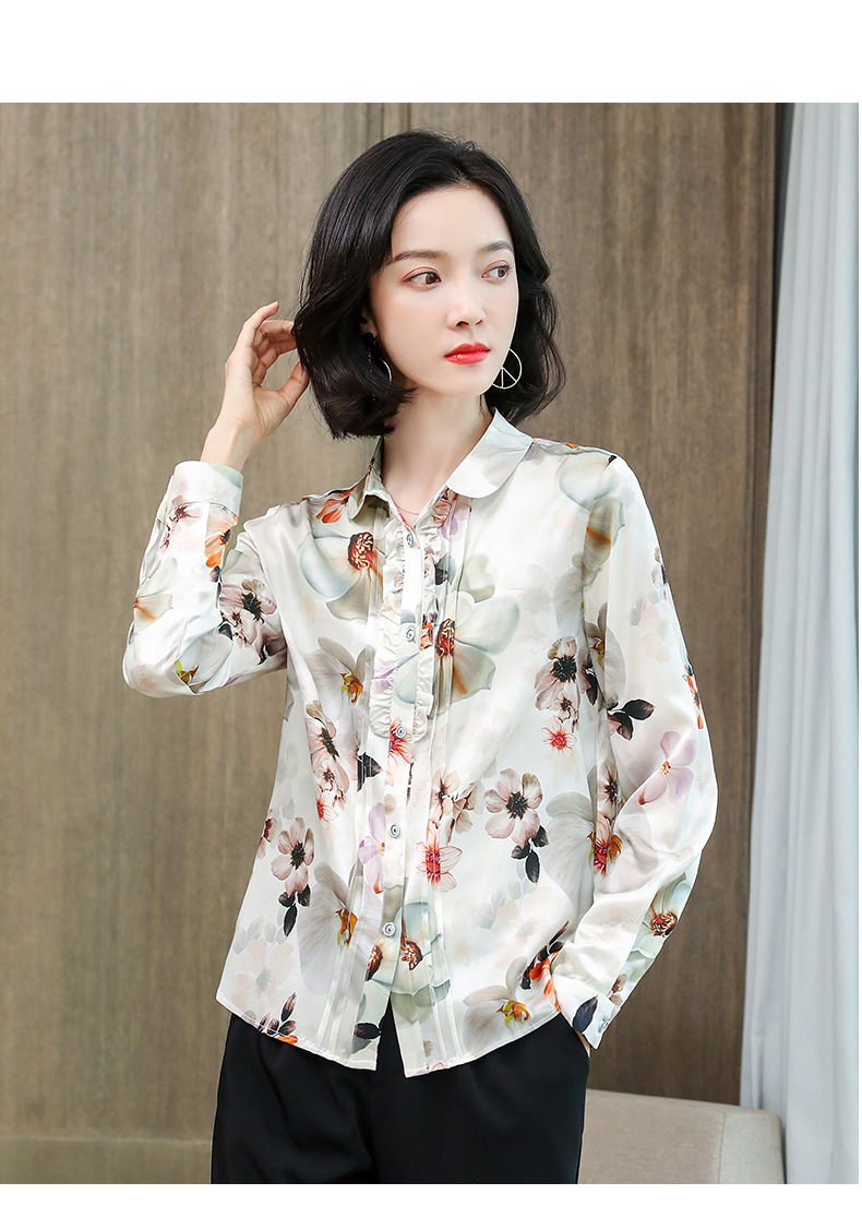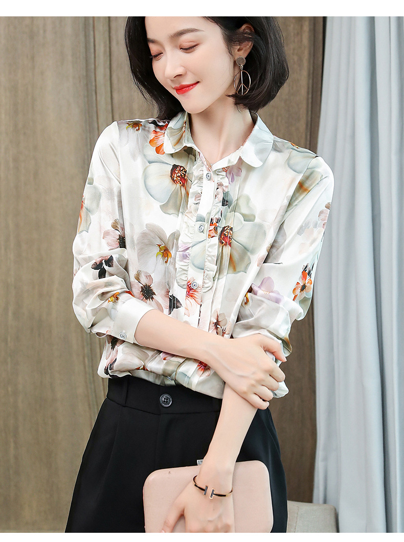 ASE-3398重磅真丝衬衫女2021秋新款气质木耳边长袖格纹印花桑蚕丝衬衣