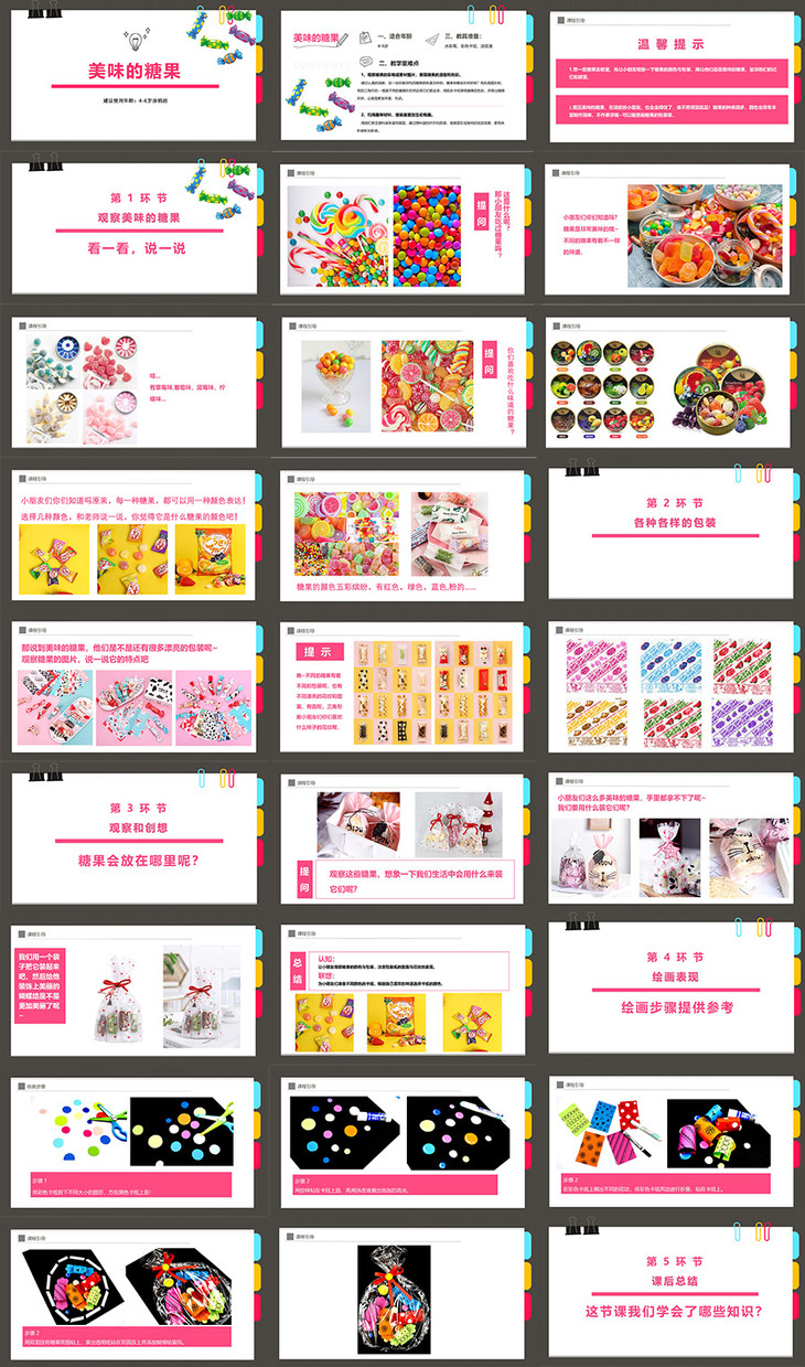 1、观察糖果的实物或素材图片,表现糖果的造型和色彩。
