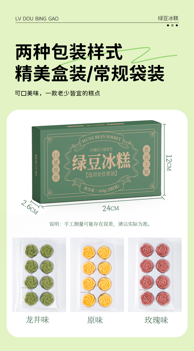 | 【品名】天鲜萌绿豆冰糕 【规格】160g/盒(8个) 【保质期】15天 【储存方式】常温开袋即食,冷藏口感更佳 【产地】福建漳州 【发货地】福建漳州 【快递】极兔、中通 【发货区域】新疆、西藏、青海、港澳台地区不发货 【补邮费地区】内蒙、宁夏、甘肃+4元 【发货时效】48小时发货,节假日顺延 |