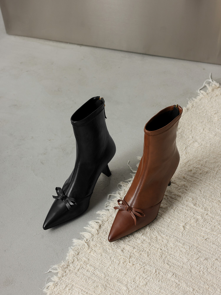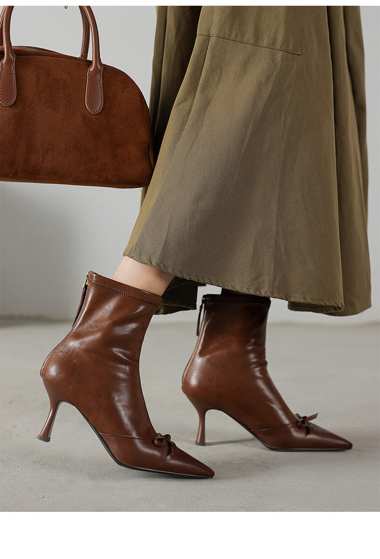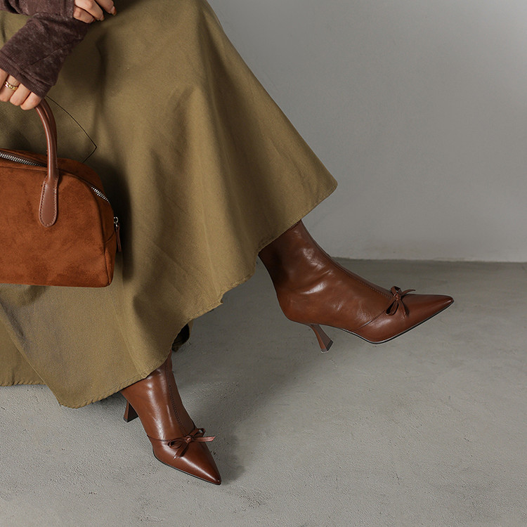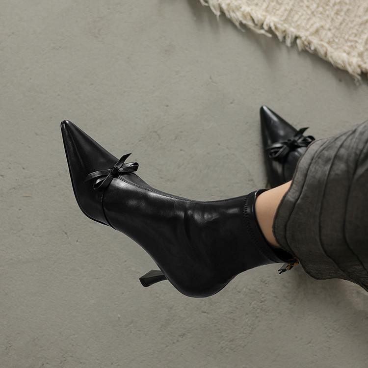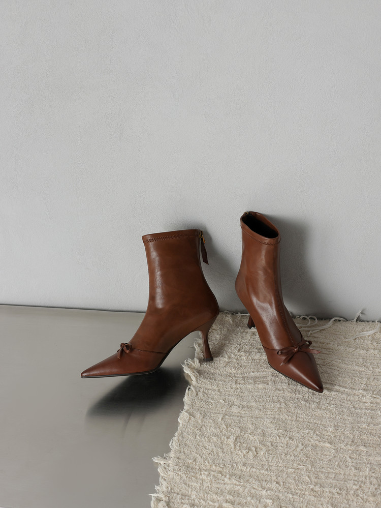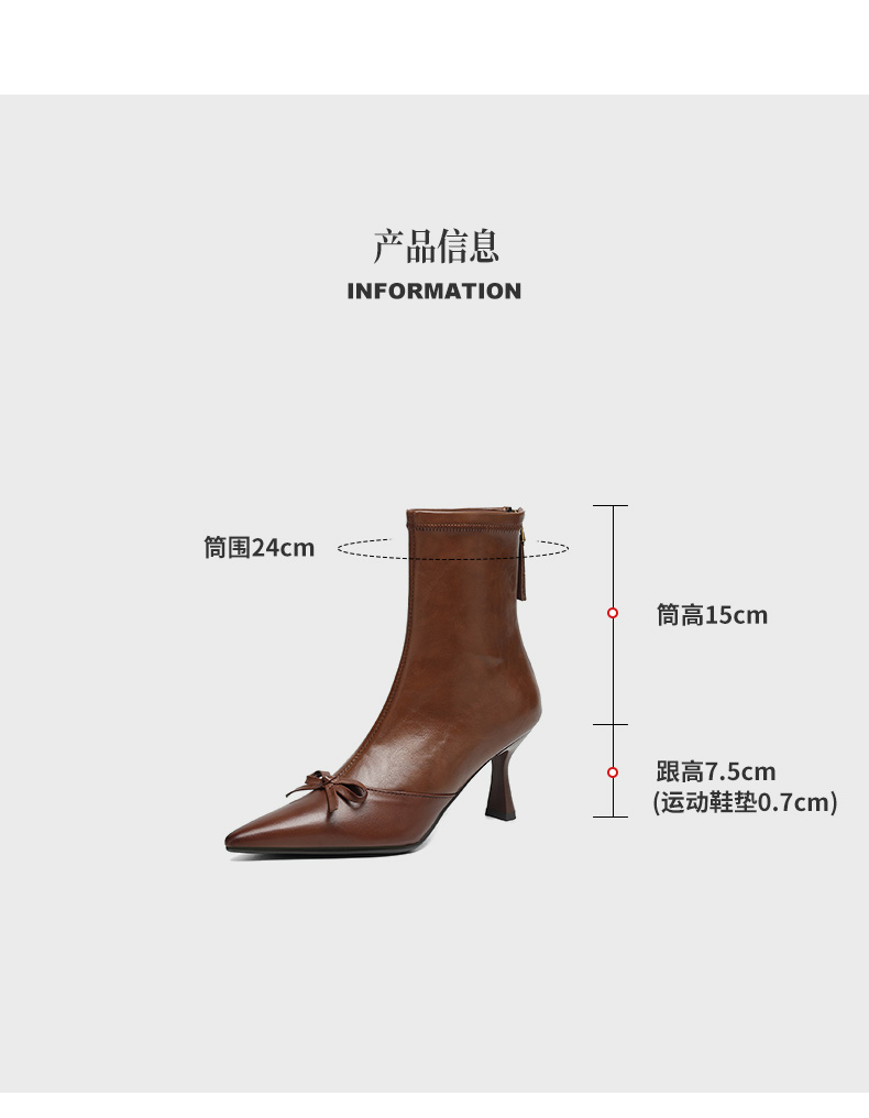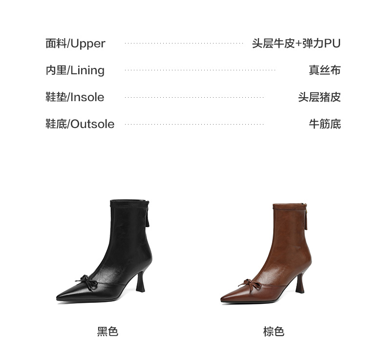 【预售5天】法式棕色蝴蝶结高跟短靴尖头弹力靴秋冬显瘦气质瘦瘦靴子WC&M3496
