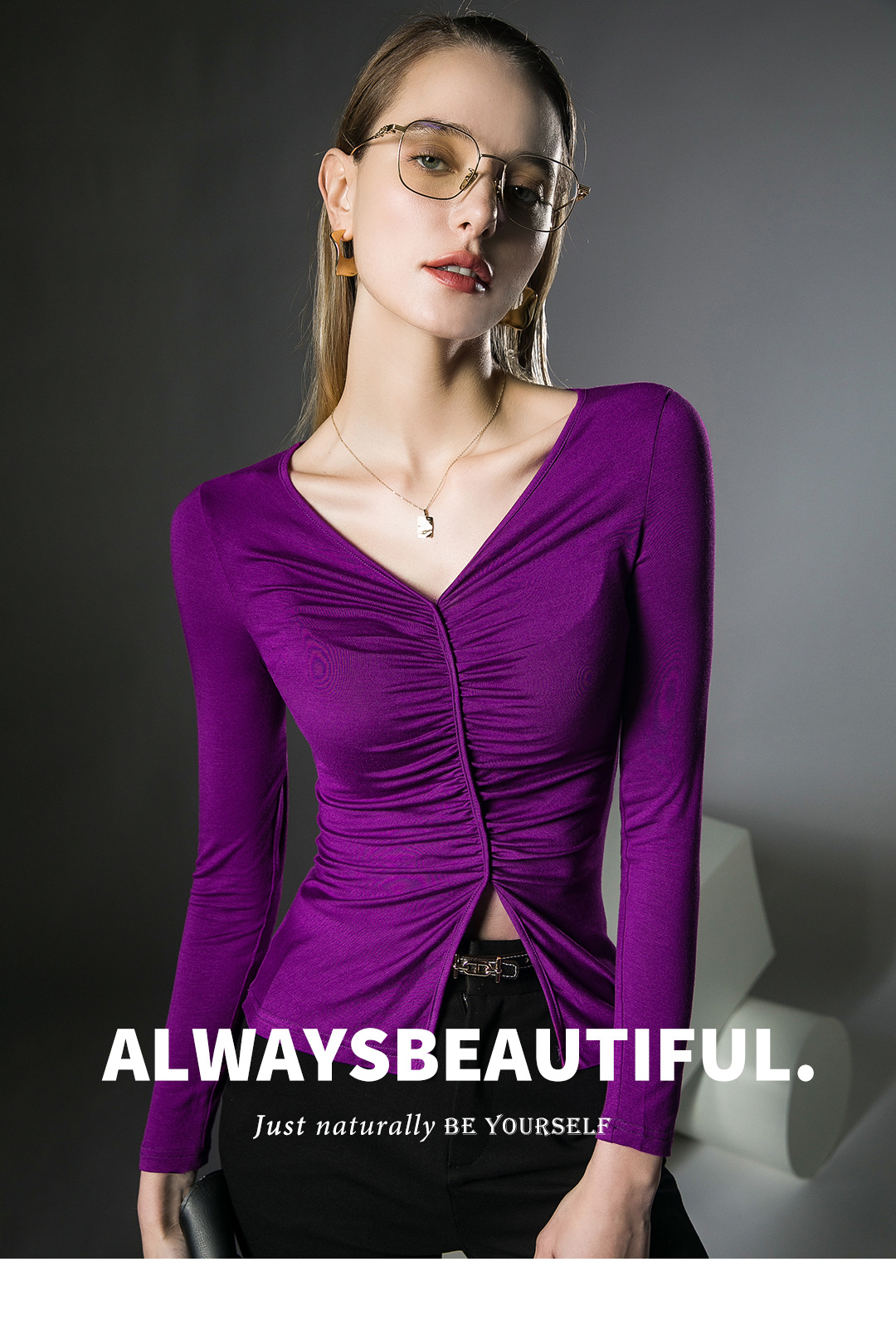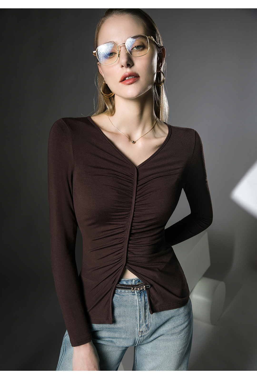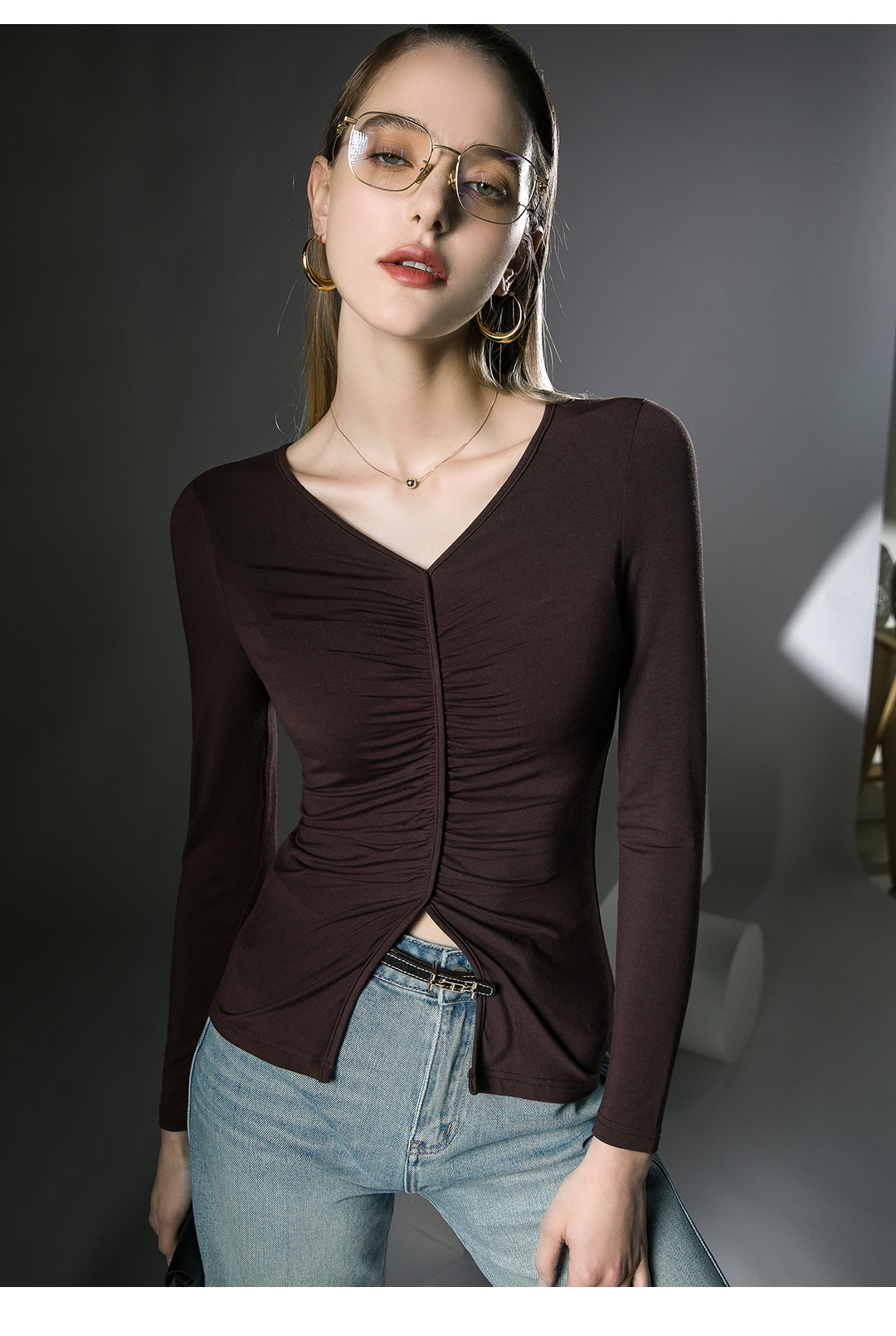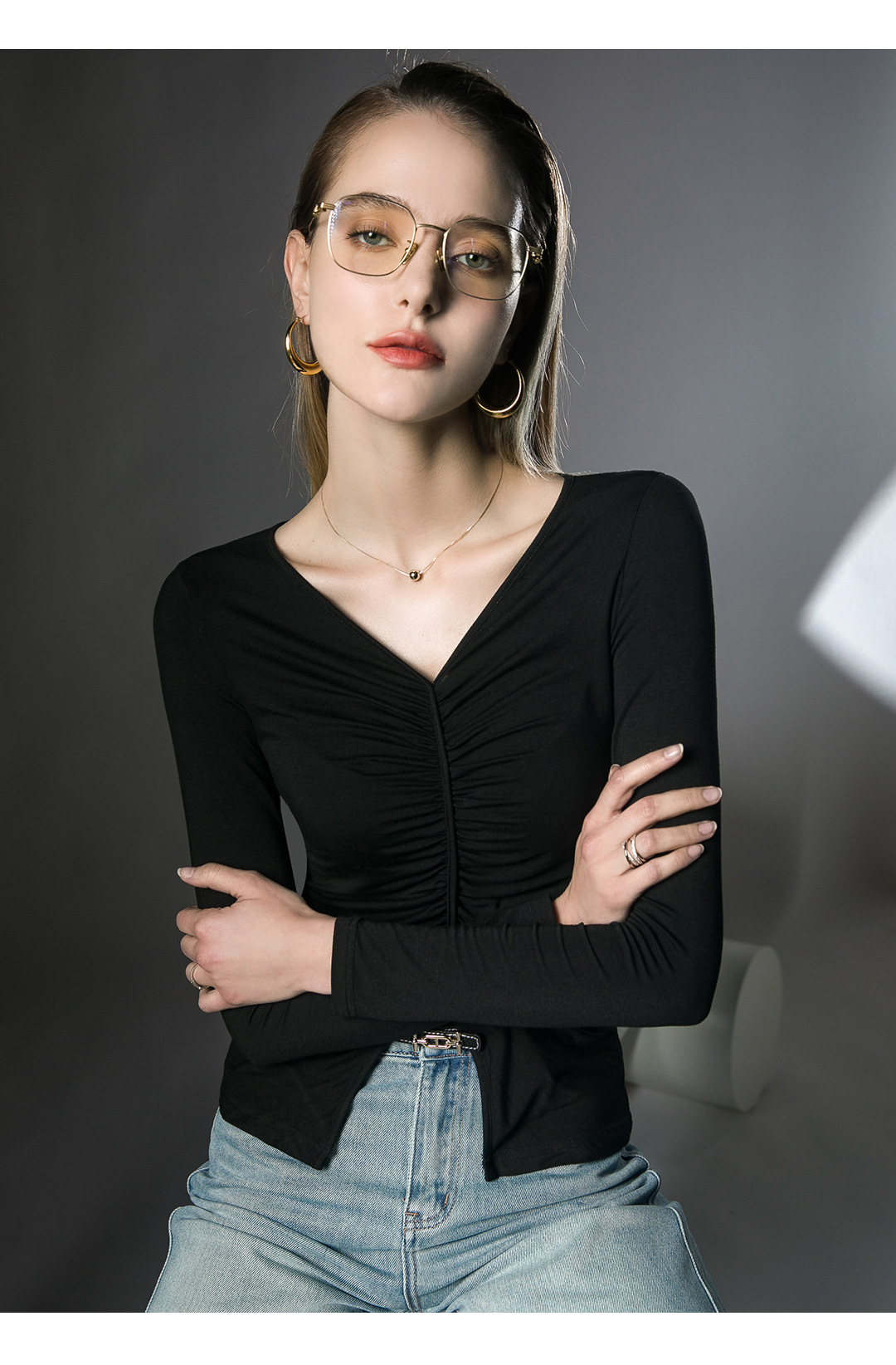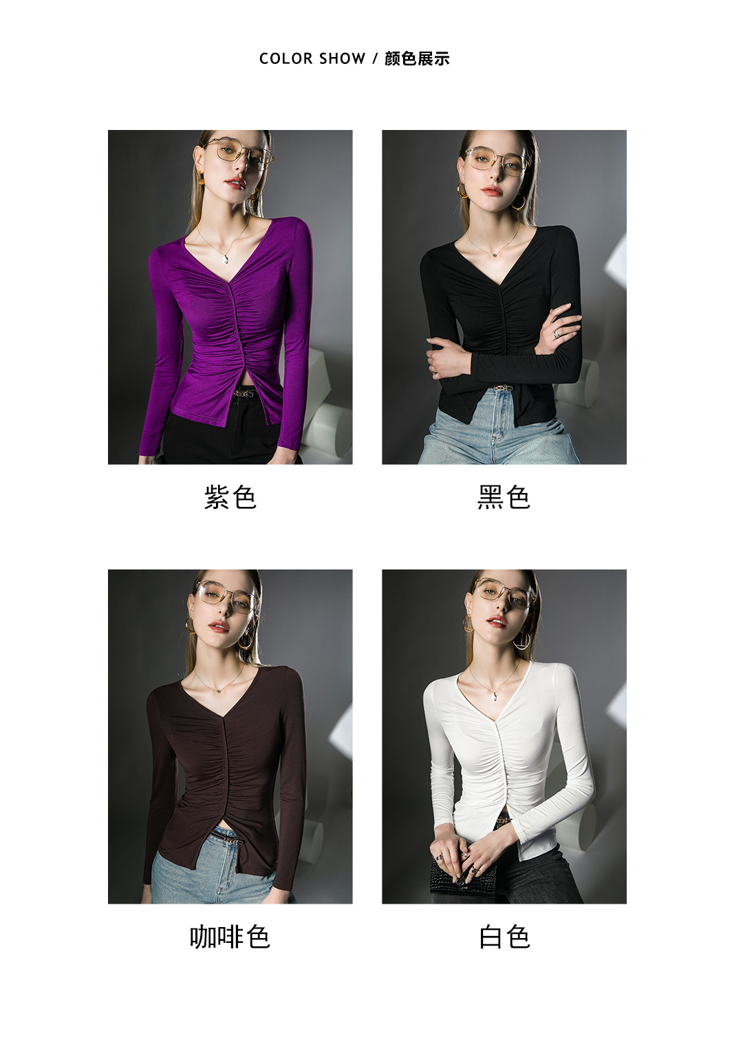 V领内搭打底衫,褶皱洋气欧货小衫长袖FN23TX205