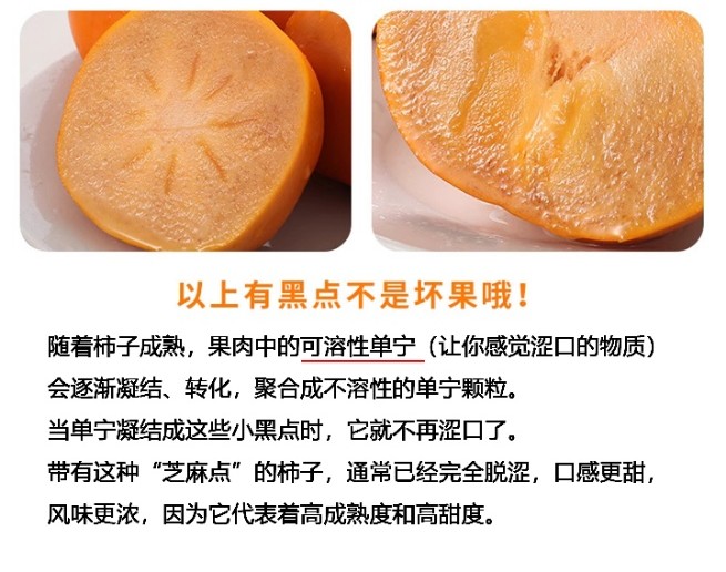 3.果子未使用任何杀虫和杀菌剂,个别果子表面会有小黑点,是不影响食用的;以及因采摘成熟度高,个别已木质化的柿子蒂与柿子表面接触处可能会有小部分木质化结构,这是柿子生长过程中的自我保护属正常现象,对果面外观有特别要求的请慎拍。