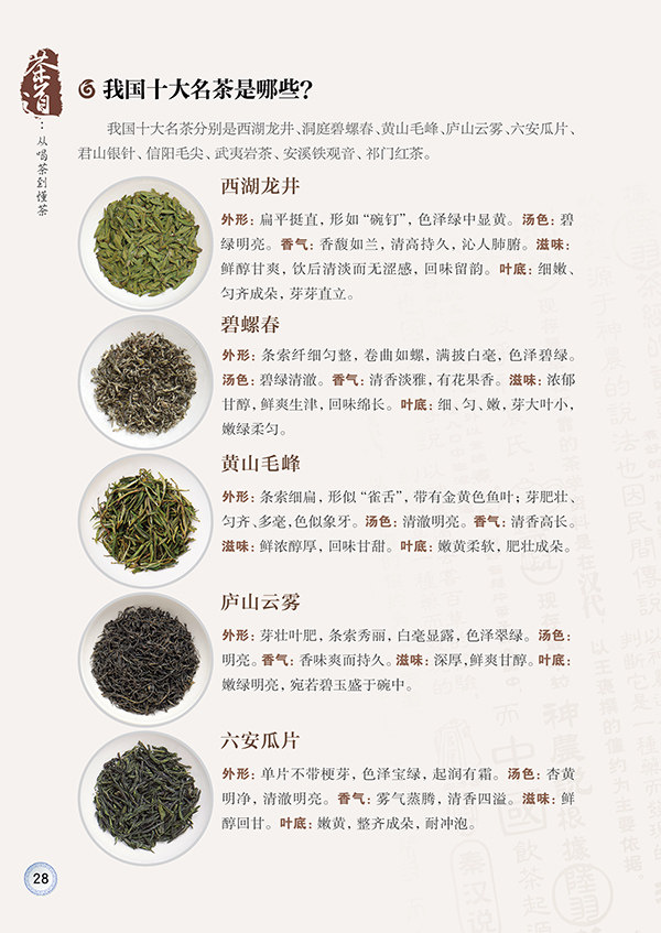 600余幅精美清晰大图,绿茶、白茶、黄茶、乌龙茶、红茶、黑茶和花茶,七大茶类一网打尽,完美展现名茶的干茶、茶汤、叶底,让你准确了解茶叶的具体特征,帮助你更好更快地鉴别茶叶的优劣,使具体的区别可视可感,帮你认购好茶。冲泡方法更是一步一图,一目了然,看到就会上手。