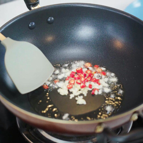 2.锅中放入适量油,油温烧至6成热,放入小米椒圈、蒜末爆香;