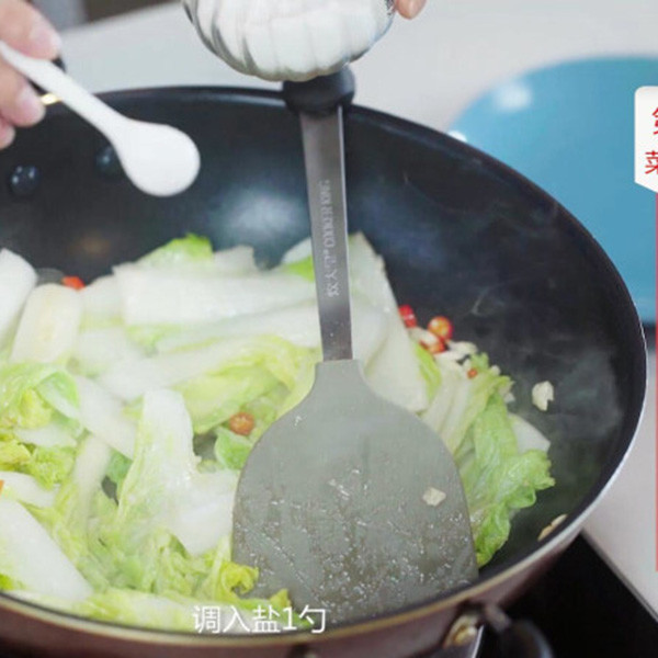3.放入白菜炒至断生,调入盐1勺、鸡精1勺炒匀即可