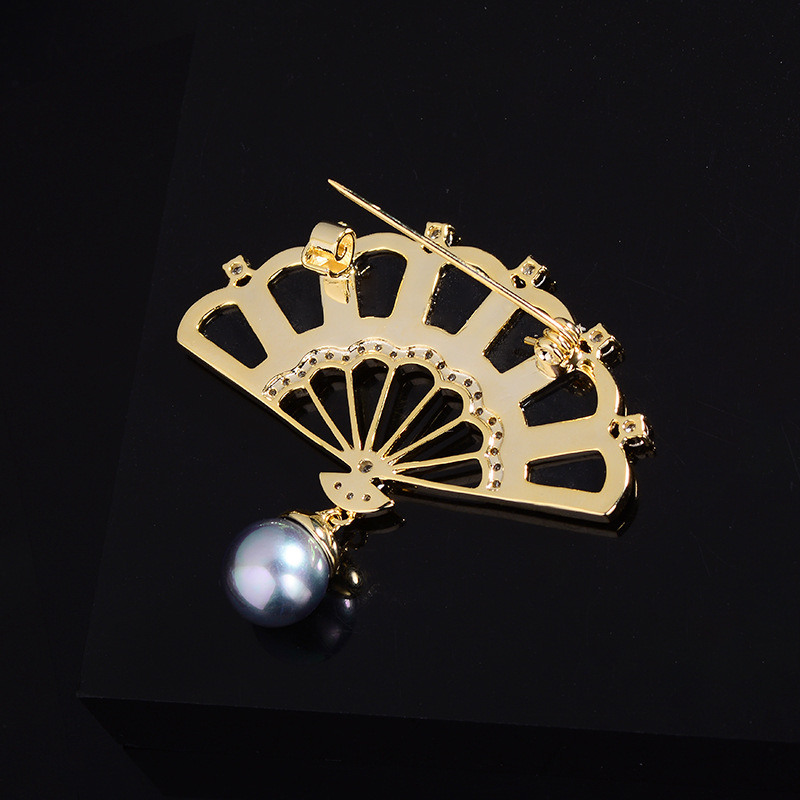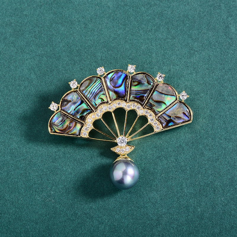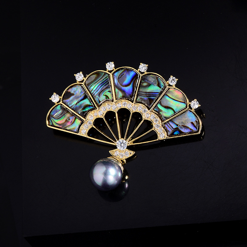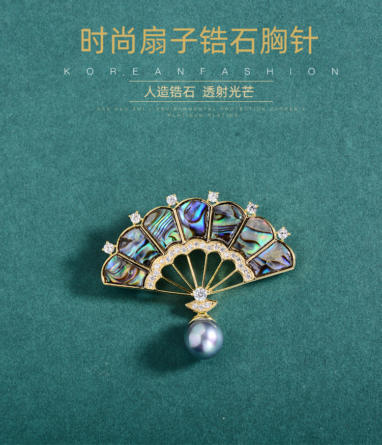 复古气质鲍贝扇子吊坠胸针,微镶锆高档中国风文艺风披肩旗袍别针AM-XR12539