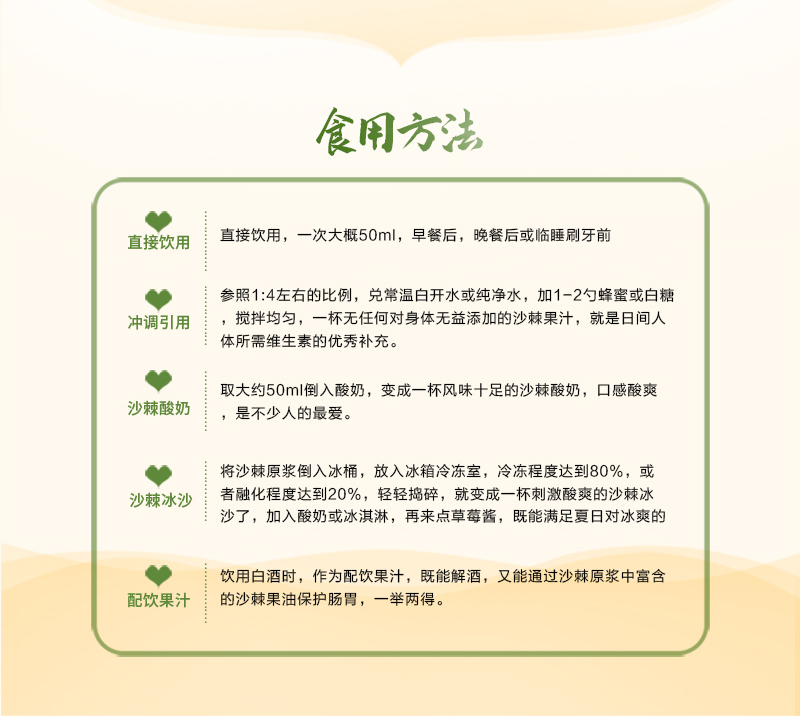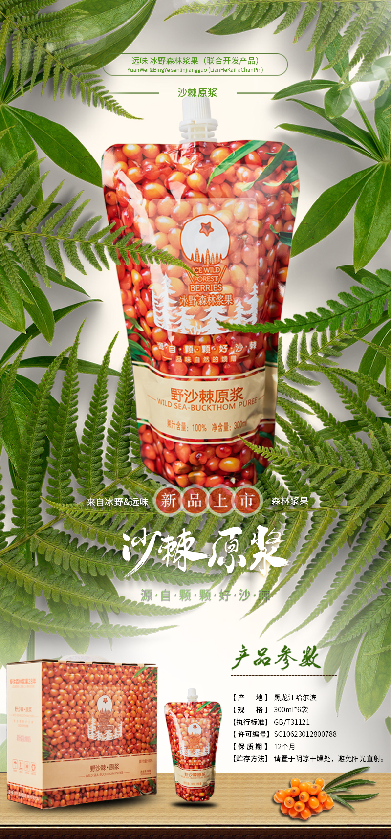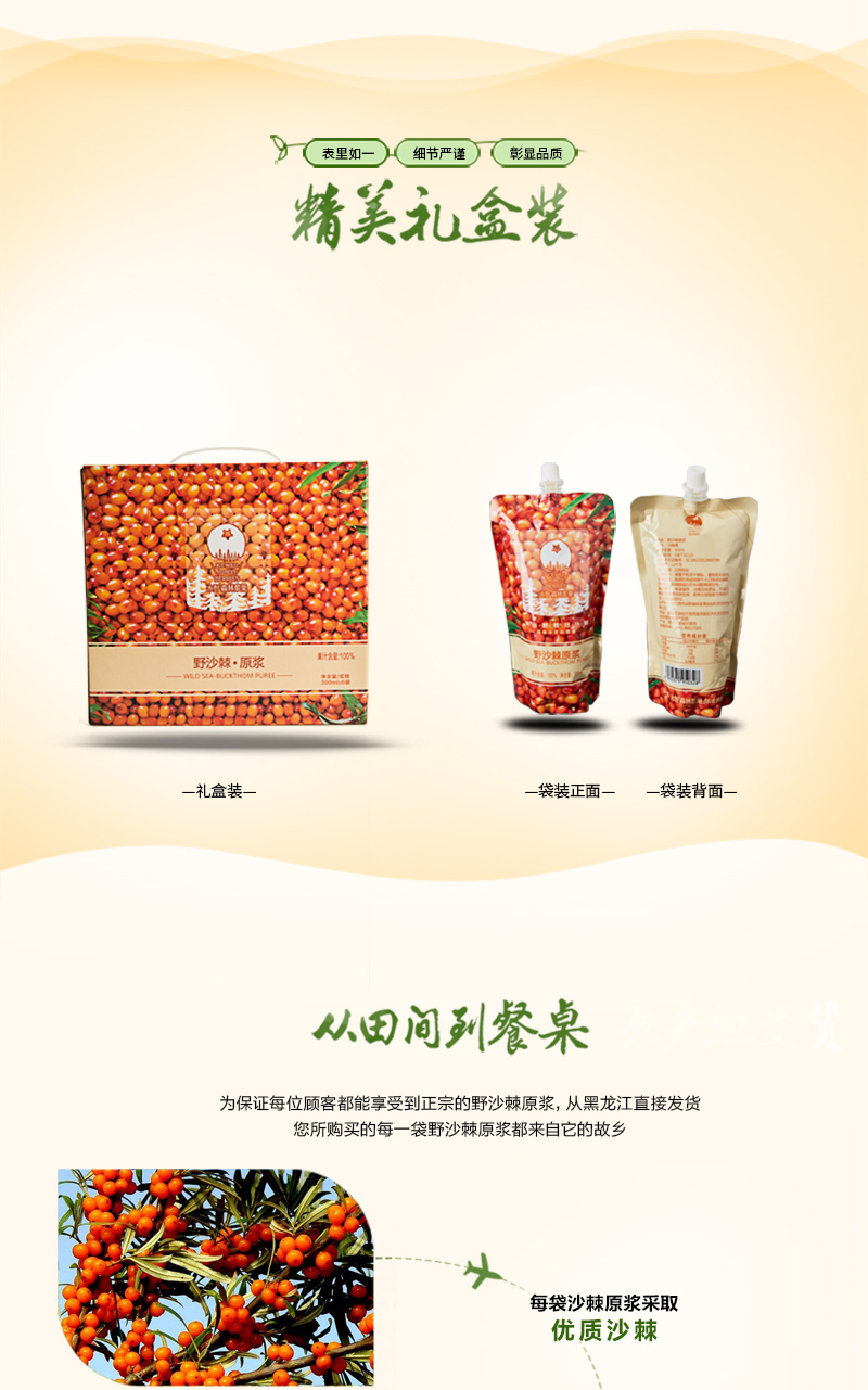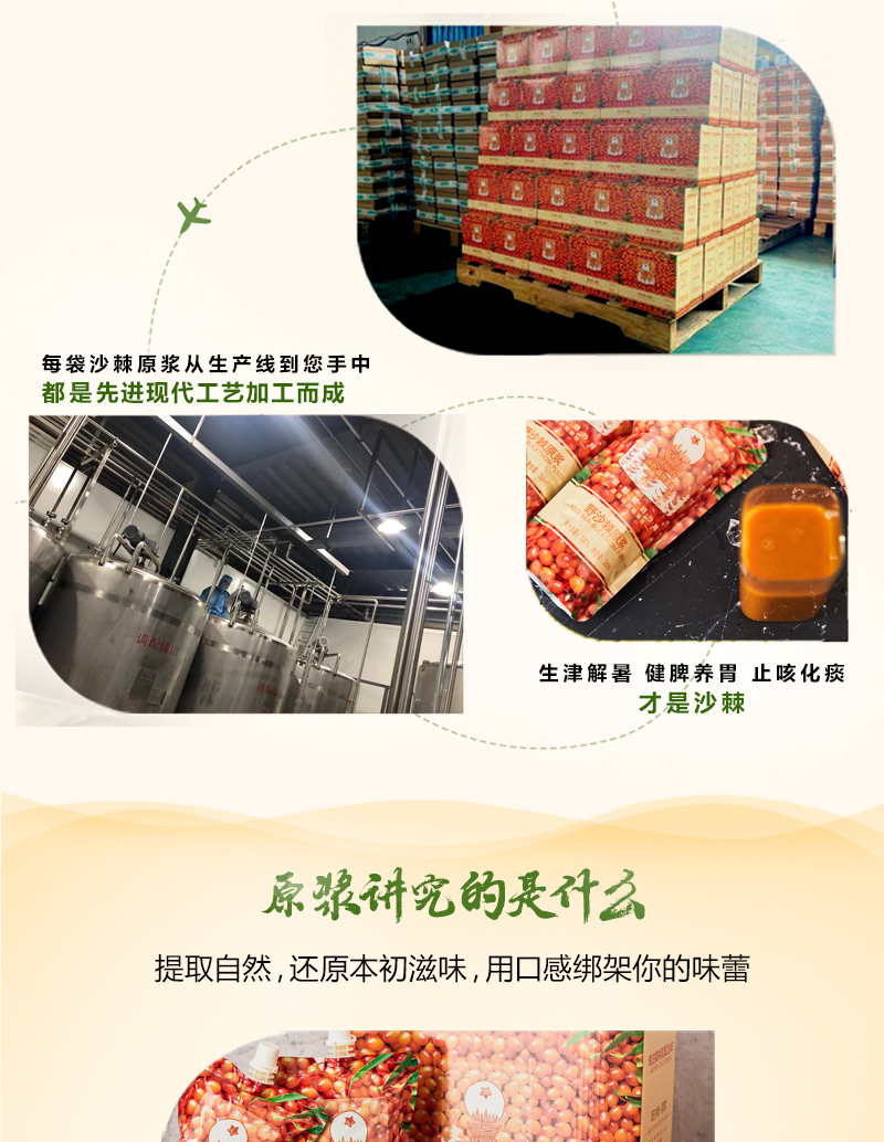 品名:沙棘原浆(100%原浆) 规格:300ml*6袋;拍几份发几个包裹,不一定能同时到达,请耐心等待; 发货地/产地:黑龙江 包装方式:袋装 保质期:12个月 物流信息:默认韵达/中通/京东快递,不支持指定快递 发货区域:西藏不发; 物流详情:周六、周日及节假日除外,正常48小时内发货,到货时间约为2~5天,请耐心等待 售后说明:收到货后有质量问题,在24小时内都可以拍照(坏品+快递单面箱子一起拍)上传,申请按坏品比例理赔或联系客服,生鲜性质特殊,因地址错误,手机号联系不上,拒收等造成的损失无法售后,请理解; |