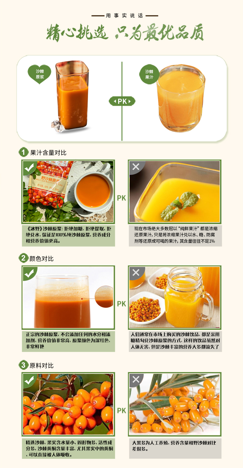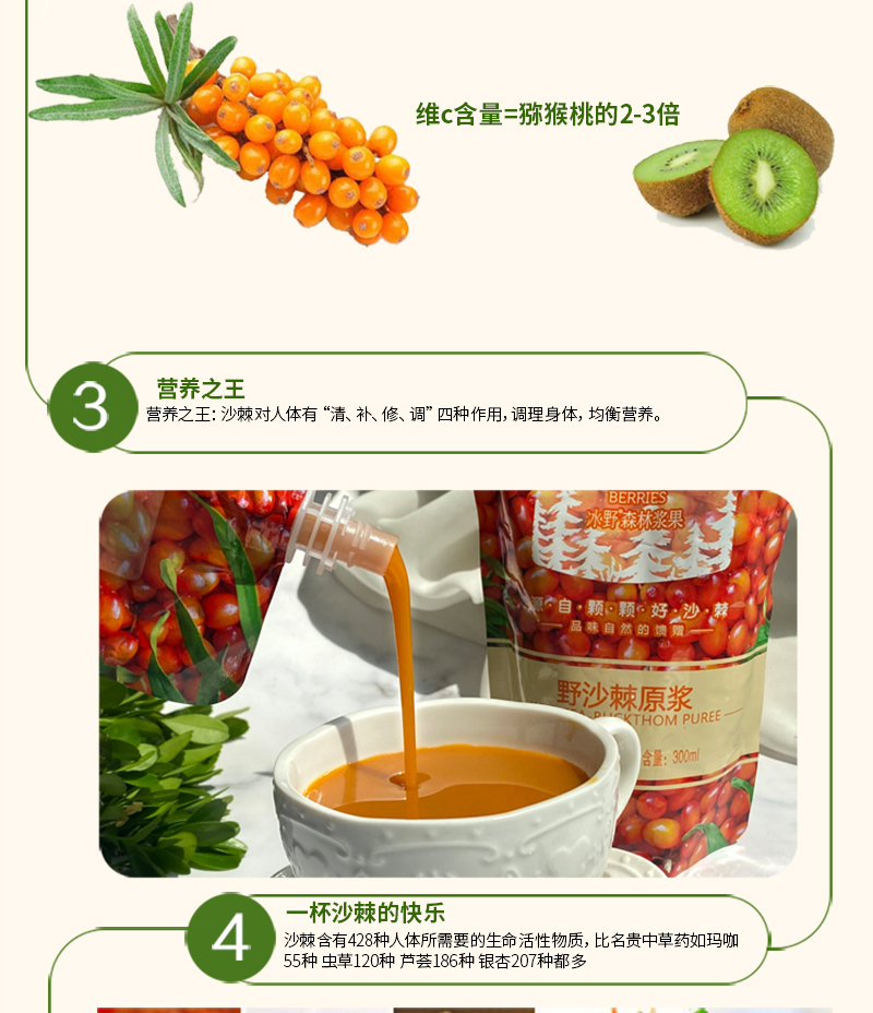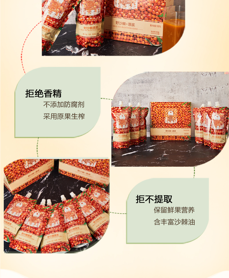 【果酱良品】沙棘原浆 纯正无添加 可以直接喝的小果沙棘 冰野沙棘原浆 300ml*6袋包邮