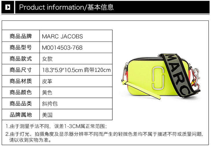 【香港直邮】MARC JACOBS 马克·雅可布 女士黄色皮革单肩包斜挎包 M0014503-768
