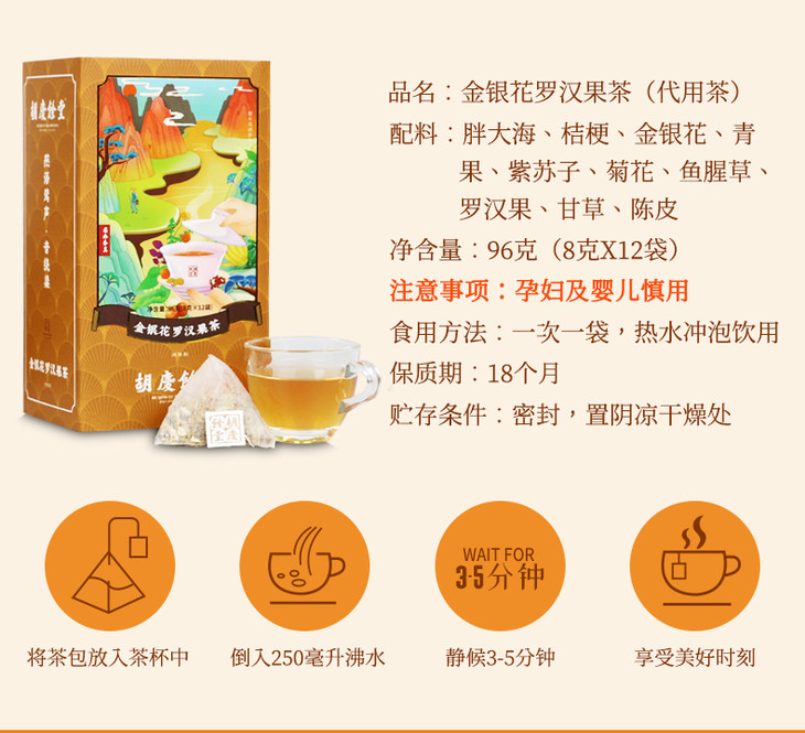 【买2送1】胡庆余堂 金银花罗汉果茶 96克(8克x12袋)袋泡茶