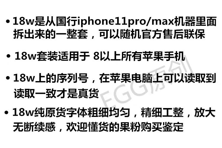 说明:1、苹果快充,杂牌和假货很多,各种版本,低仿高仿,有的号称原材料组装,厂原,富士康原厂。淘宝京东搜“苹果原装18w快充”,没几个真正原装的。本店只卖真正原装配件。无需置疑,也不支持退换,本店实体店,遇见过买我们的产品结果退回来假货的,一律报警处理。