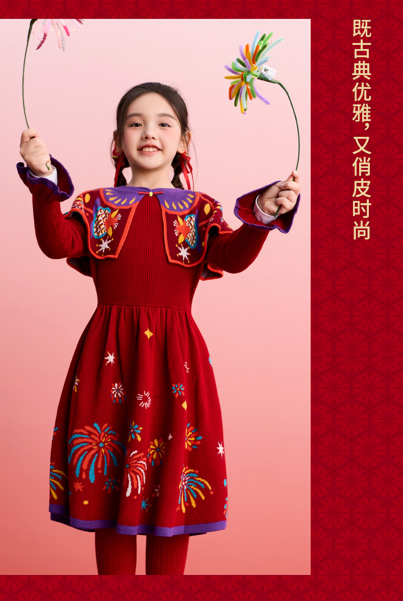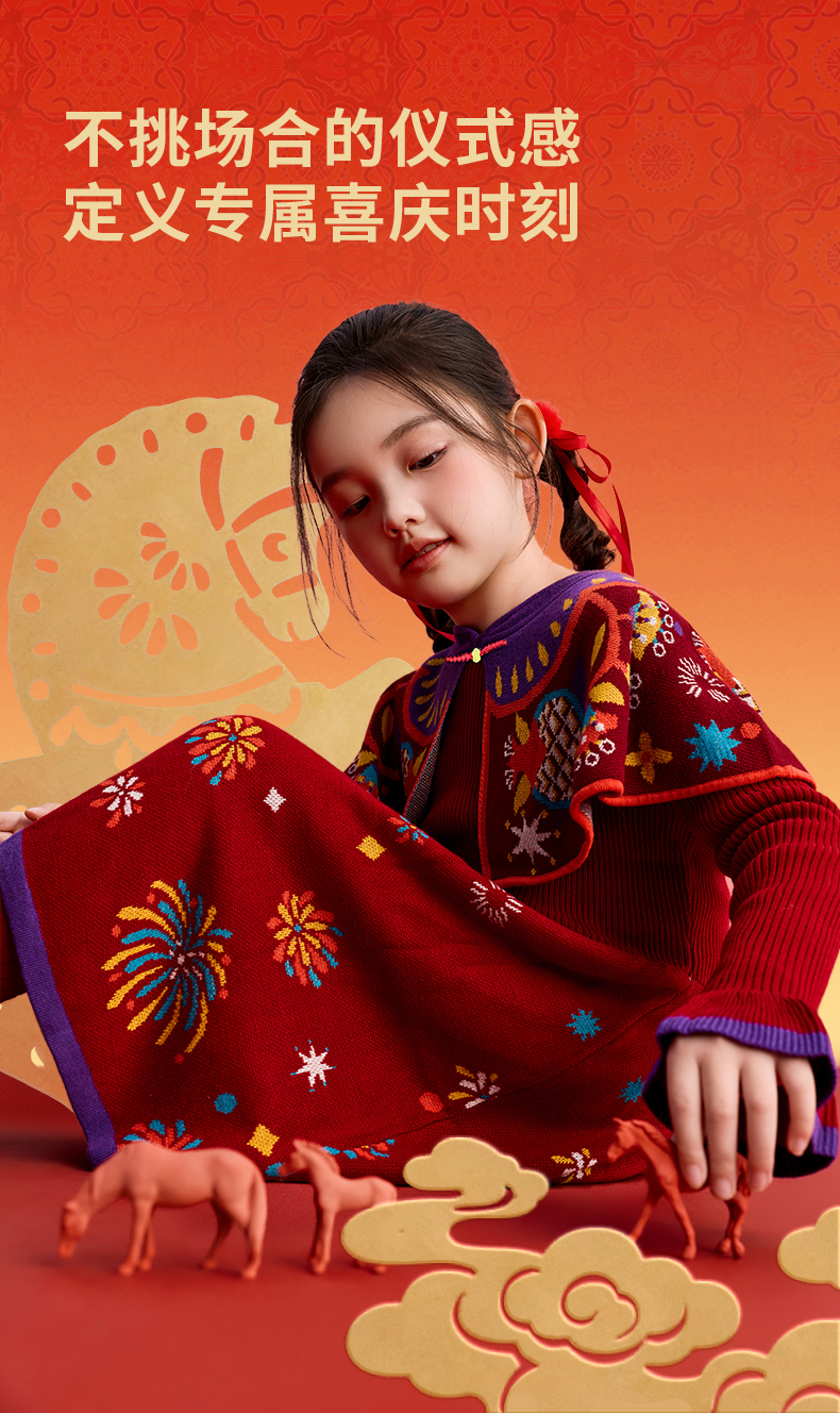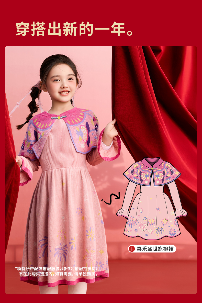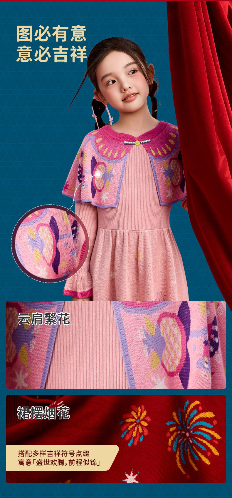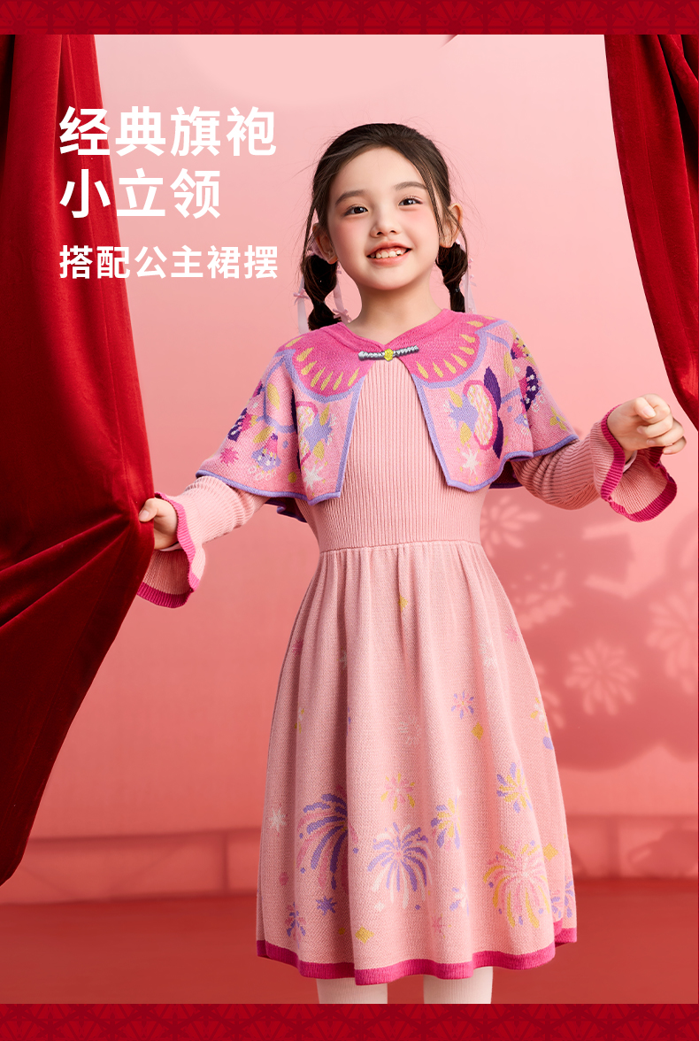 【年衣品牌团】年衣童装女童旗袍裙冬季新款儿童新中式云肩针织喜乐盛世旗袍裙 1207