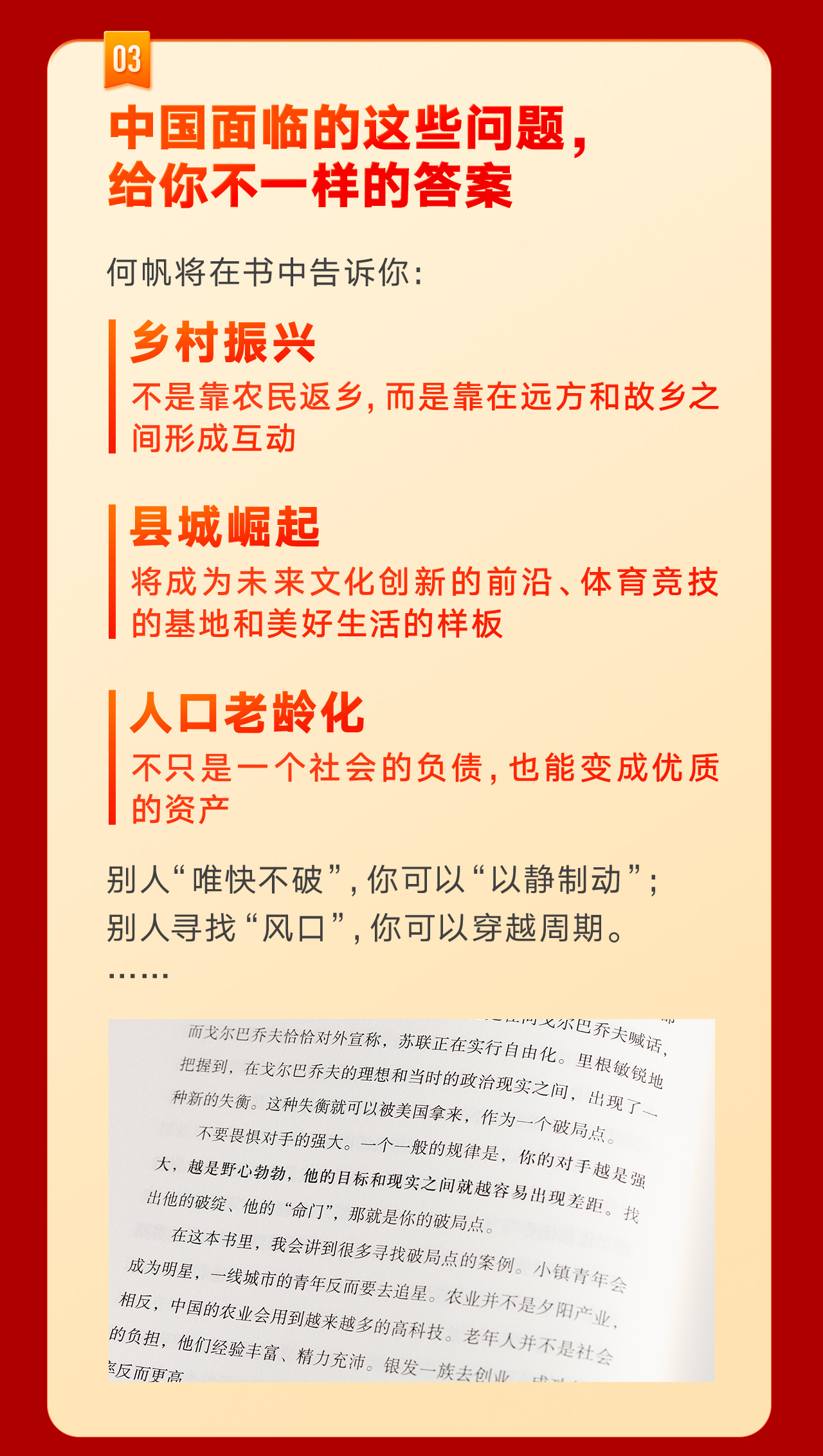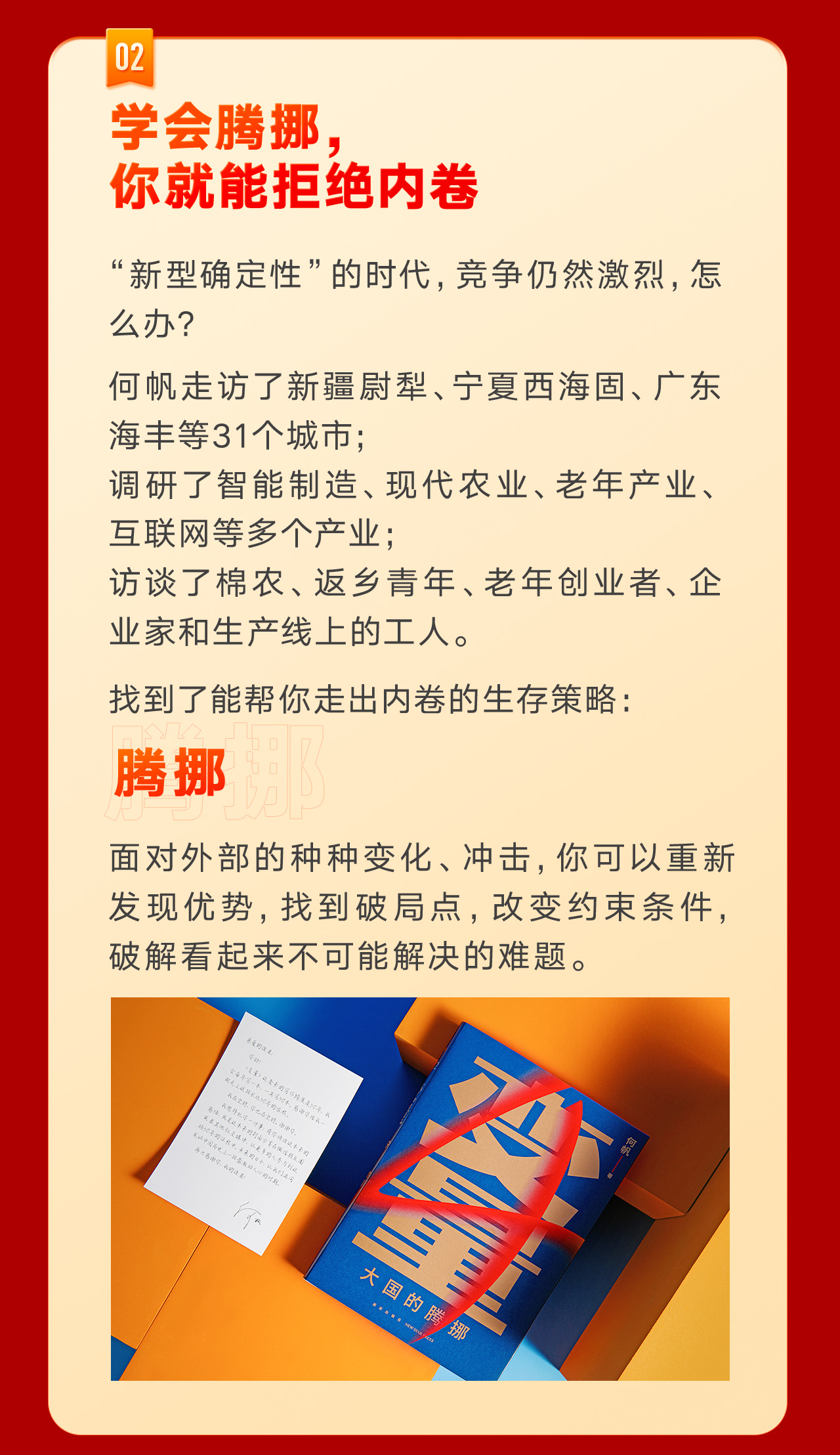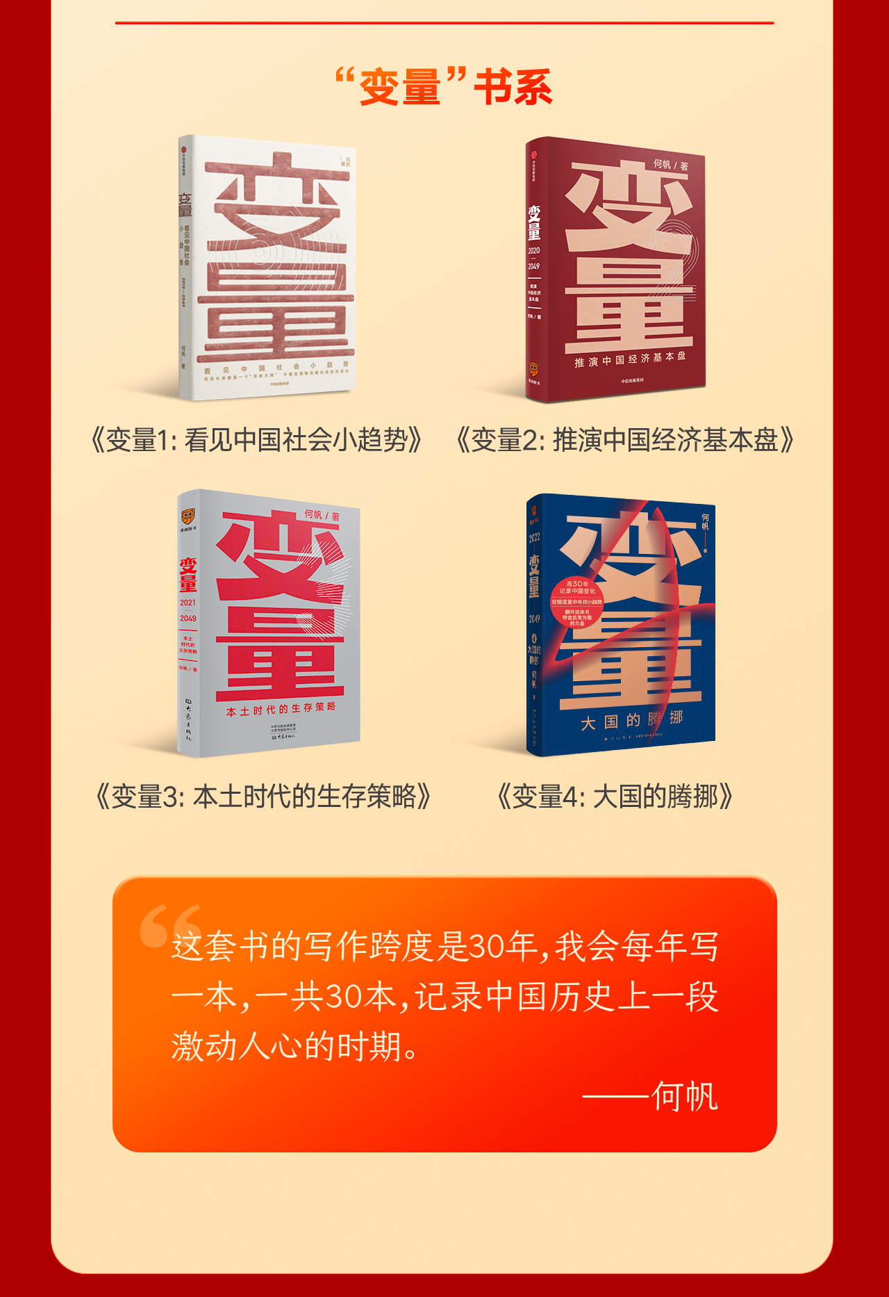 在《变量:大国的腾挪》中,何帆继续他对中国经济形势的记录。他用102天飞行84203公里,走访了新疆尉犁、宁夏西海固、广东海丰等30余个城市,调研了智能制造、现代农业、老年产业、互联网等多个产业,访谈了棉农、返乡青年、老年创业者、企业家和生产线上的工人,找到了能帮你更好地发展的生存策略:腾挪。