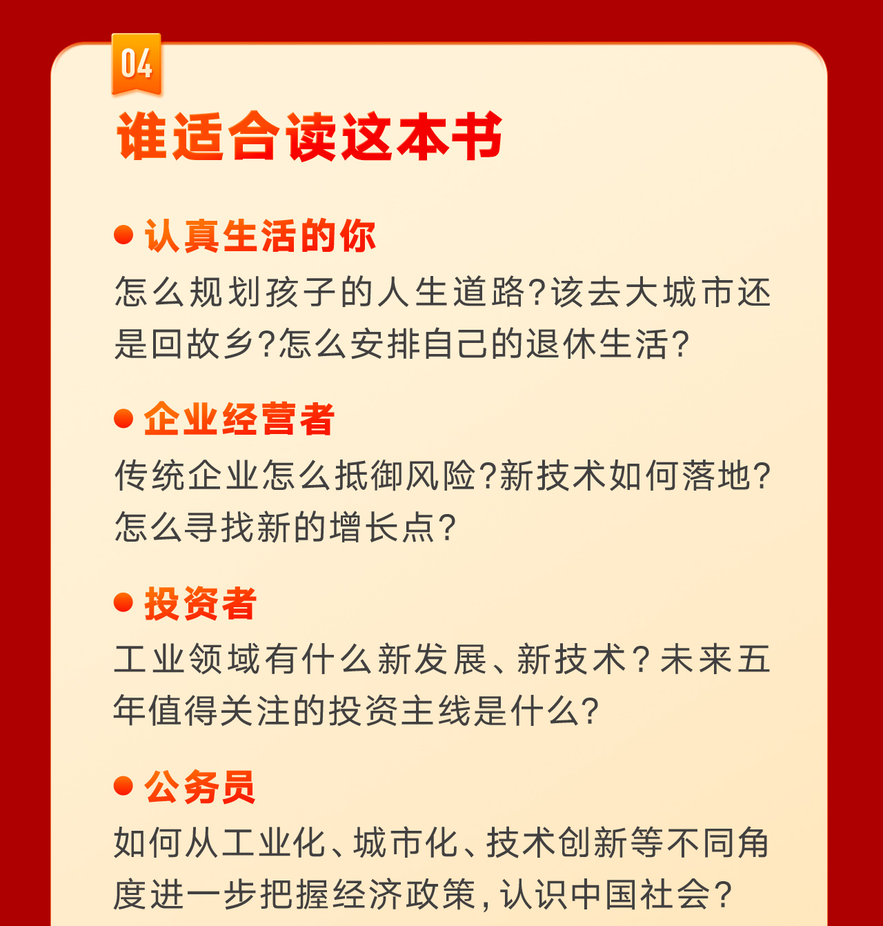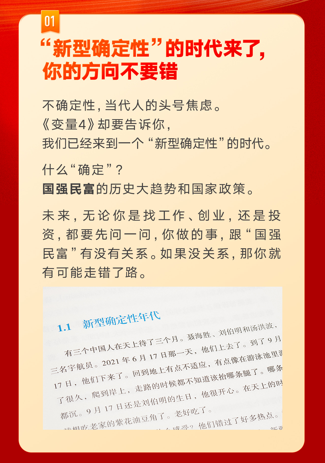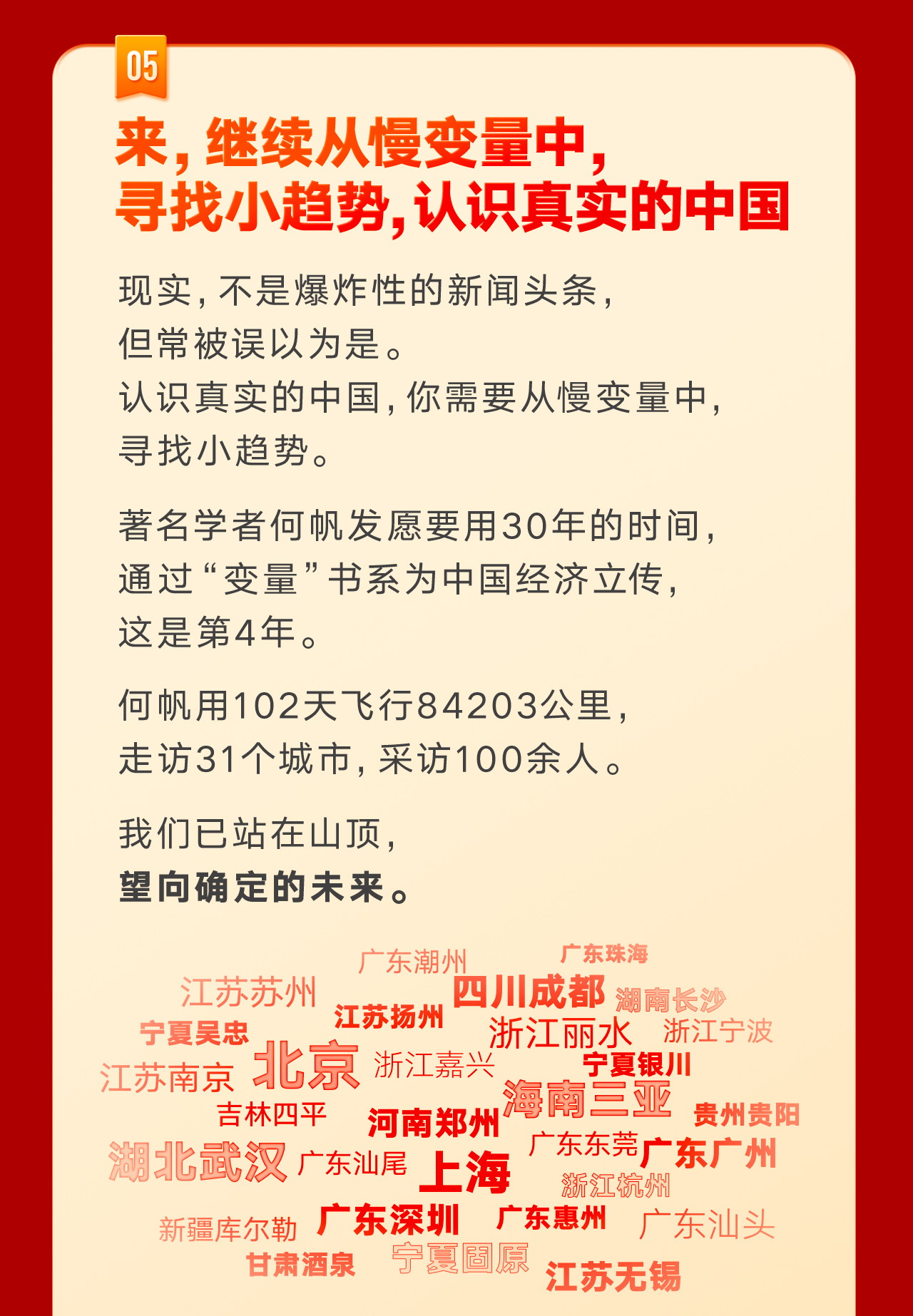 在《变量:大国的腾挪》中,何帆继续他对中国经济形势的记录。他用102天飞行84203公里,走访了新疆尉犁、宁夏西海固、广东海丰等30余个城市,调研了智能制造、现代农业、老年产业、互联网等多个产业,访谈了棉农、返乡青年、老年创业者、企业家和生产线上的工人,找到了能帮你更好地发展的生存策略:腾挪。
