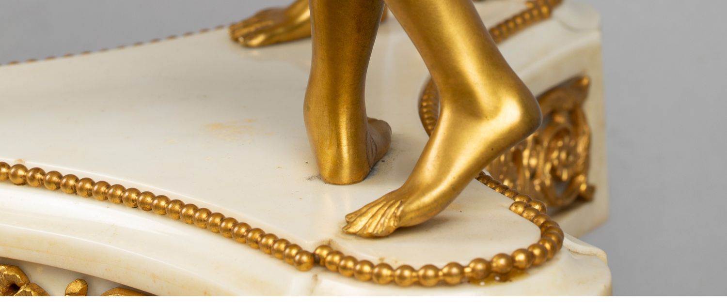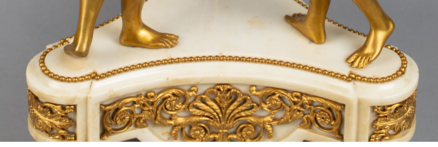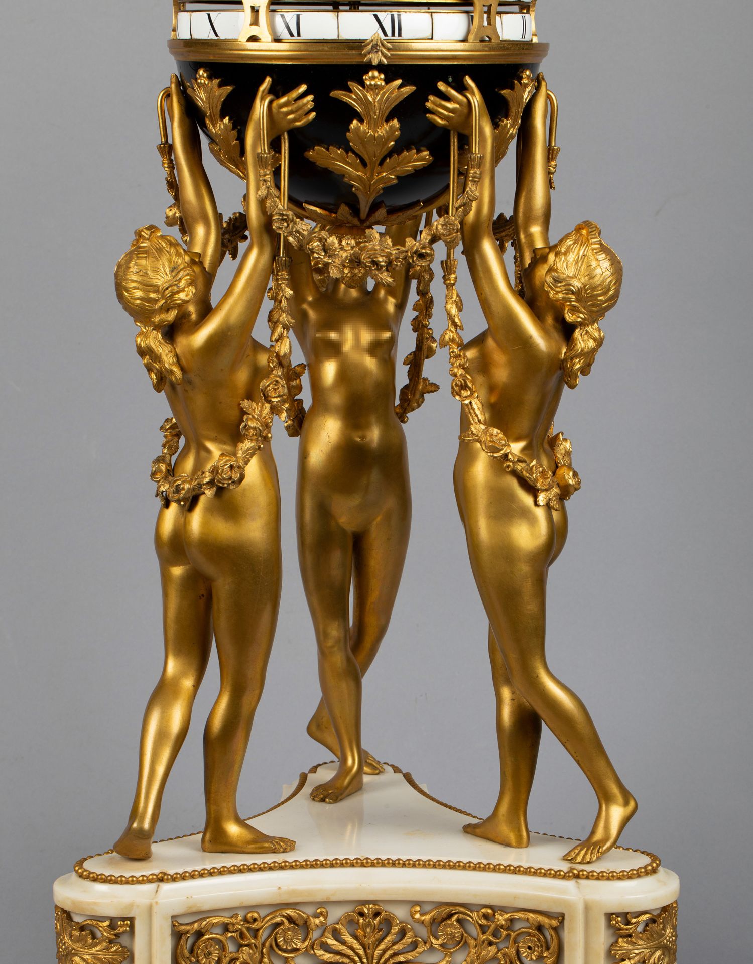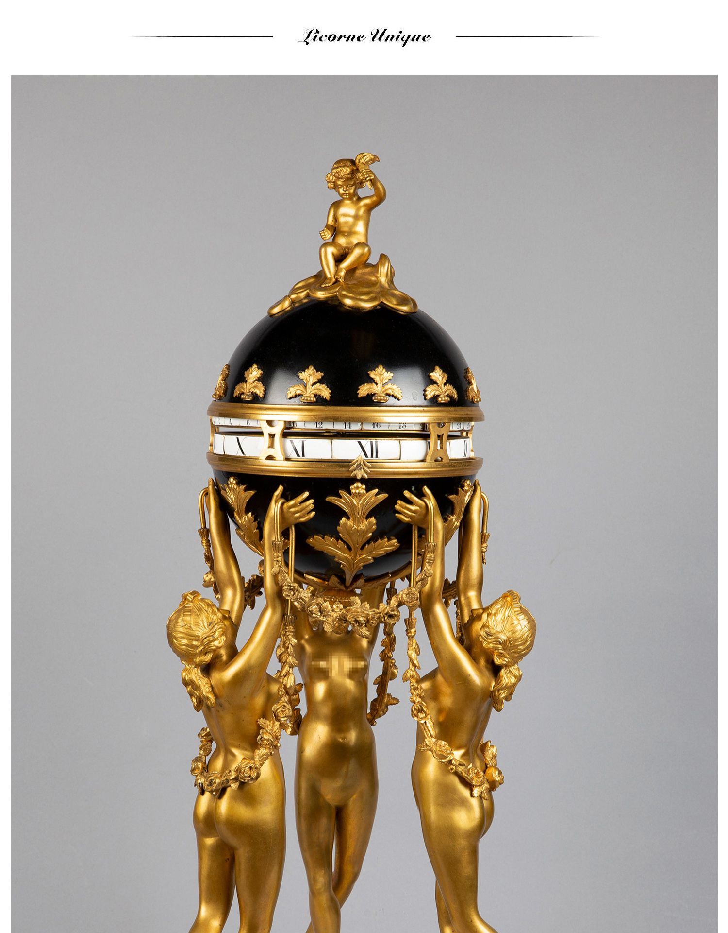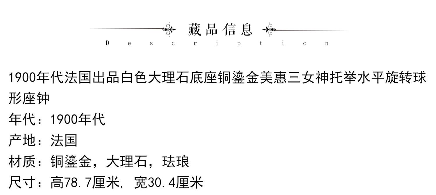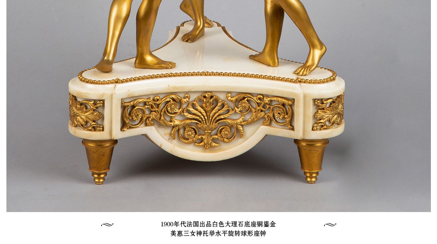 独角鹿西洋古董白色大理石铜鎏金美惠三女神托举水平旋转球形座钟