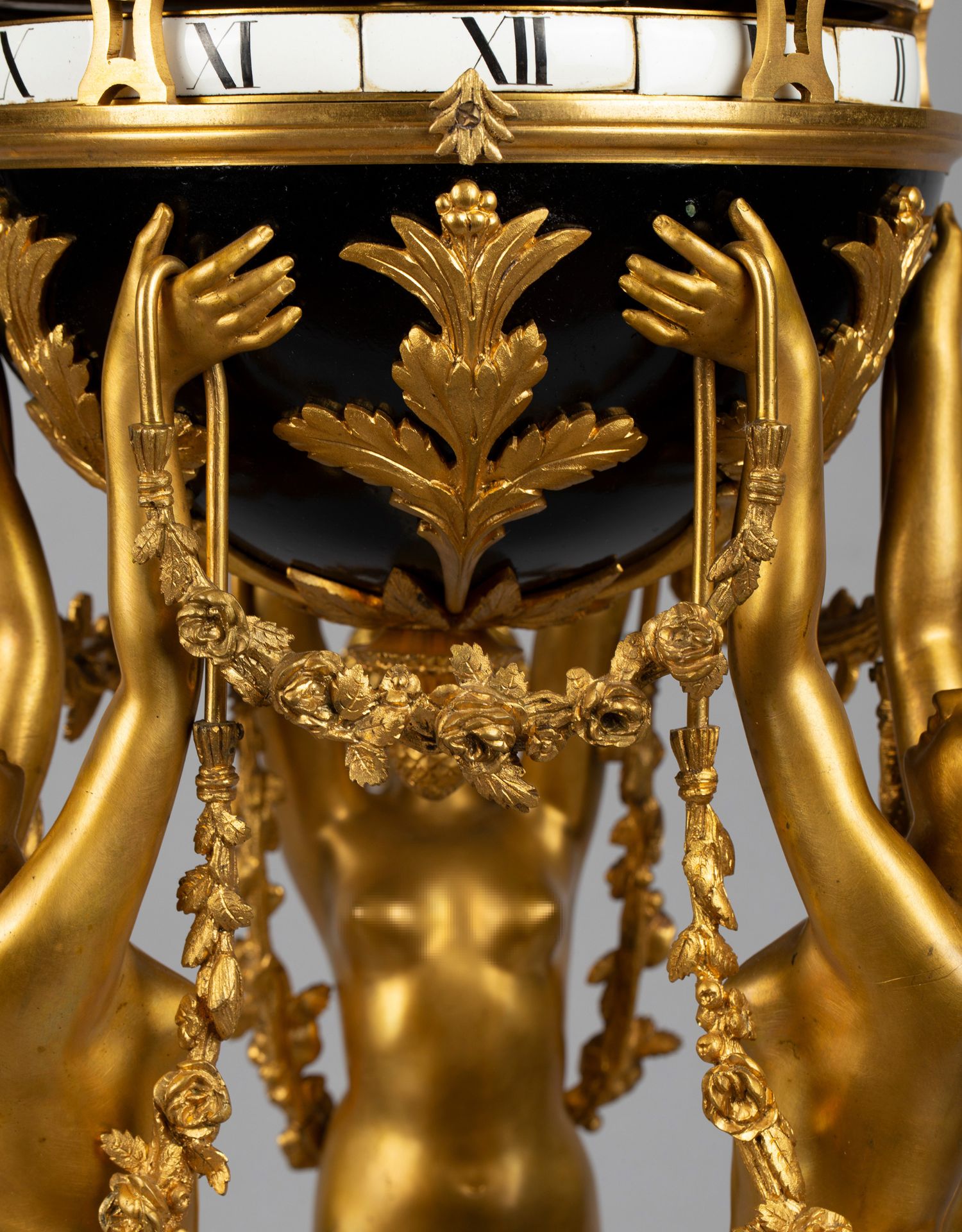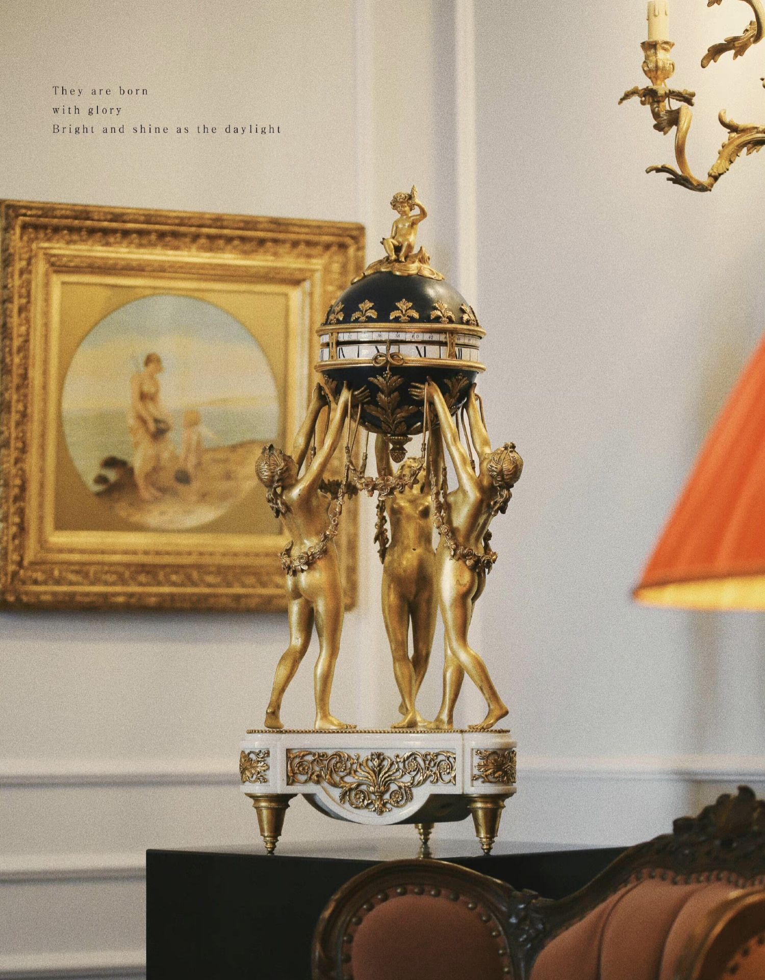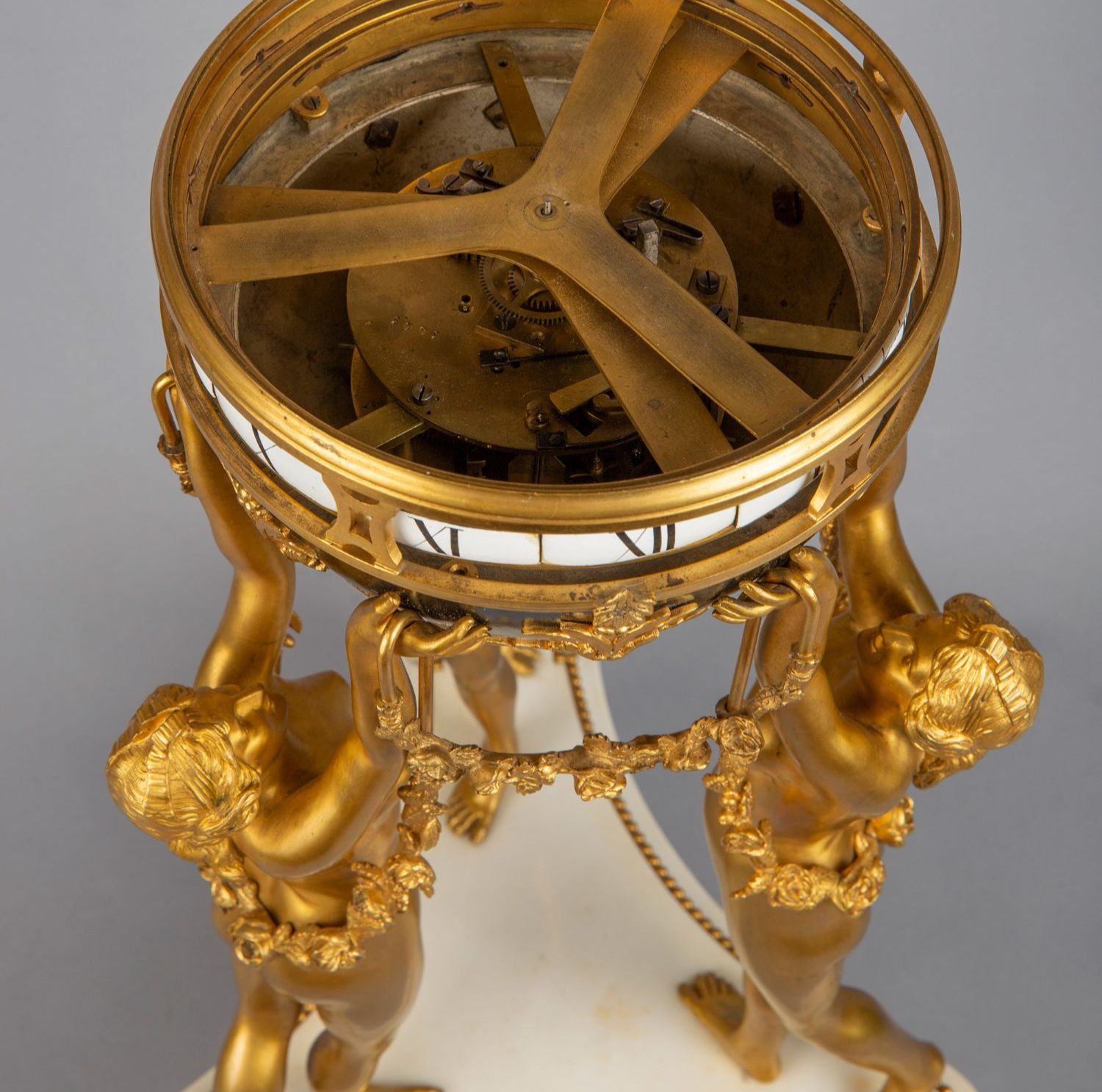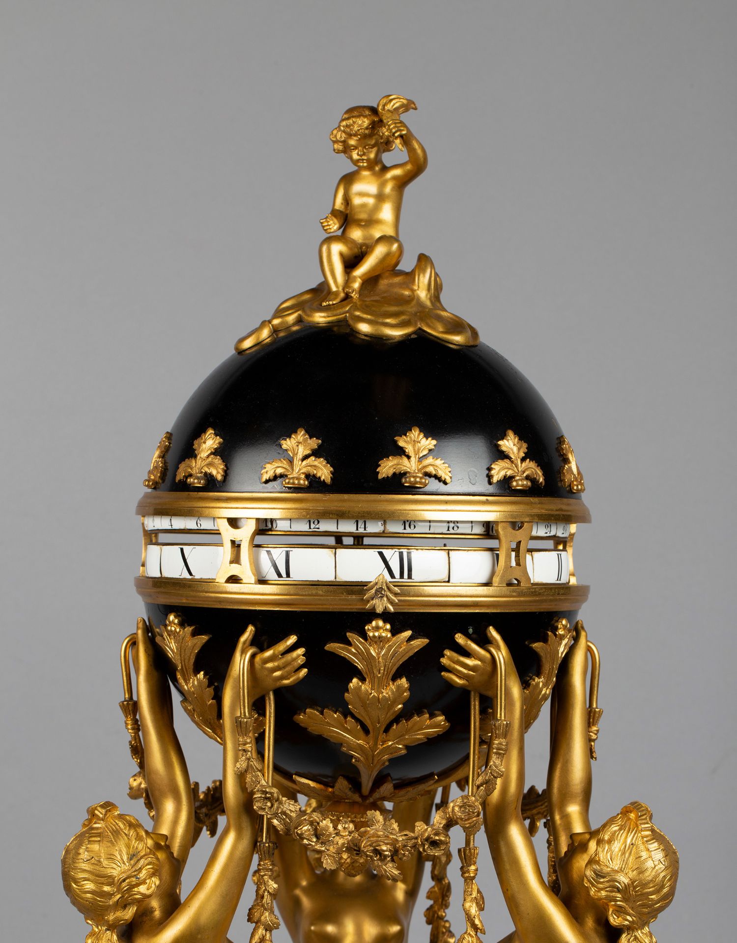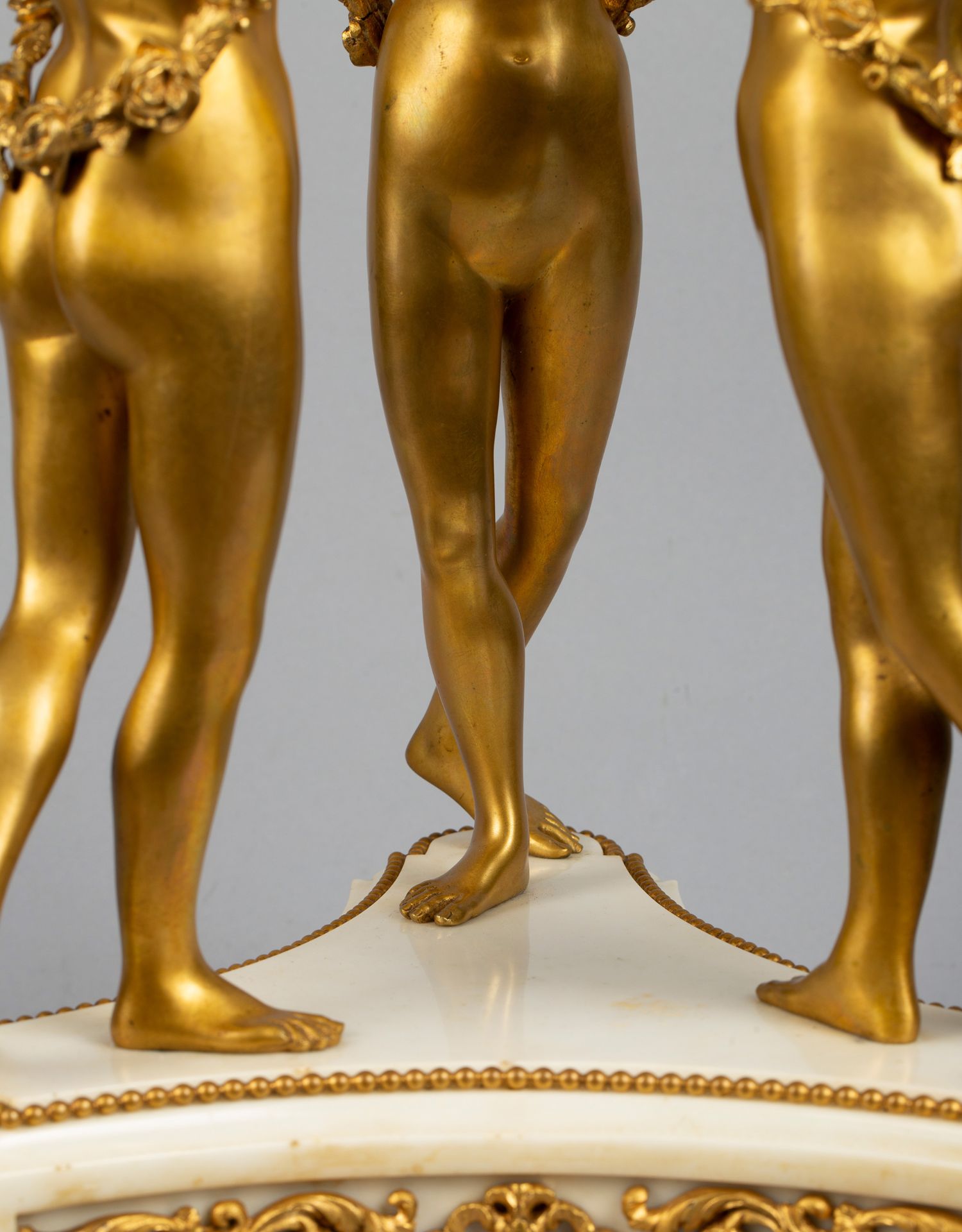 独角鹿西洋古董白色大理石铜鎏金美惠三女神托举水平旋转球形座钟