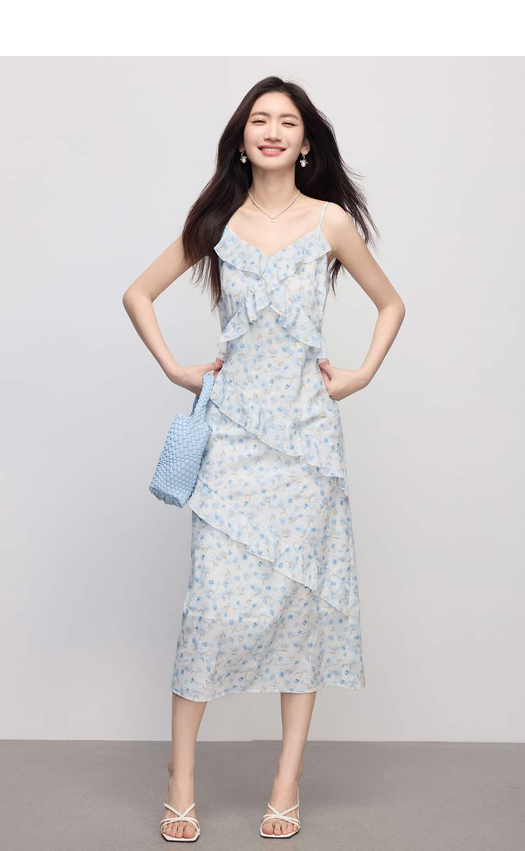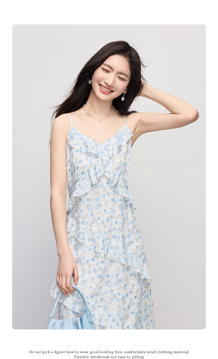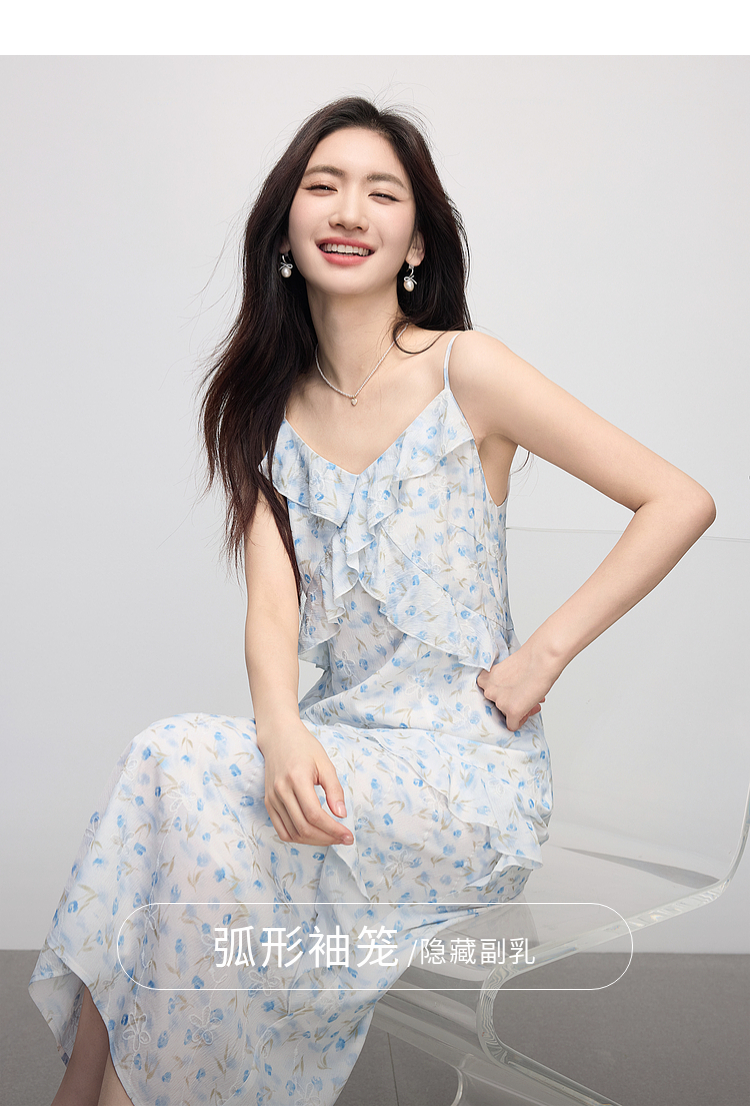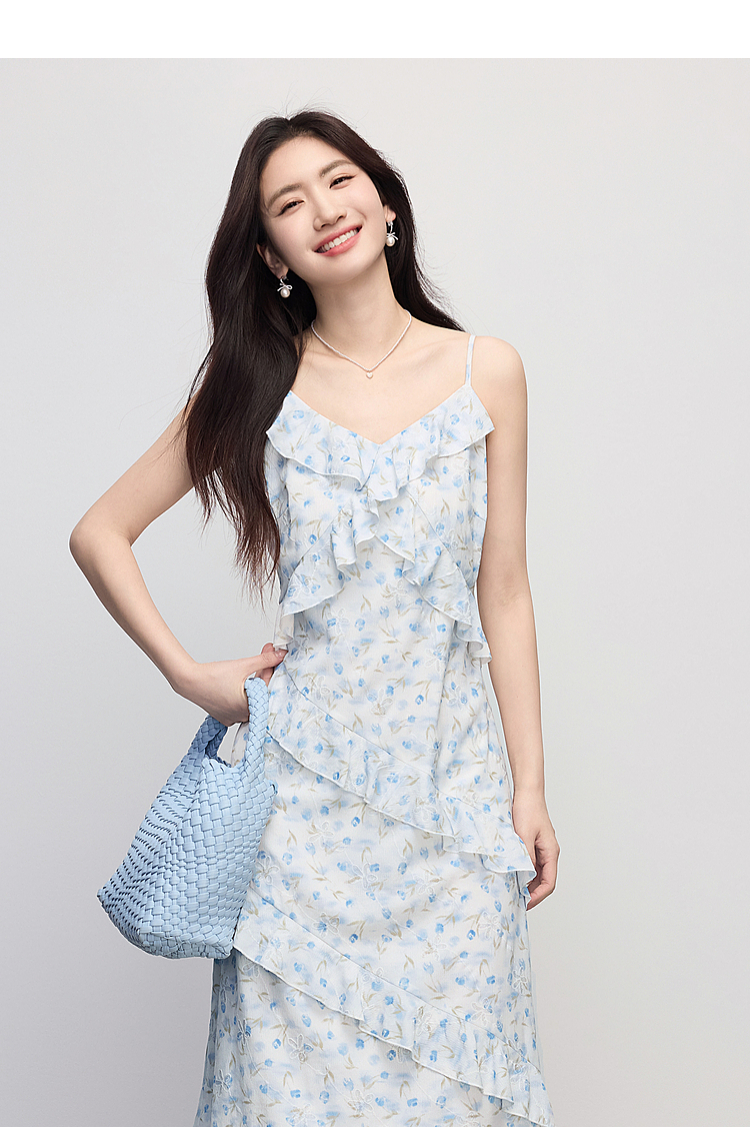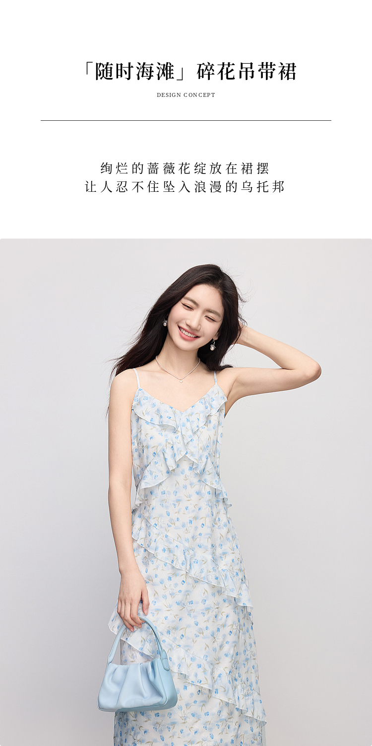 【周末秒杀】熙世界法式碎花吊带连衣裙2025夏日新款荷叶边度假风海边沙滩裙