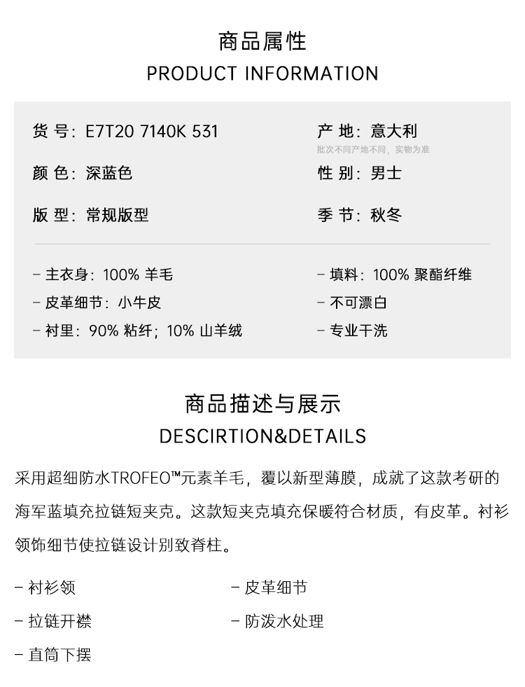 ZEGNA 杰尼亚 男士 Trofeo™ Elements 羊毛填充拉链棉服 深蓝色 E7T20 7140K 531