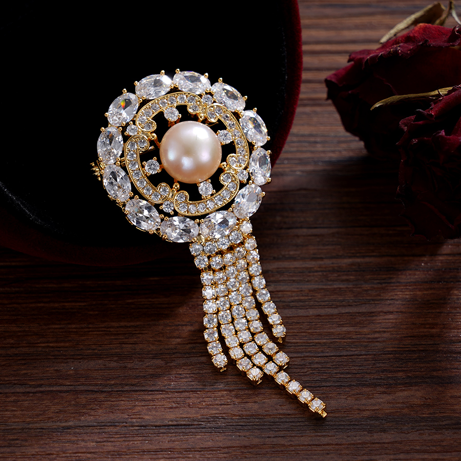 【寓意】:胸针锆石环绕密嵌,精致层叠,璀璨优雅。中心镶嵌珍珠,温润大气,华丽动人。专属于女性的“勋章”,寓意绽放自信芳华。