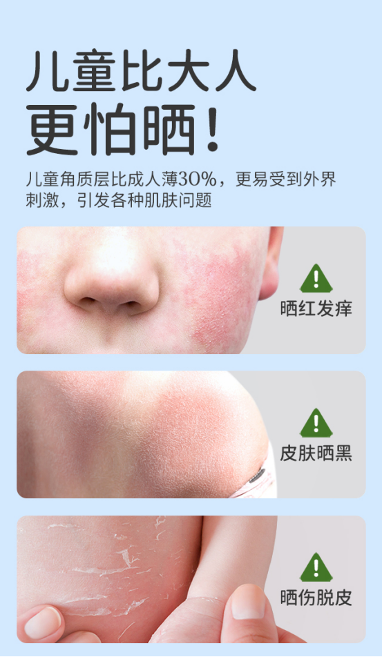✅儿童比大人更怕晒 宝宝的肌肤娇嫩,角质层比成人薄30%,夏天更易受到外界刺激,引发各种肌肤问题,导致皮肤总是红烫烫的,甚至会晒黑晒伤