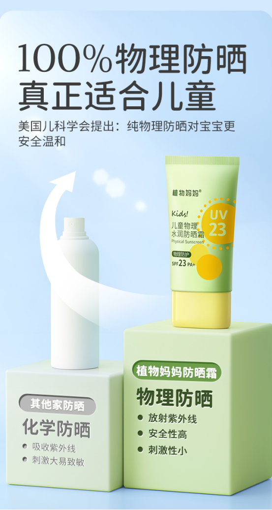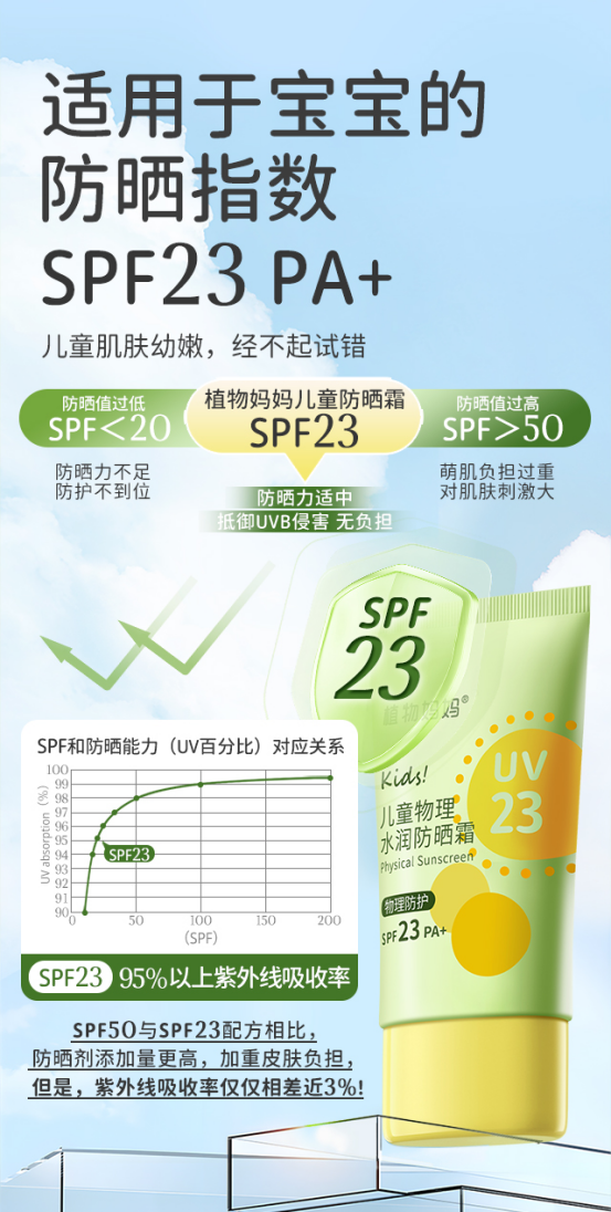 ✅更适用于宝宝的防晒指数SPF23PA+ 儿童肌肤幼嫩,经不起试错。 防晒值过低(SPF<20,)防晒力不足防护不到位;防晒值过高(SPF>50) 负担过重,对宝宝肌肤刺激大。 植物妈妈儿童防晒霜SPF23,防晒力适中,抵御UVB侵害扥同时对宝宝的肌肤无负担