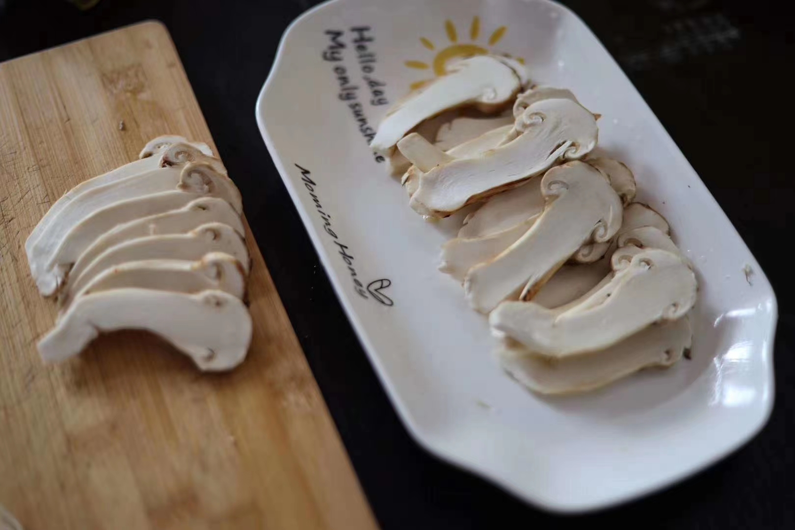 切厚片,在锅里放少点油,等松茸水份干了,起锅冻起。这些松茸,放在冰箱里,可以吃一年。在以前那个物质馈乏的年代,时时能吃到鲜松茸片,是多么幸福的一件事。