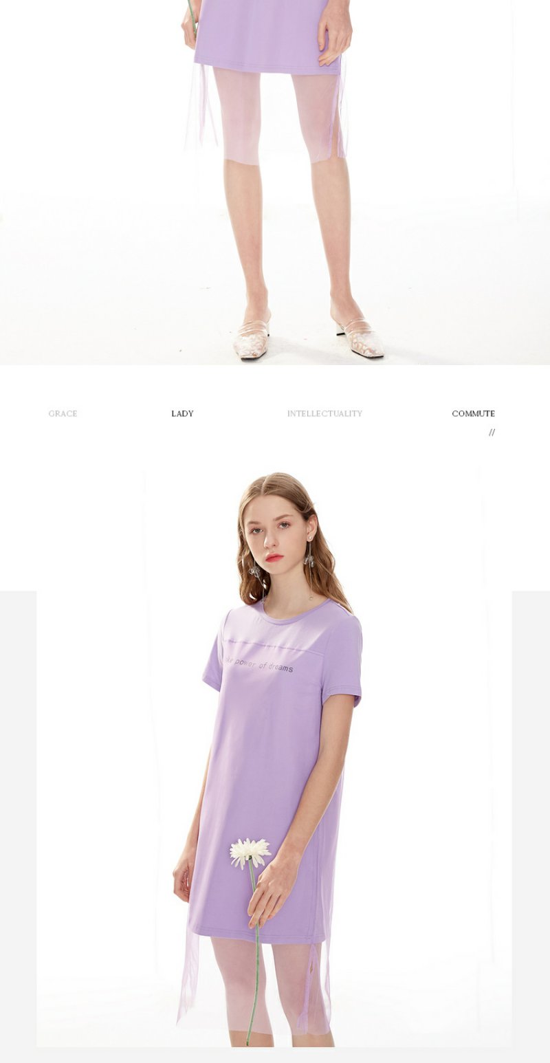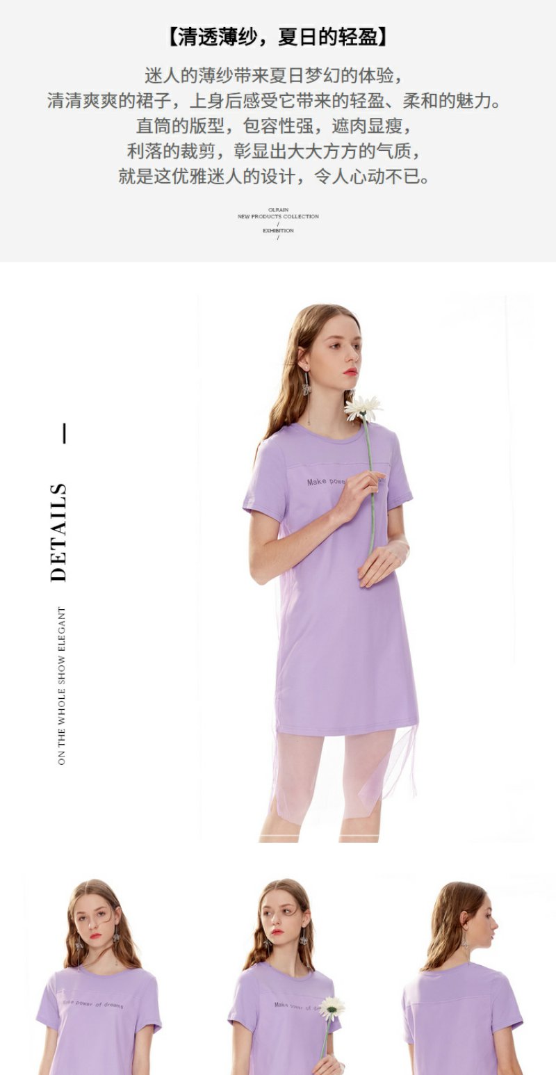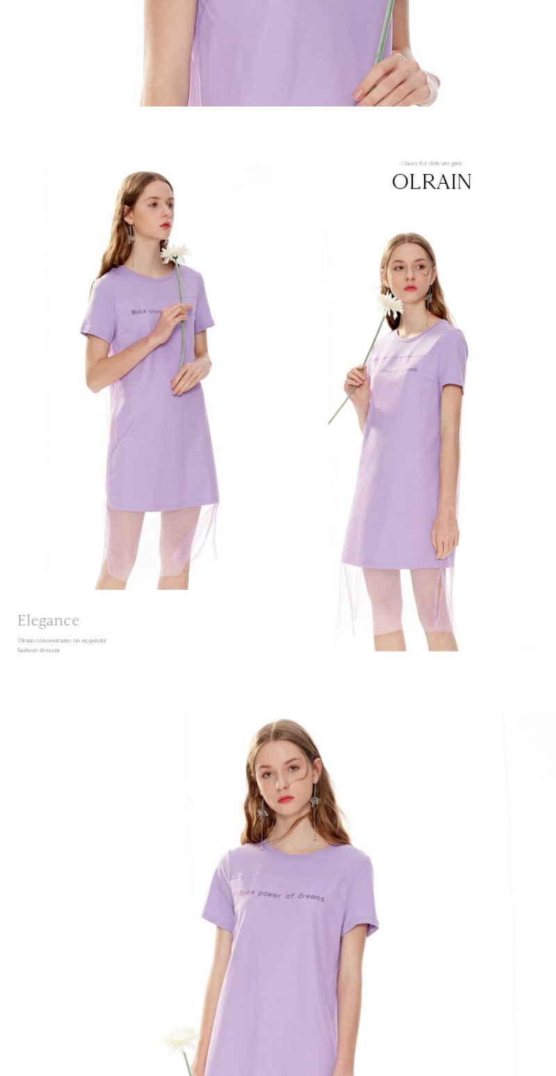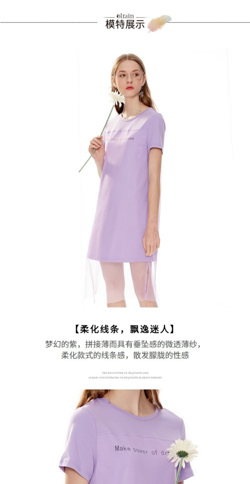 欧芮儿夏装女装字母印花t恤连衣裙女中长款拼接网纱女裙