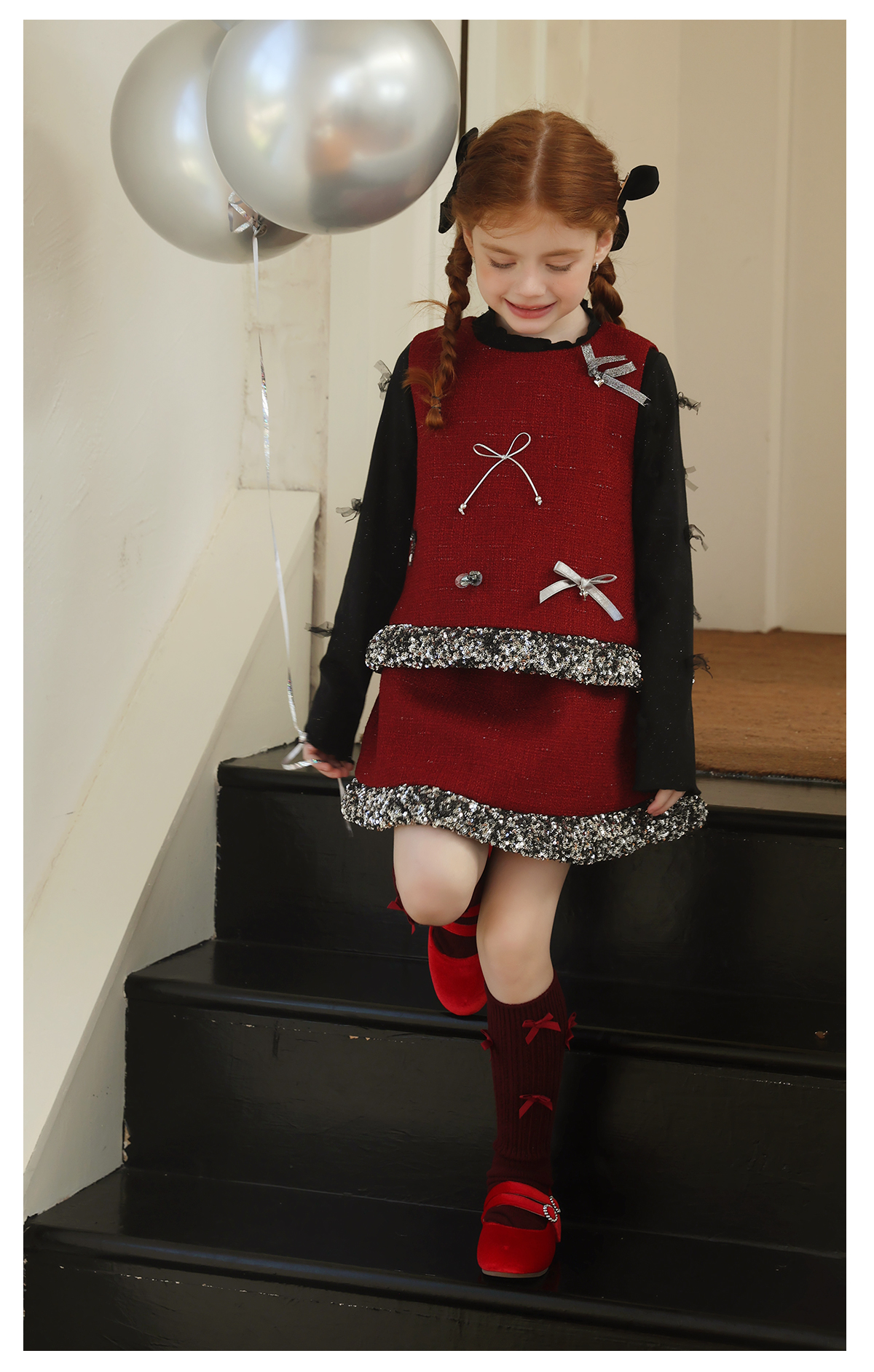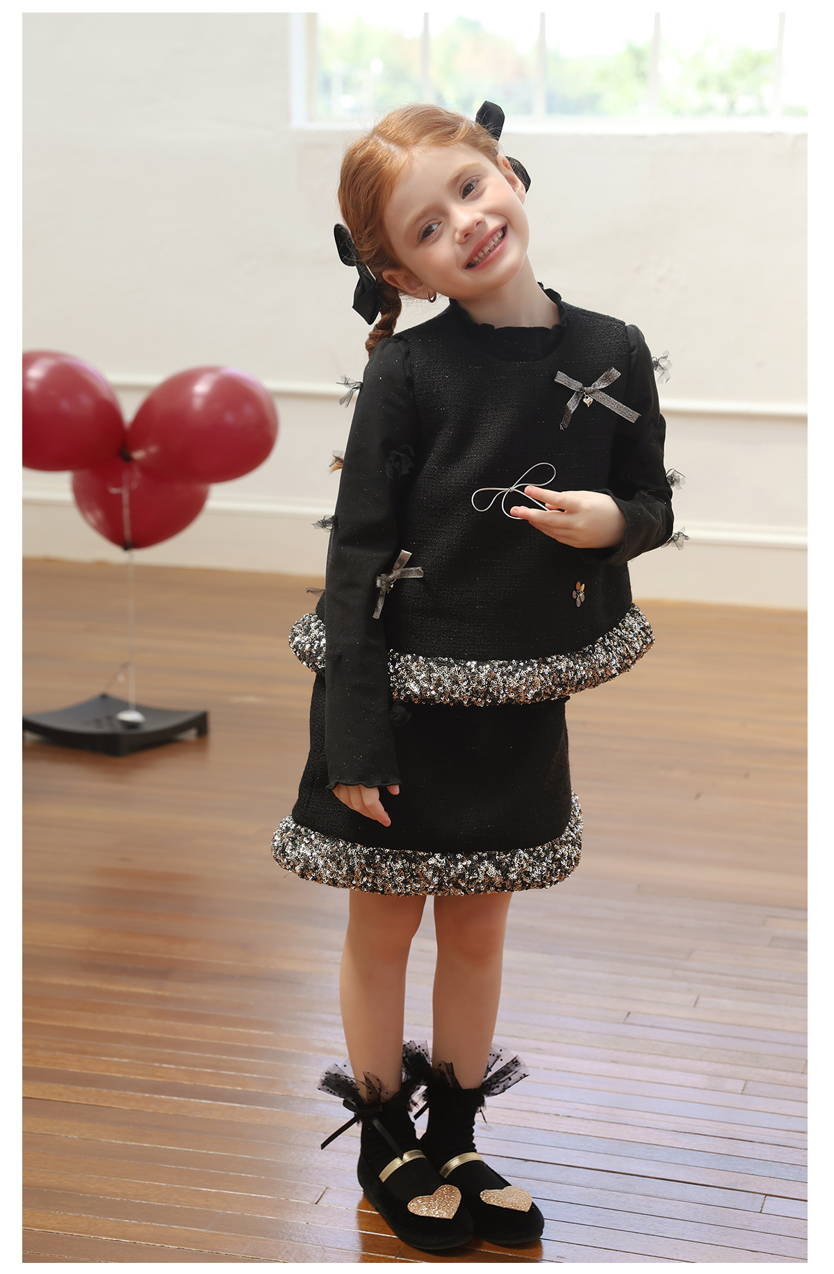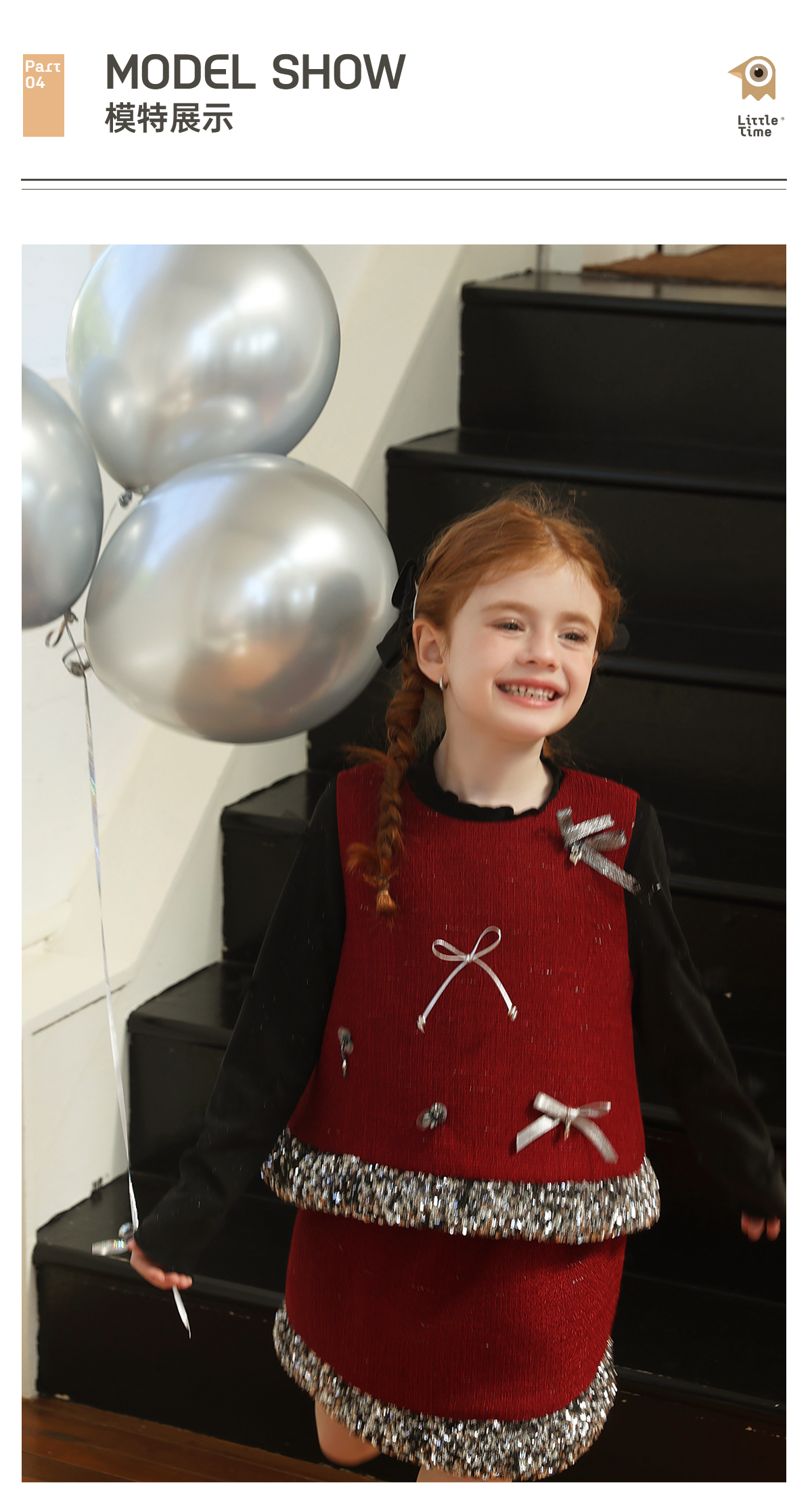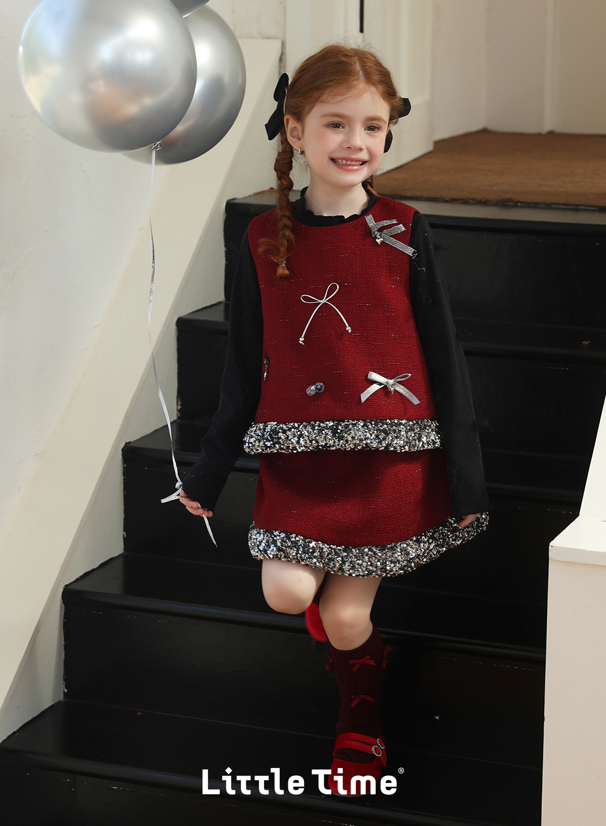 littletime女童套装2025学院风亮片领口针织开衫红色新年套装
