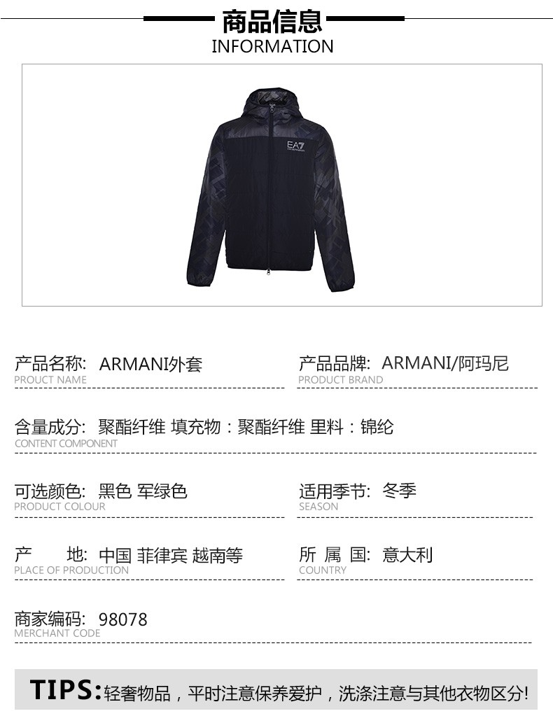阿玛尼(Emporio Armani)男装 男士休闲运动长袖连帽外套 98078