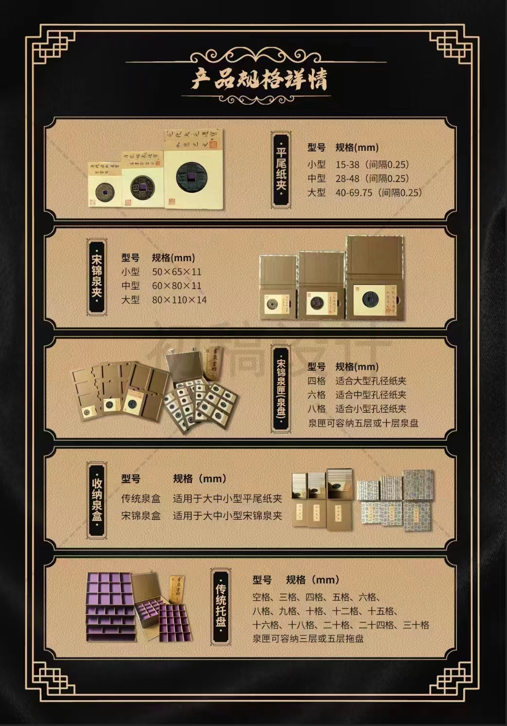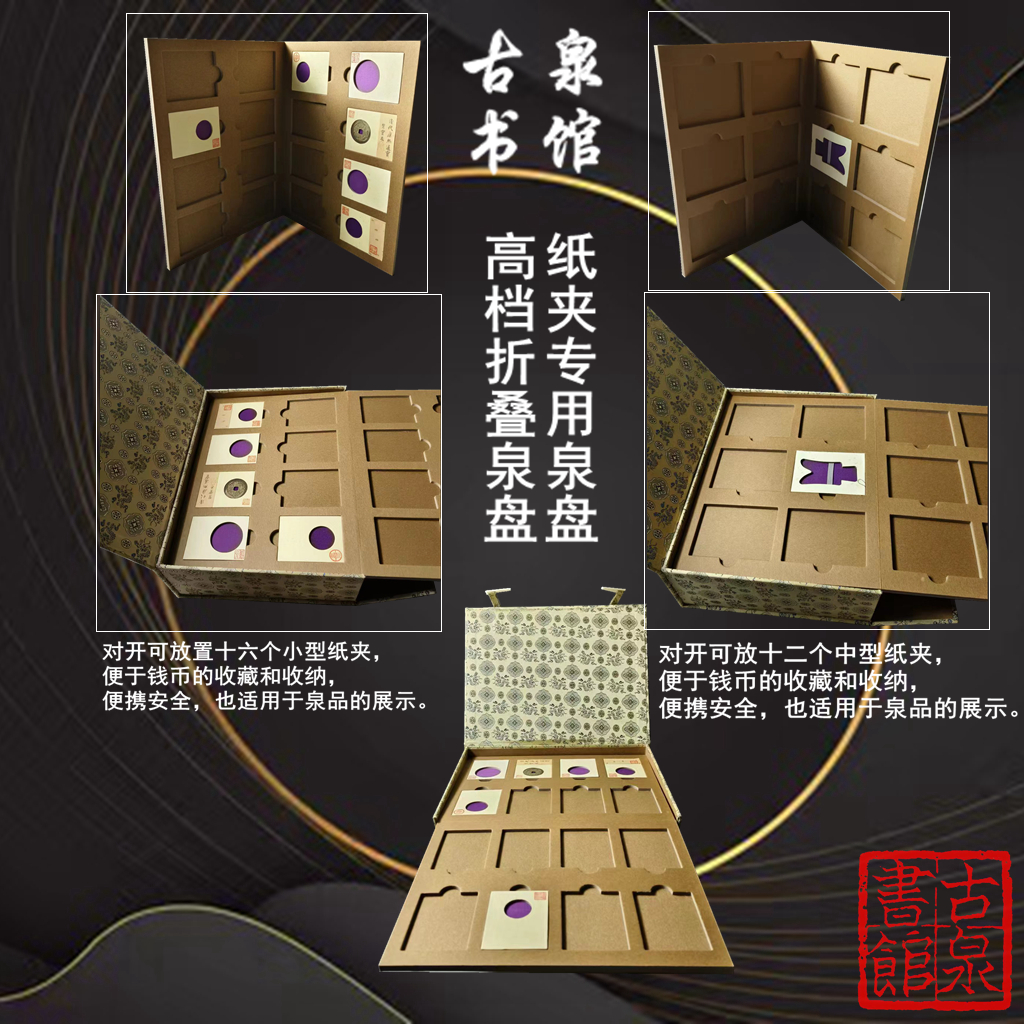 十二格泉盘:对开可放十二个中型纸夹,便于钱币的收藏和收纳,便携安全,也适用于泉品的展示。 外尺寸宽195mm长255mm厚13mm