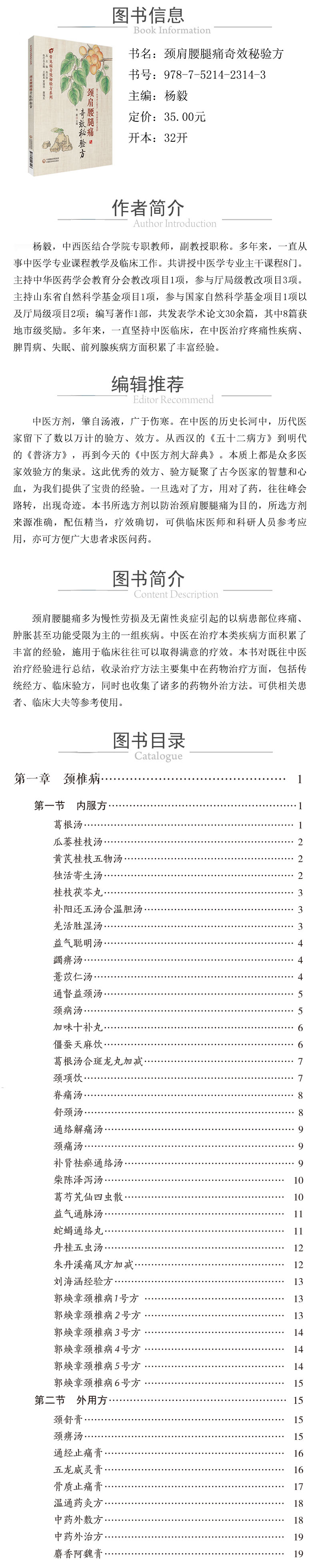 颈肩腰腿痛多为慢性劳损及无菌性炎症引起的以病患部位疼痛、肿胀甚至功能受限为主的一组疾病。中医在治疗本类疾病方面积累了丰富的经验,施用于临床往往可以取得满意的疗效。本书对既往中医治疗经验进行总结,收录治疗方法主要集中在药物治疗方面,包括传统经方、临床验方,同时也收集了诸多的药物外治方法。可供相关患者、临床大夫等参考使用。
