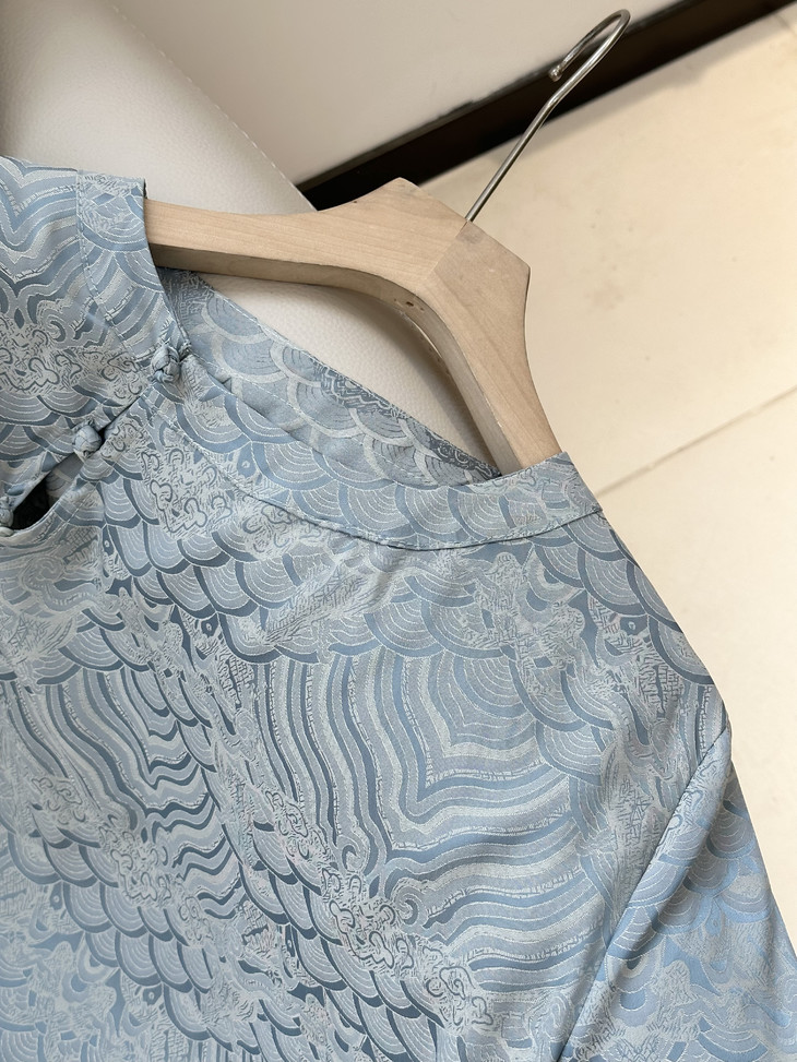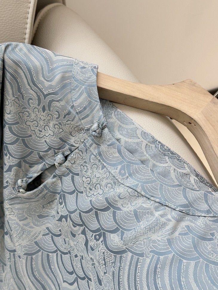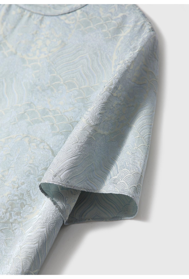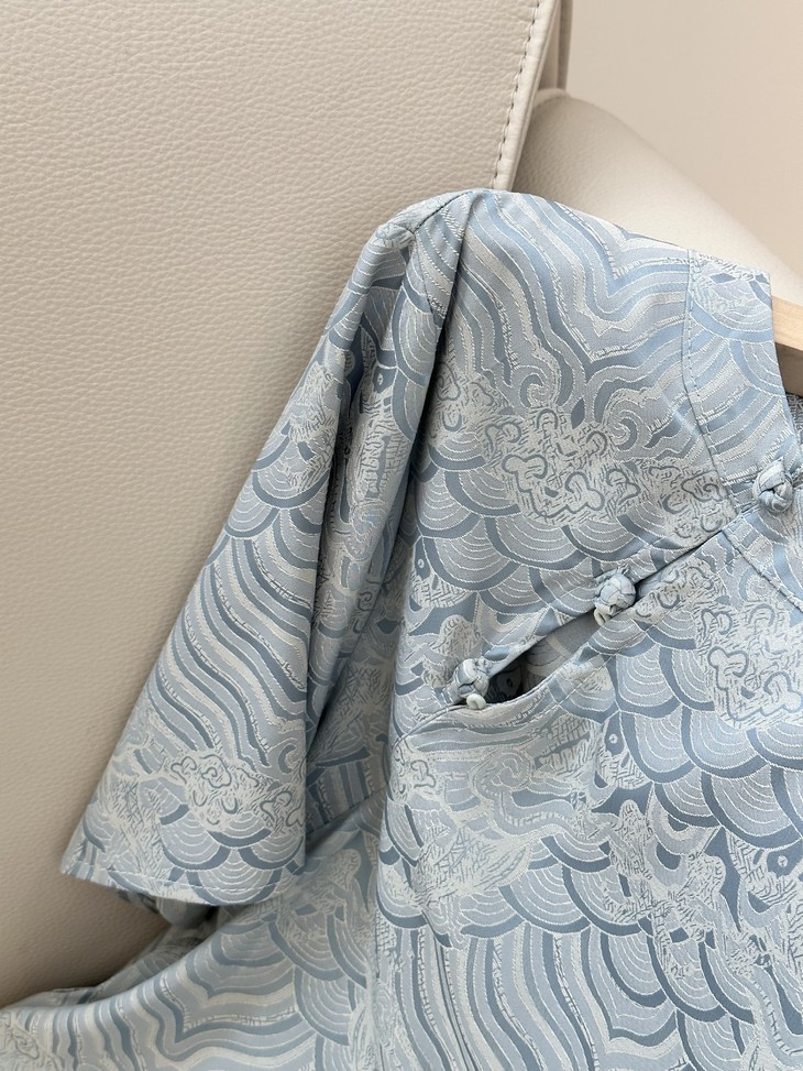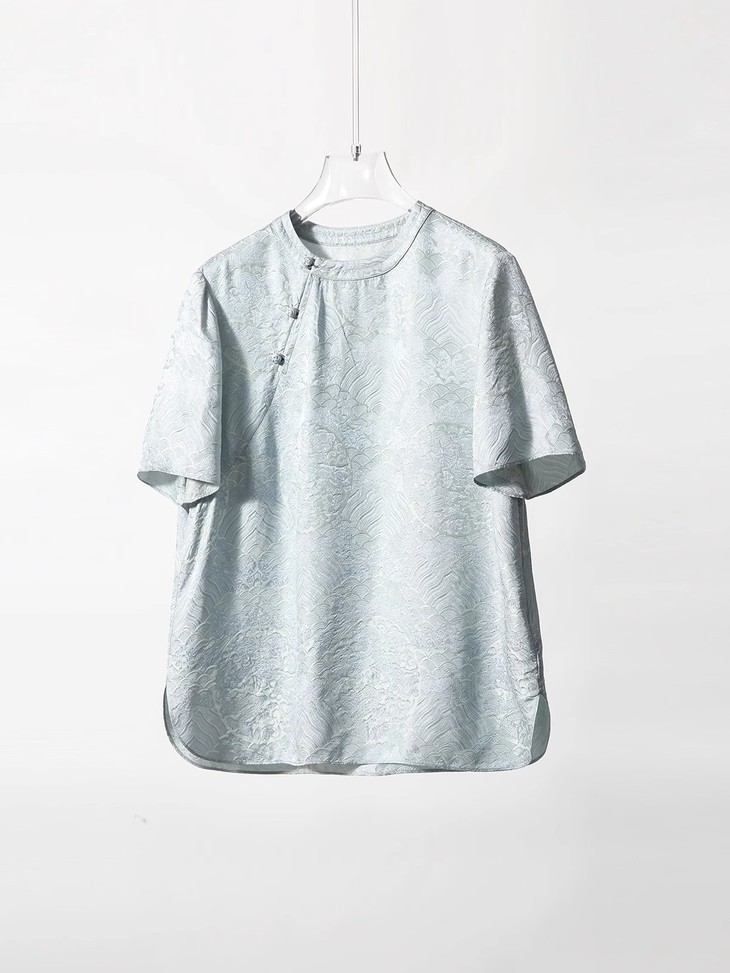 【新中式提花斜襟盘扣冰蓝色短袖】 ✅祥瑞的提花图案+斜襟盘扣精致又典雅 ✅宽松版型,对身材包容高 ✅经过设计师精挑细选,剪裁大气,做工精细 ✅边角走线平整,足见做工用心